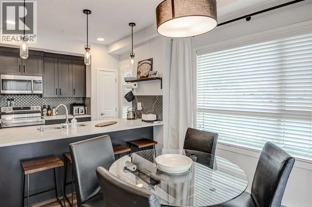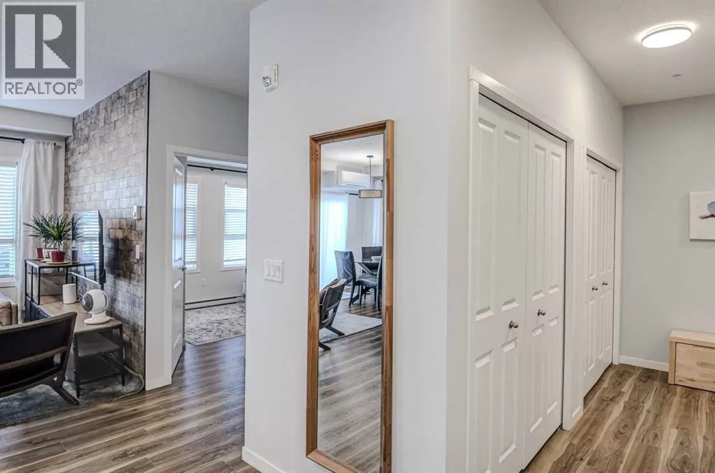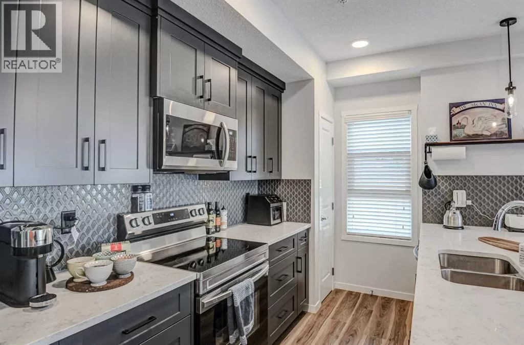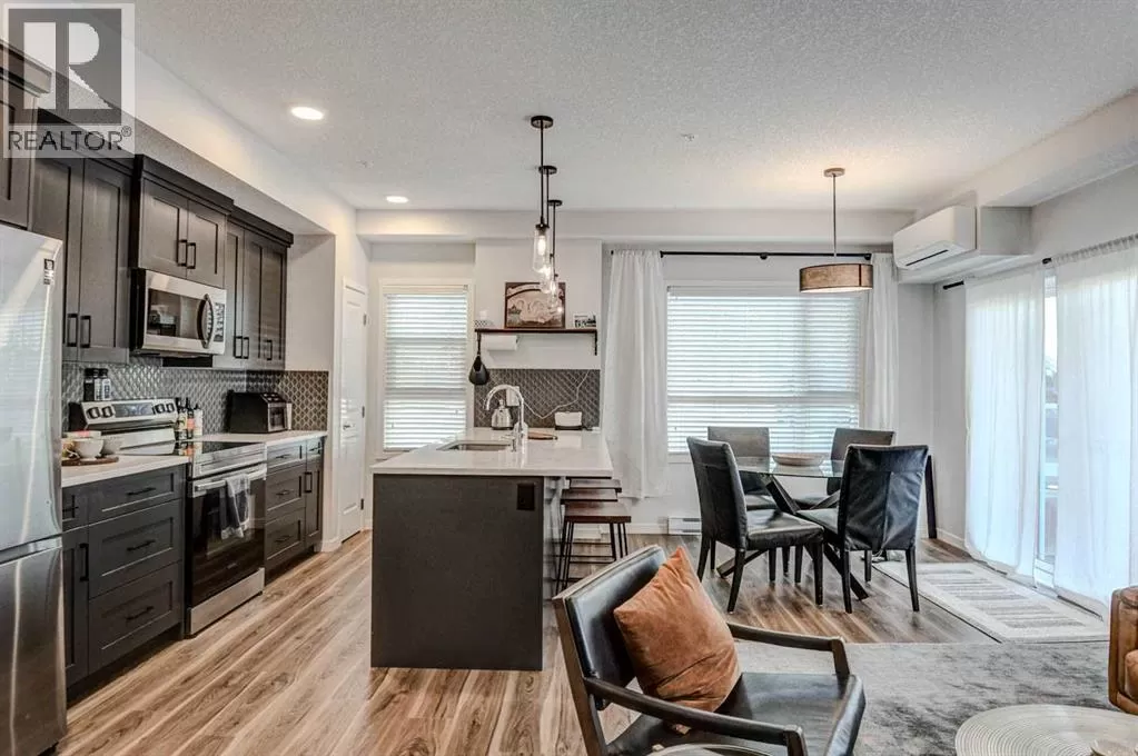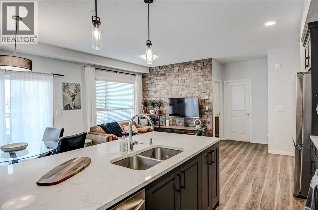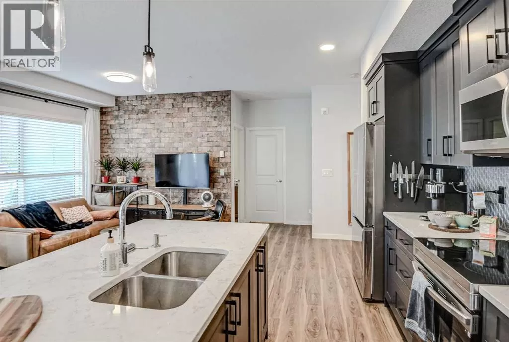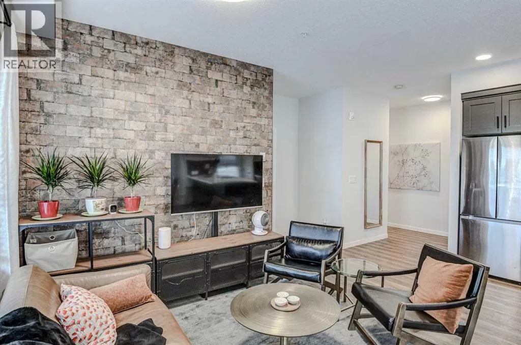 Prepare to be captivated by this stunning end unit, corner ground floor with 2-bed and 2-bath in Seton. Former show suite by Cedarglen Homes, boast high end finishes , modern layout and upgrades. The open & spacious living room includes a chic Chicago brick feature wall and a large low E triple glazed window. Open concept layout that seamlessly combine style and functionality. Comfort is ensured with zoned electric baseboard heating and a Fresh Air System (ERV) . The luxury vinyl plank flooring is all the way through for fast & easy cleaning. No carpet here. The primary suite is spacious with a double vanity ensuite and a walk-in closet. The other good sized bedroom provides access to a full 4-pc bathroom. Step through the kitchen which boast quartz countertops, stainless steel appliances and ample storage within the ceiling-height melamine cabinets. This stylish unit also comes in with an ensuite laundry, titled underground parking and a huge private concrete patio with a gas line for your BBQ. It is also a pet friendly complex (Board approval) up to 40 kilograms. A low- maintenance living- allowing you more free time to enjoy what you love. Perfect for Seniors, Professionals, Young couples, Students, First time home owner or to investors.. This complex is just a walking distance to South Campos Hospital, YMCA, school, shops, restaurant and other amenities.. It is also an easy access to Stoney Trail and Deerfoot Trail.... Please note that the seller is willing to negotiate on any of the contents in the unit. (id:27476)