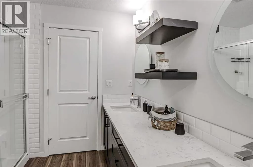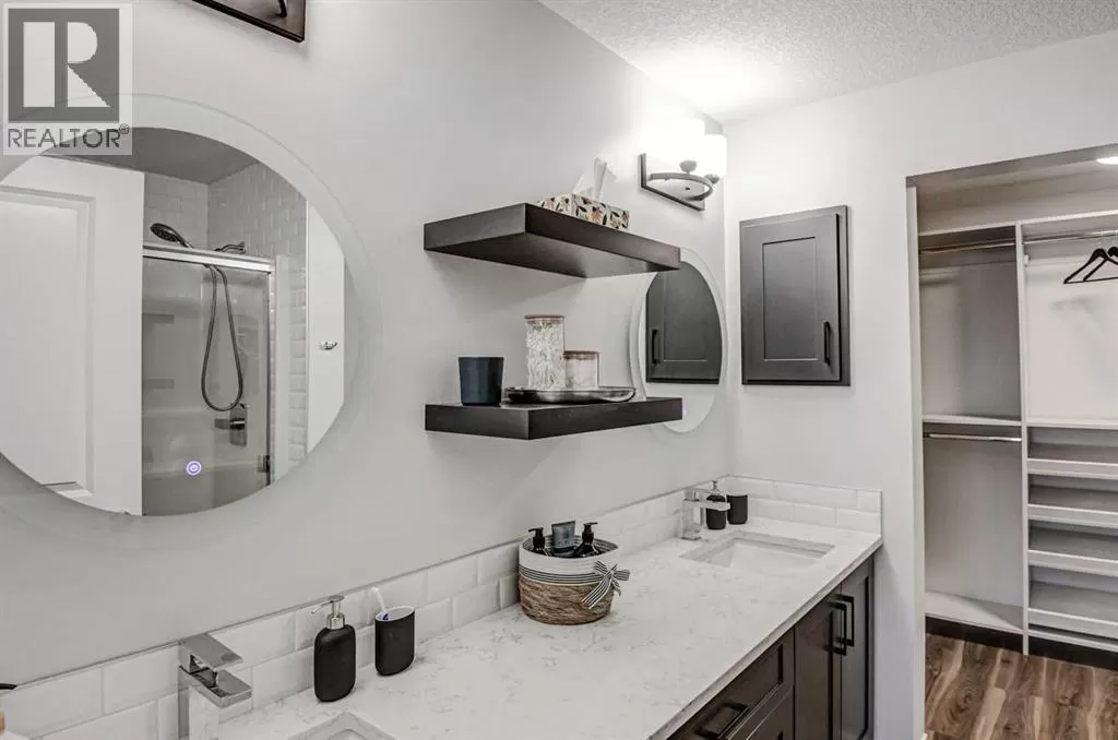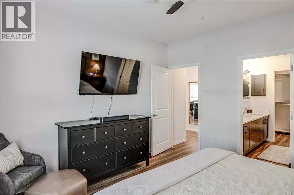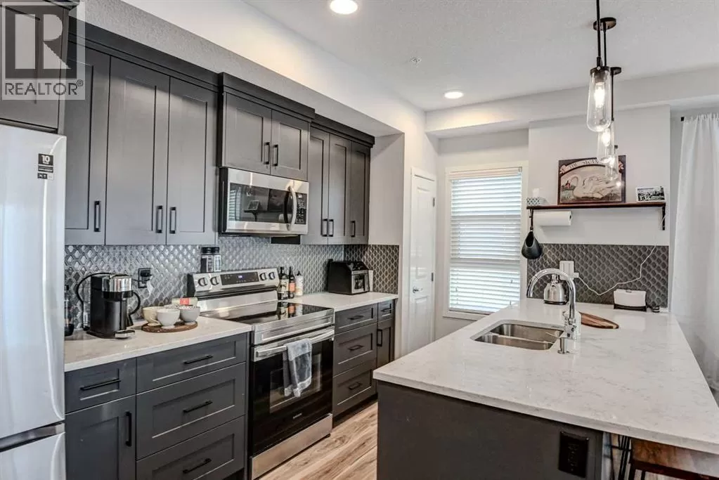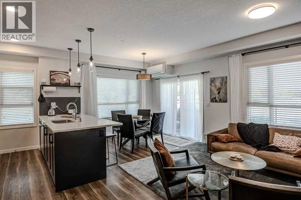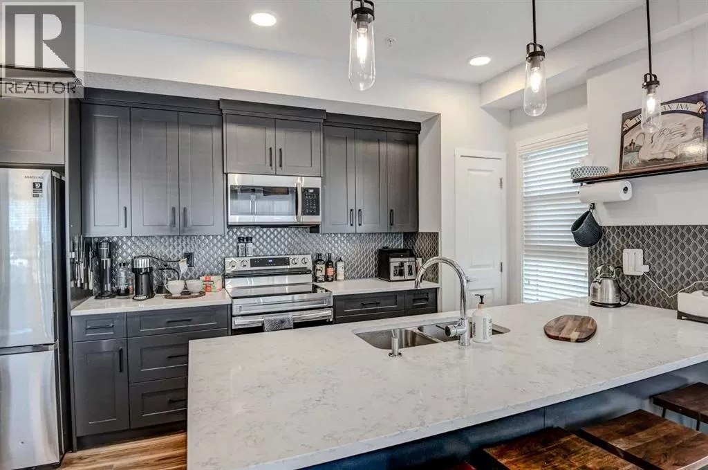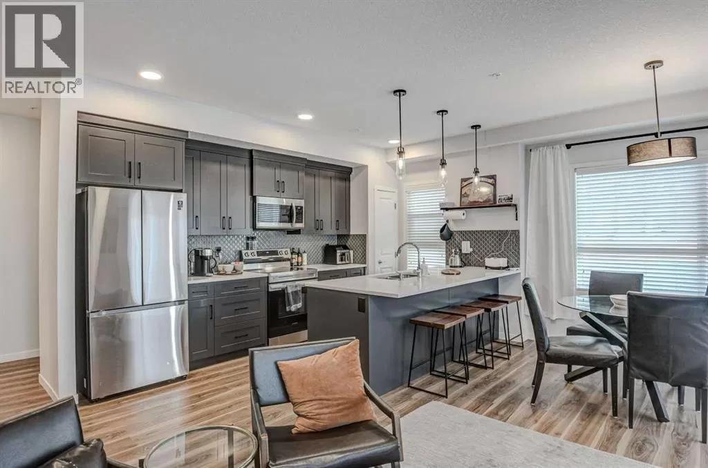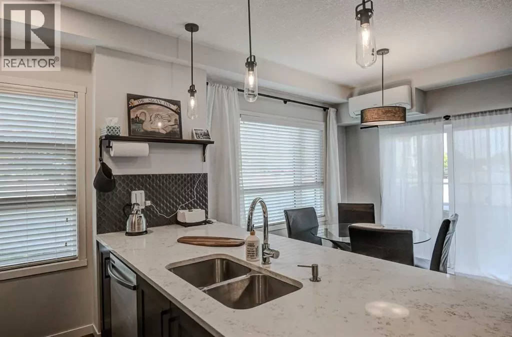 Prepare to be captivated by this stunning end unit, corner ground floor with 2-bed and 2-bath in Seton. Former show suite by Cedarglen Homes, boast high end finishes , modern layout and upgrades. The open & spacious living room includes a chic Chicago brick feature wall and a large low E triple glazed window. Open concept layout that seamlessly combine style and functionality. Comfort is ensured with zoned electric baseboard heating and a Fresh Air System (ERV) . The luxury vinyl plank flooring is all the way through for fast & easy cleaning. No carpet here. The primary suite is spacious with a double vanity ensuite and a walk-in closet. The other good sized bedroom provides access to a full 4-pc bathroom. Step through the kitchen which boast quartz countertops, stainless steel appliances and ample storage within the ceiling-height melamine cabinets. This stylish unit also comes in with an ensuite laundry, titled underground parking and a huge private concrete patio with a gas line for your BBQ. It is also a pet friendly complex (Board approval) up to 40 kilograms. A low- maintenance living- allowing you more free time to enjoy what you love. Perfect for Seniors, Professionals, Young couples, Students, First time home owner or to investors.. This complex is just a walking distance to South Campos Hospital, YMCA, school, shops, restaurant and other amenities.. It is also an easy access to Stoney Trail and Deerfoot Trail.... Please note that the seller is willing to negotiate on any of the contents in the unit. (id:27476)