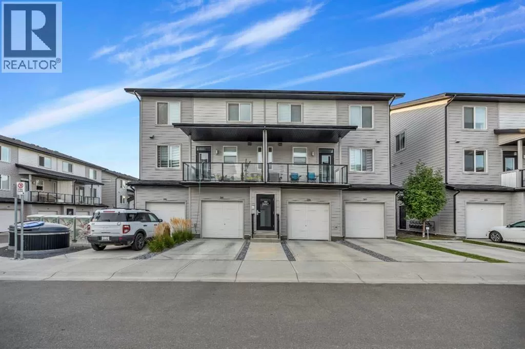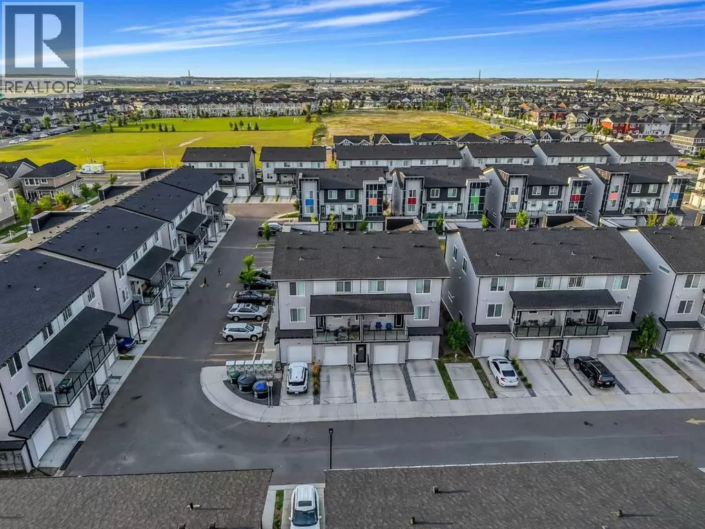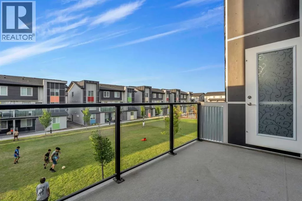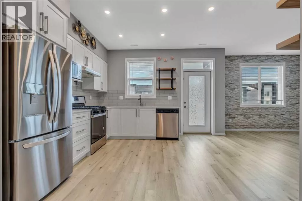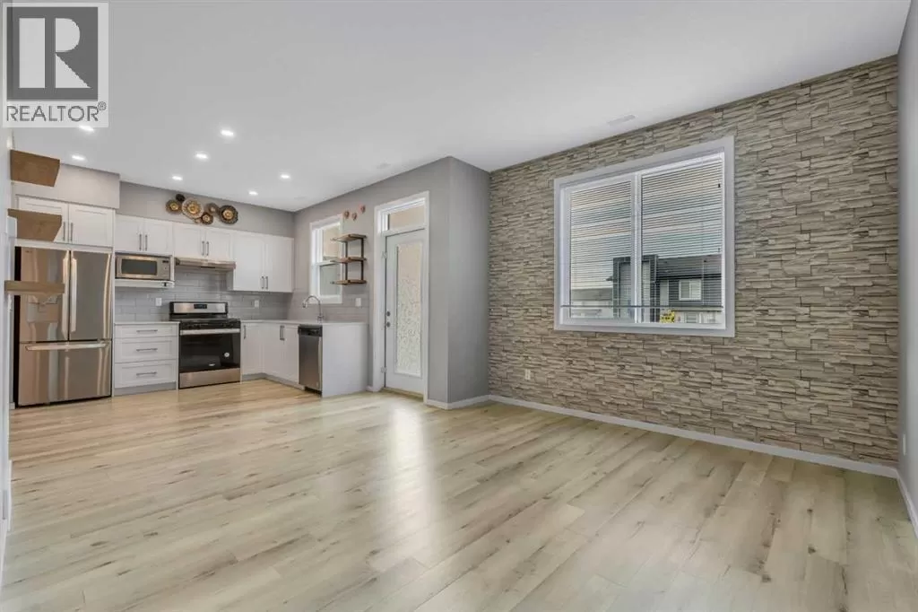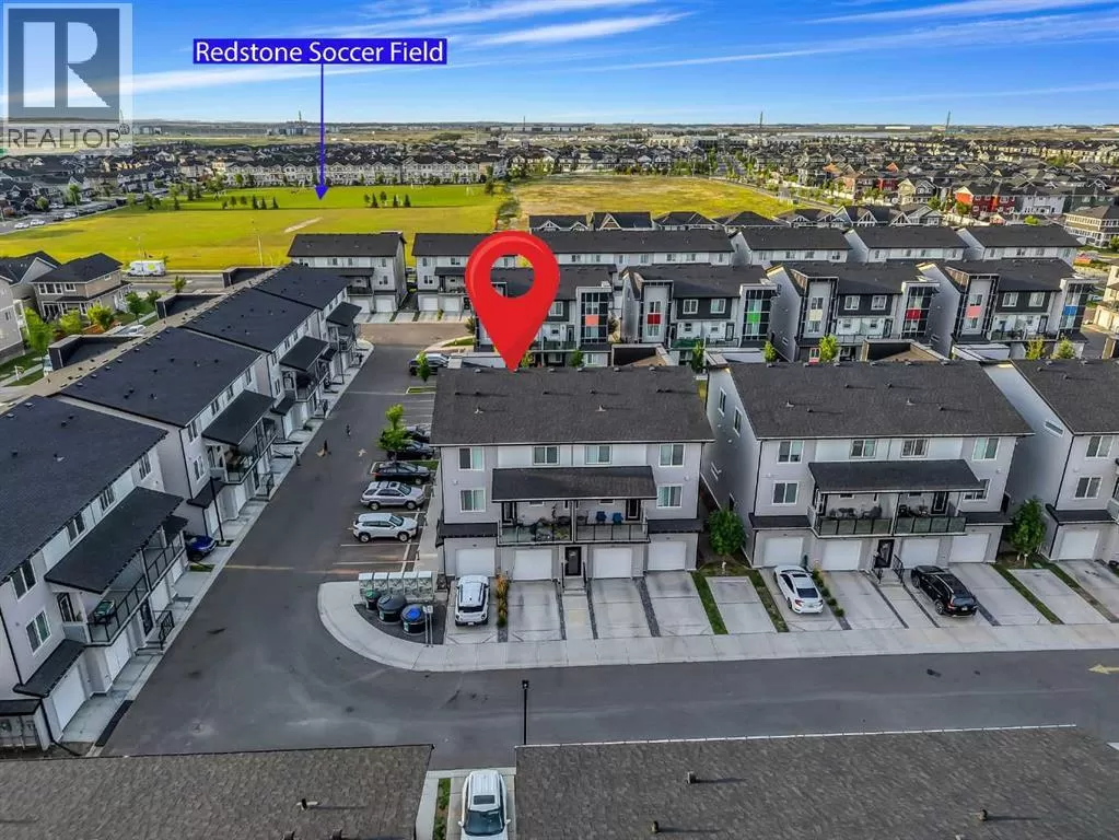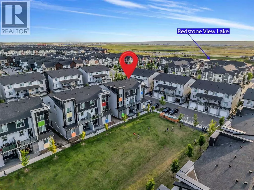 FRONTS ONTO COURTYARD WITH PLAYGROUND & PERGOLAS | END UNIT WITH ATTACHED GARAGE & DRIVEWAY | 2 BED & 2.5 BATH | BBQ GAS LINE | LOW CONDO FEE's! This stylish end-unit townhome in Redstone combines smart design with everyday comfort, making it an appealing choice for both homeowners and investors. Overlooking a beautifully landscaped courtyard with a playground and pergolas, it offers a setting that blends connection and convenience. The main floor is finished with durable LVP flooring and a neutral palette that enhances the open concept layout. A modern kitchen anchors the space with white cabinetry, subway tile backsplash, stainless steel appliances and a pantry for extra storage, creating a hub that is both functional and attractive. The living area features a stone accent wall and oversized window that frames courtyard views while adding natural light. Extend the living space outdoors to a glass-railed deck with a gas line for BBQs, ideal for hosting gatherings or relaxing in the evening. A well-placed powder room completes this level. Upstairs, two generously sized primary bedrooms each include a private four-piece ensuite, providing both privacy and flexibility for families or roommates. Convenient upper laundry adds everyday practicality. Parking is made simple with an attached insulated and drywalled single garage plus a driveway, while ample visitor parking throughout the complex ensures ease for guests. Families will appreciate the direct access to Redstone View Lake with its pathways and natural spaces, along with proximity to new schools, playgrounds, and community amenities. Investors will value the low condo fees, modern finishes and strong rental appeal of a dual primary suite layout. Redstoneâs location offers excellent connectivity with quick routes to Metis Trail, Stoney Trail, Country Hills, Costco, CrossIron Mills, and Calgary International Airport. Whether you are looking for a home that supports modern family living or an investment that balanc es function with long-term value, this end unit presents an outstanding opportunity! (id:27476)