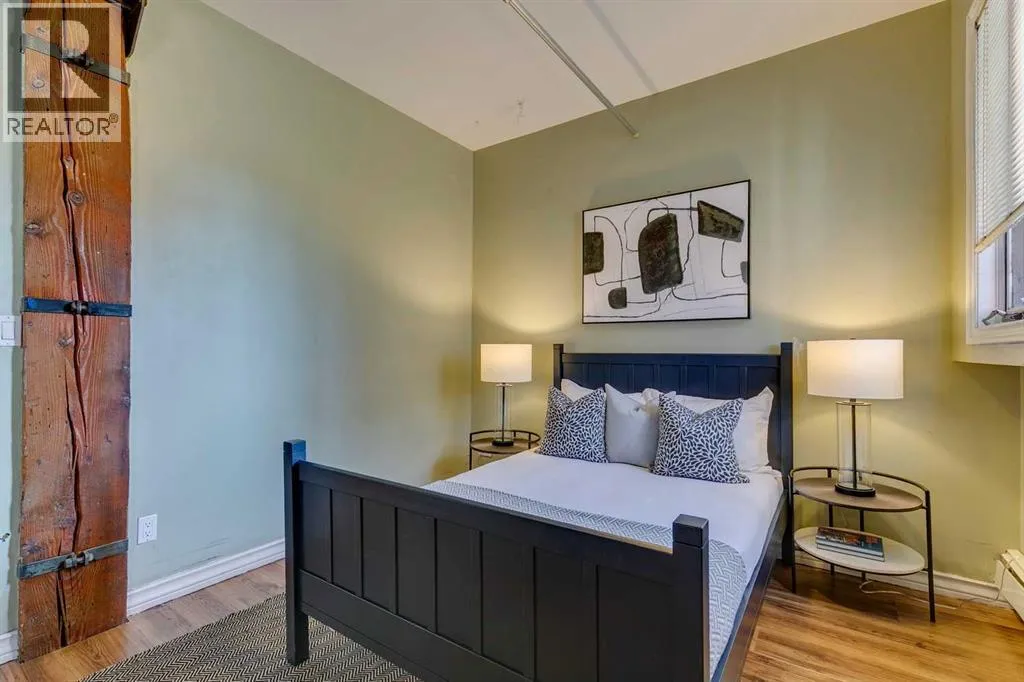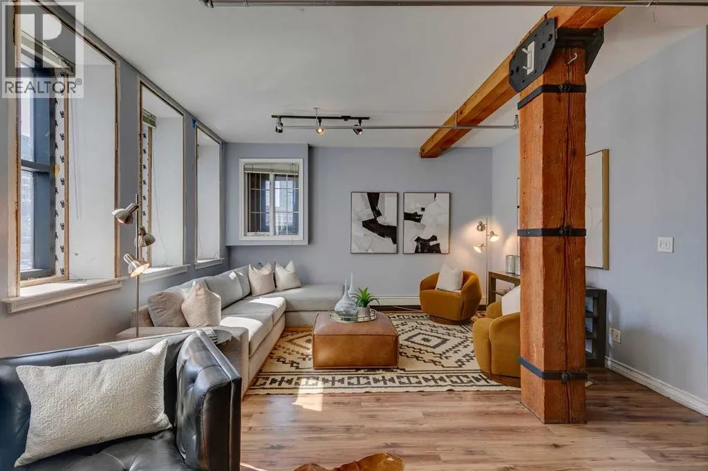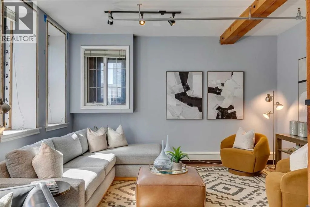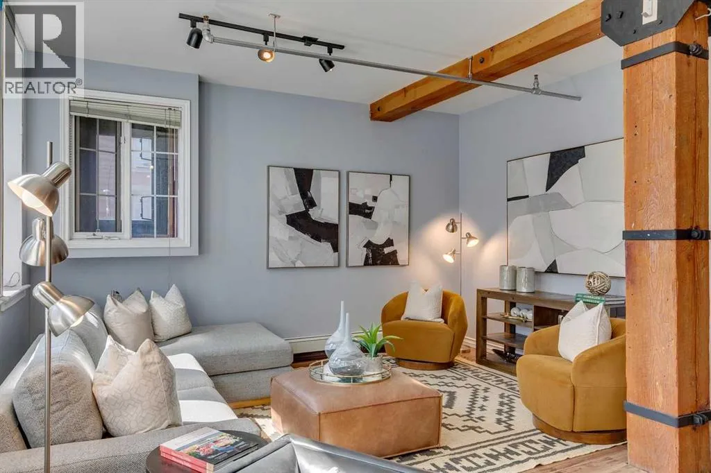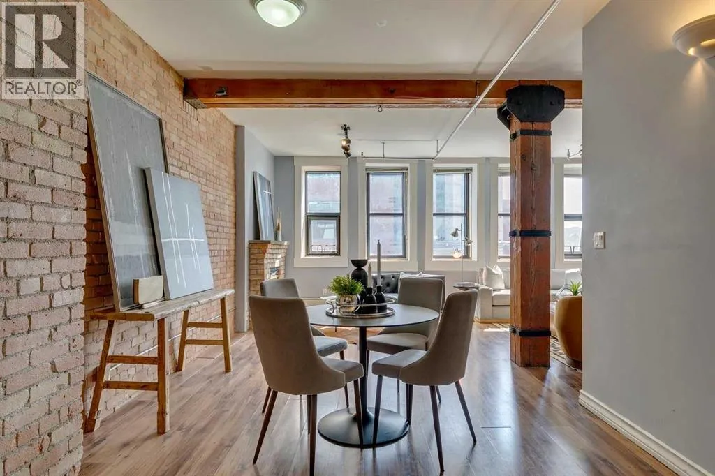**Seller Financing available** Nestled in the heart of Calgary's Beltline, this extraordinary red brick loft offers a rare opportunity to own a piece of the cityâs rich history. Constructed in 1912 for the Imperial Tobacco Company by the renowned A. Dale and Associates, the architectural firm behind the iconic Calgary Tower, this building underwent a stunning conversion to lofts in 1995. For the first time ever, these timeless residences are available for sale, blending historical charm with modern sophistication. Offering over 1,100 SqFt, this expansive loft exudes character with its original brick walls, exposed wood beams, and soaring ceilings. A wall of windows floods the space with natural light, creating a warm and inviting ambiance reminiscent of a classic New York City loft. The open-concept layout is thoughtfully designed, offering endless possibilities for both living and working. A private den provides the perfect space for a home or business office, while two generously sized bedrooms are complemented by a five-piece Jack and Jill bathroom plus there is an additional three-piece bathroom. The galley-style kitchen features maple cabinetry with under mount lighting, stainless steel appliances, and a seamless flow into the dining and living areas. Whether you envision this space as your personal sanctuary or a dynamic live/work environment, the possibilities are as limitless as your imagination. Beyond the loft itself, the building offers an array of amenities, including a gym, a games room, and a rooftop patio with breathtaking views of the Downtown Skyline. An above-ground parking spot is also included, ensuring convenience in this vibrant urban setting. This is more than a home; itâs a lifestyle. A rare blend of history, elegance, and modernity, this loft is a once-in-a-lifetime opportunity to own a truly unique piece of Calgaryâs architectural heritage. (id:27476)