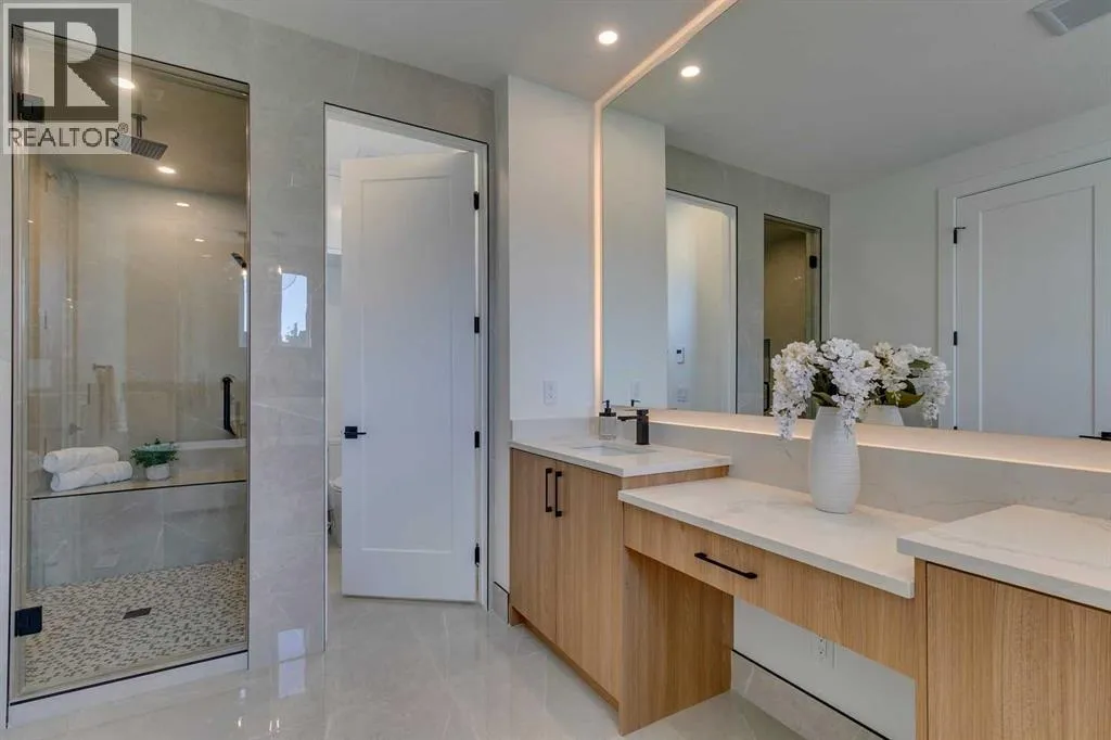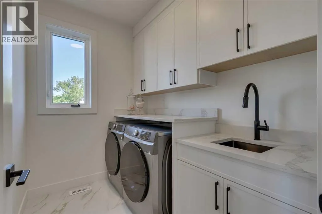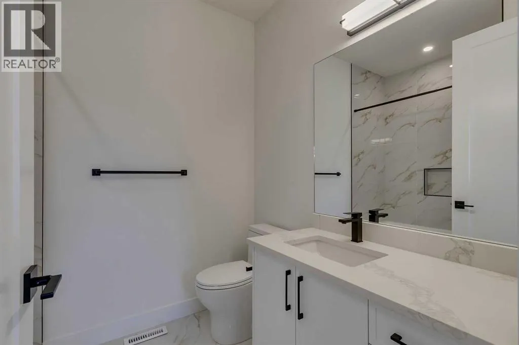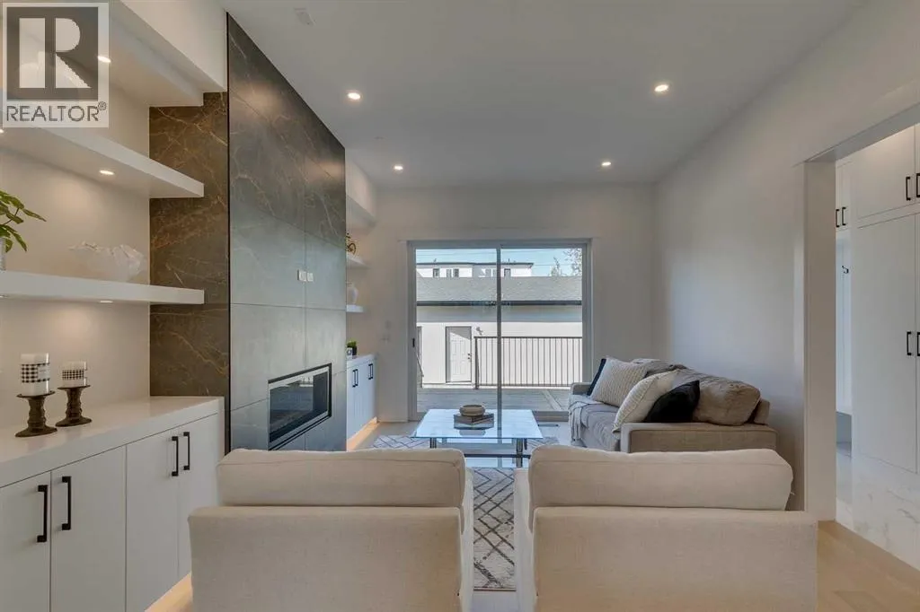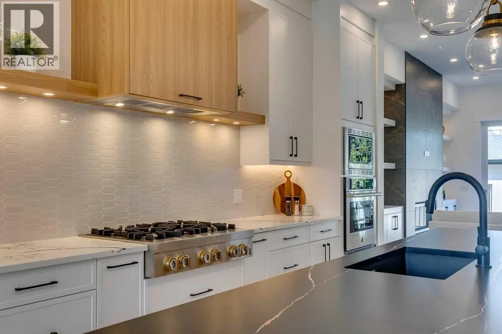 Gorgeous new 3 bedroom home built by Royal Design Homes on a quiet cul-de-sac in sought after Richmond, offering over 2000 sq ft of living space plus a self contained legal 2 bedroom basement suite. The bright & airy main level presents engineered hardwood floors, high ceilings & stylish light fixtures, showcasing the front dining area with beautiful feature wall & ample space to host family & friends. Create culinary masterpieces in the kitchen thatâs tastefully finished with contrasting quartz counter tops, large island/eating bar, excellent appliance package, including panelled fridge & plenty of storage space, including a lovely built-in banquette. The living room is anchored by a floor to ceiling feature fireplace & built-ins. A cozy office space is tucked away just off the kitchen, perfect for a home office setup. Completing the main level is a convenient mudroom with bench, hooks & storage & a 2 piece powder room with wall paper accent & raised stone sink. Ascend the lighted staircase to the second level that hosts a loft/bonus room, 2 bedrooms, 4 piece bath & laundry room with sink & storage. The primary bedroom with vaulted ceiling boasts an outstanding walk-in closet & posh 5 piece ensuite with dual sinks, make-up vanity, relaxing freestanding soaker tub & rejuvenating steam shower. The fully contained legal basement suite features engineered hardwood floors, a large living/dining area with tons of built-in storage, kitchen with island/eating bar, quartz counter tops & stainless steel appliances. Two bedrooms, a 4 piece bath & dedicated laundry facilities complete the legal basement suite. Other notable features include roughed in air conditioning & 2 furnaces. Outside, enjoy the beautifully landscaped front garden & back yard with deck & access to a double detached garage. The location is incredibly convenient, close to vibrant Marda Loop, excellent schools, parks, public transit & easy access to 26th Avenue & Crowchild Trail. (id:27476)