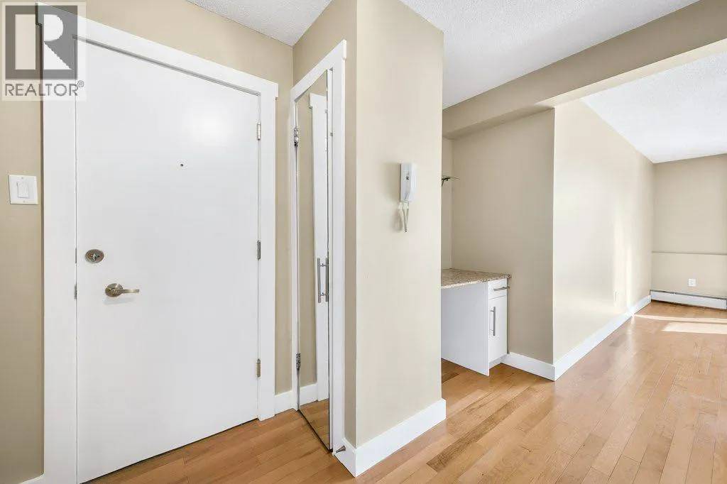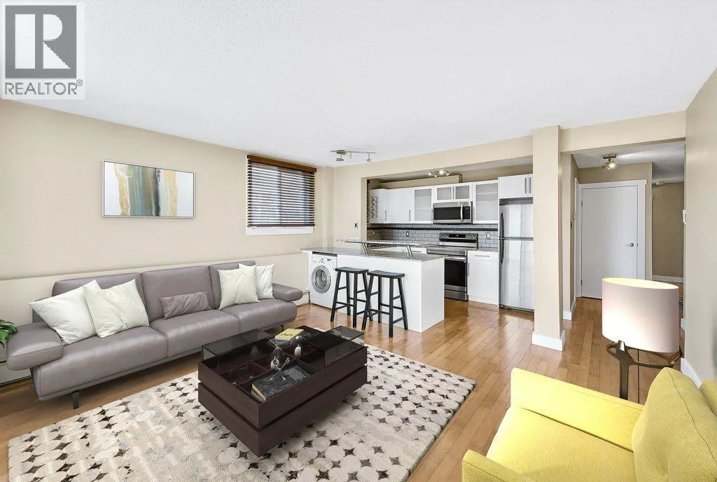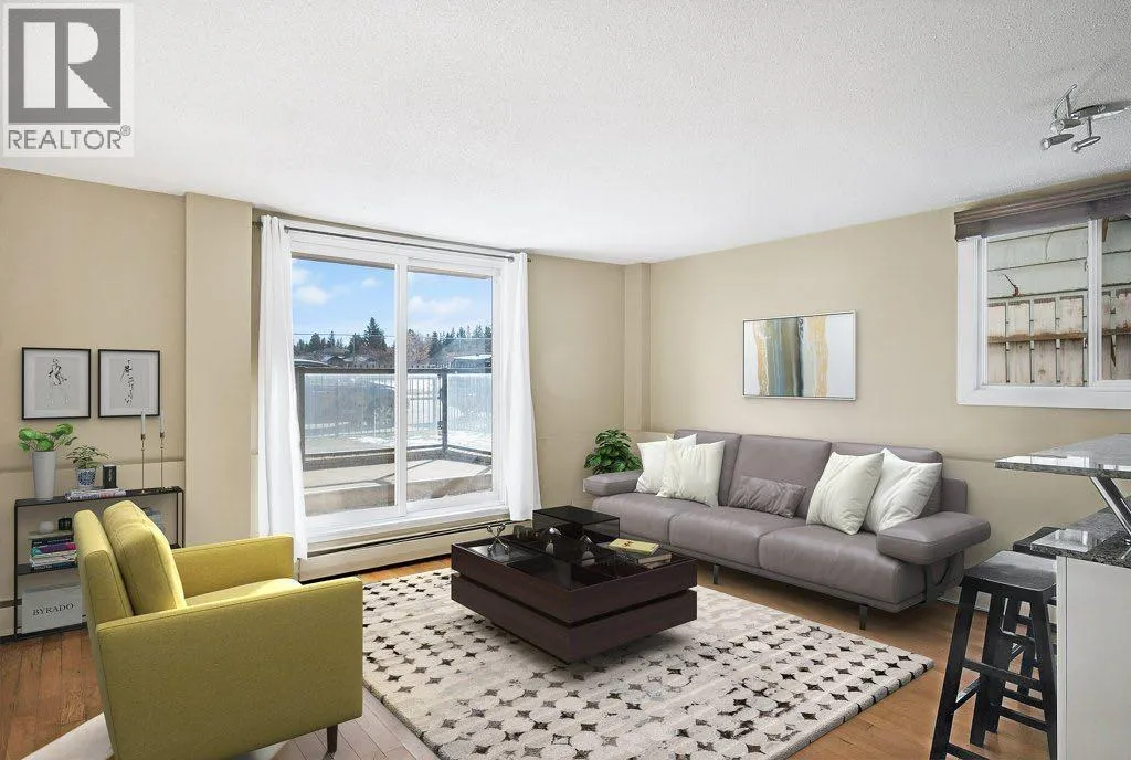 NEW PRICE! The ELAN in Bankview! This spacious 2-bed, 1-bath main-floor condo combines modern updates with unbeatable walkability. The open-concept layout is brightened by side windows and a large patio door, leading to a private 12' x 8.5' glass-enclosed patio. The kitchen offers granite counters, updated cabinetry, raised eating bar, and stainless steel appliancesâincluding a new smart oven/stove with WiFi and over-the-range microwave. The bathroom is finished with granite and a 22" deep soaker tub. Both bedrooms are generously sized, and a built-in granite desk off the foyer makes working from home seamless.Additional features: HW floors, in-suite laundry, central vacuum & attachments, extra storage, & assigned locker. The CONDO FEES include ALL utilities (even electricity)!! Located steps from 17th Avenueâs top restaurants, bars, parks, and schools, this property is ideal for both investors and first-time buyers. Book your showing today and step into Bankview living. (id:27476)