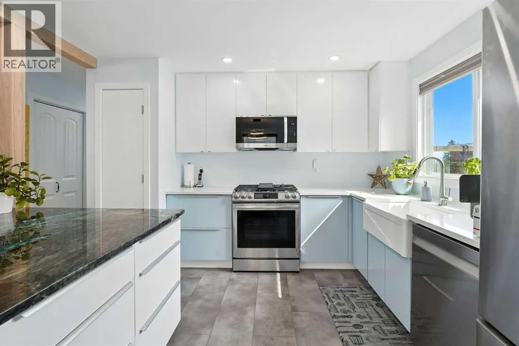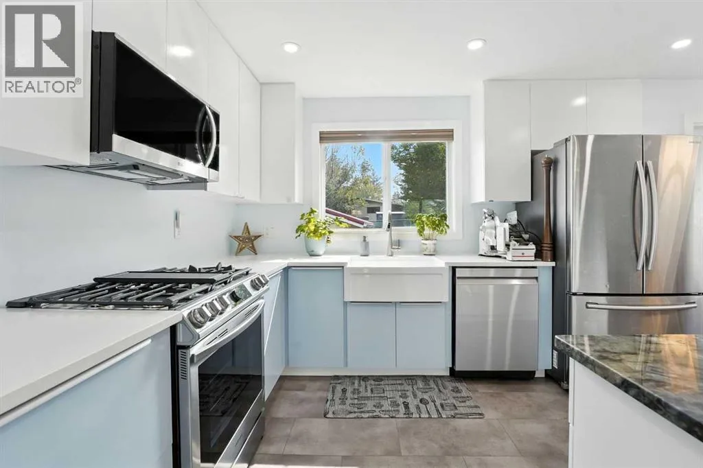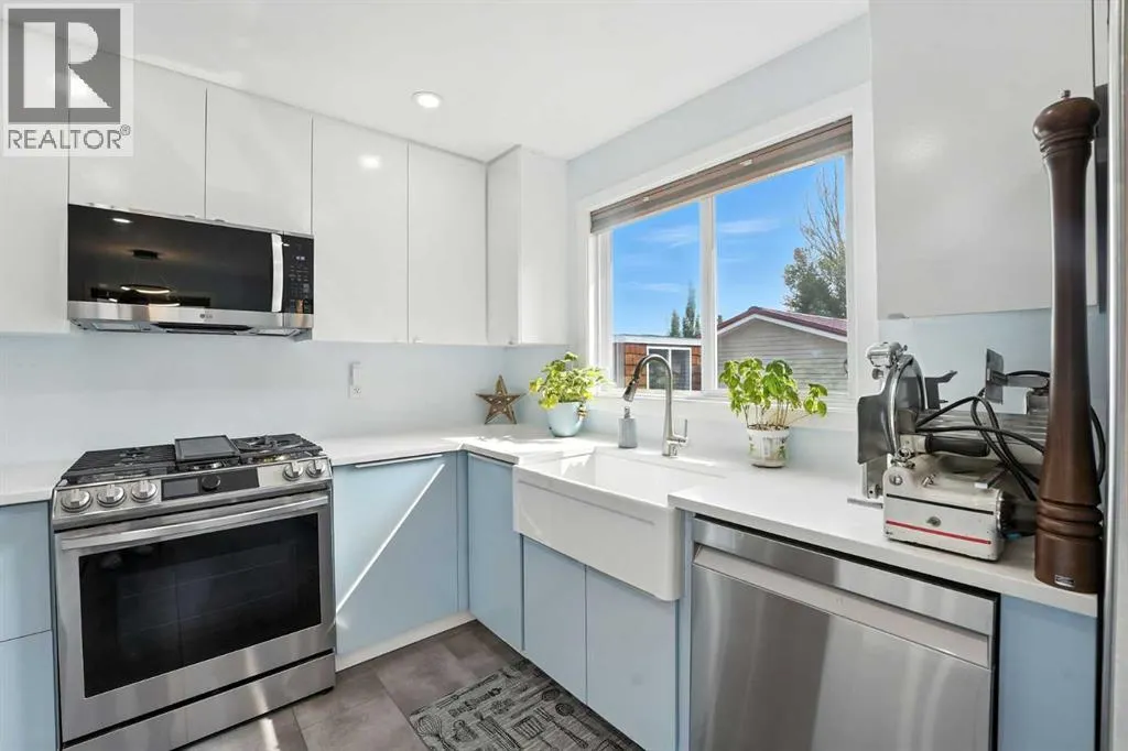 Welcome to 1454 Hunterbrook Road NW, a beautifully updated 4-bed, 2-bath bi-level home nestled on a quiet street in the heart of Huntington Hills. Situated on a gorgeous, well-maintained lot with a northwest-facing front yard, this property boasts a spacious layout, functional updates, and exceptional curb appeal. Step inside to find fresh hardwood, tile, and carpet flooring, paired with warm neutral tones and stylish finishes that make this home move-in ready. The main floor offers a bright, open-concept living and dining area, enhanced by large windows and a charming wood-burning stove that adds a cozy focal point. The updated kitchen features modern stone countertops, stainless steel appliances including an electric oven, a central island with breakfast bar, and plenty of cabinet space for the home chef. Three bedrooms and a fully renovated 4-piece bathroom complete the upper level, providing comfortable accommodations for families or guests. The fully finished basement extends your living space with a massive recreation/game room, an additional large bedroom, a full 4-piece bath, a dedicated storage room, and a spacious utility/laundry area. Outside, enjoy the fenced backyard with a private patioâideal for summer BBQs and quiet eveningsâand a double detached garage with ample room for parking and storage. This charming home is just steps from parks, playgrounds, schools, and shopping, offering both convenience and a strong sense of community. With easy access to Deerfoot Trail, Centre Street, and downtown Calgary, commuting is a breeze. Whether you're a growing family or looking for a versatile investment, this Huntington Hills gem combines classic charm with modern comfort in one of Calgary's most established neighbourhoods (id:27476)