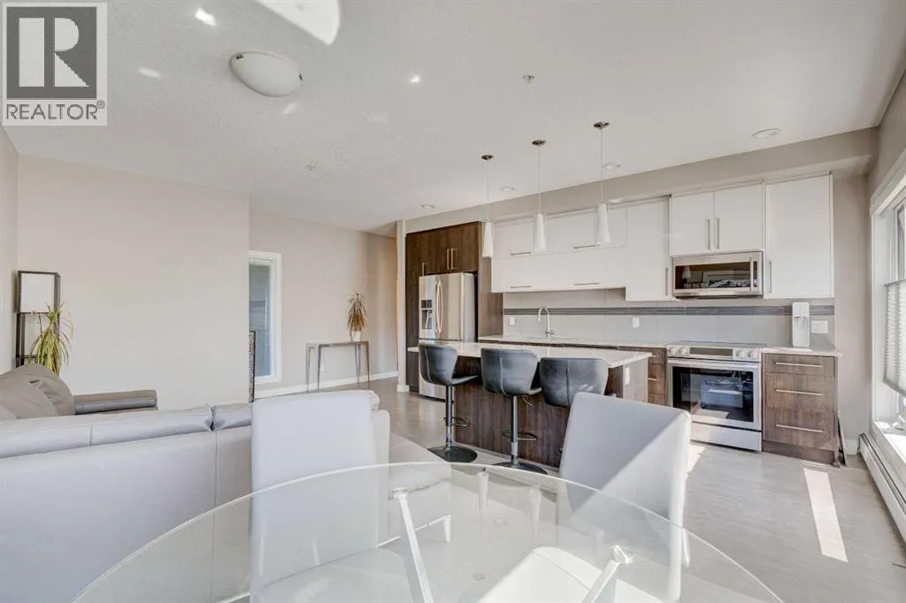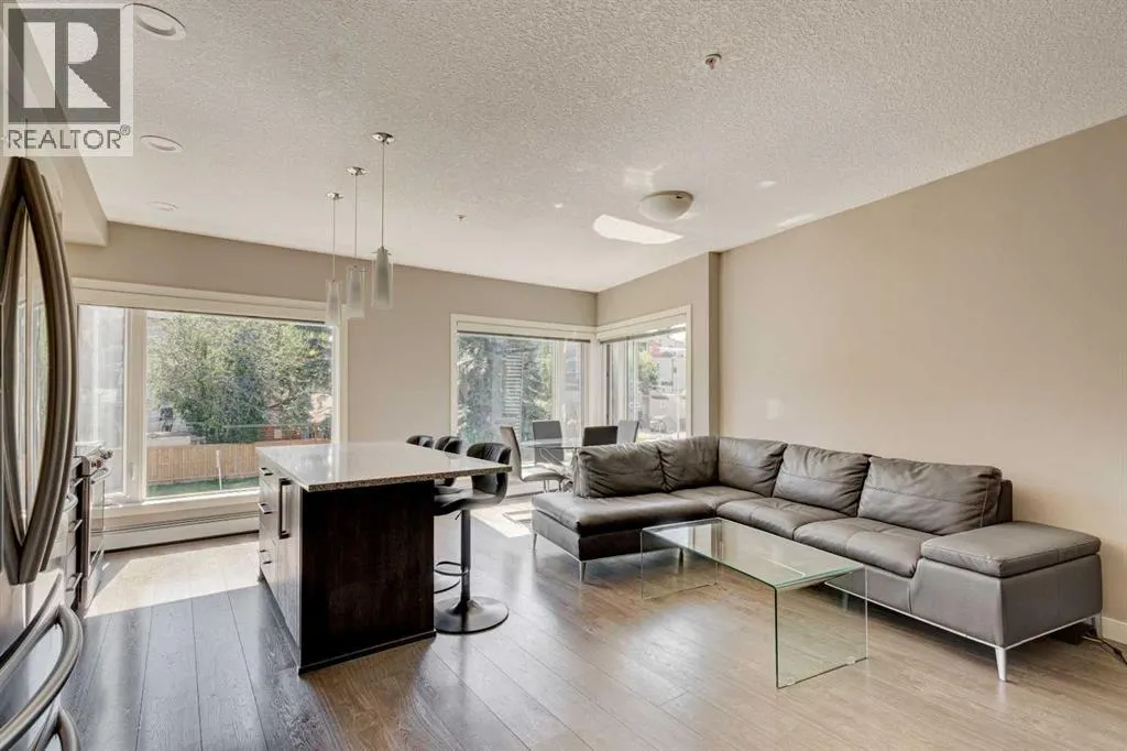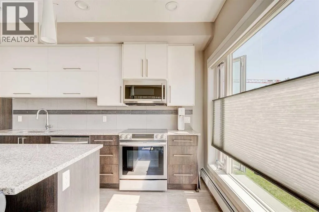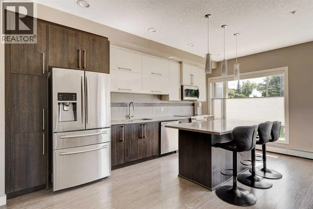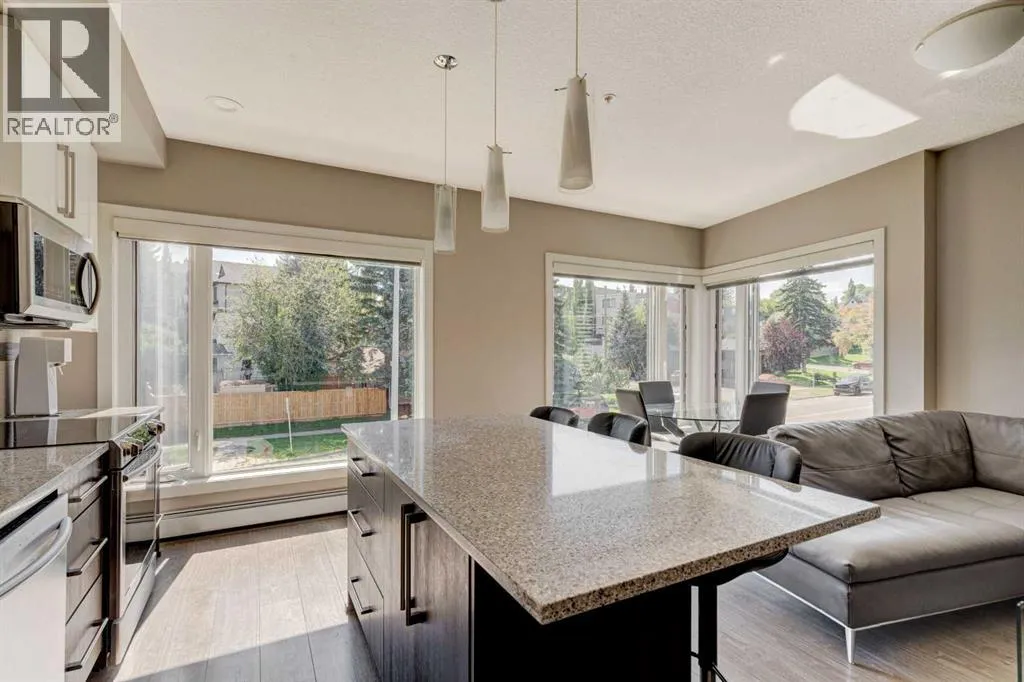 Indulge in the vibrant urban lifestyle of Mission 34 with this sun-filled corner 2-bedroom, 2-bathroom pet friendly condo. Designed for both comfort and function, this condo features additional builder upgrades, plus a fantastic layout that separates the bedrooms across the hall and opens into a sleek kitchen with a large island, upgraded stainless steel appliances, quartz countertops, and mosaic tile accents. The living area is soaked in natural light thanks to the abundance of windows throughout. With 856 sq ft of roomy livable space with a great floor plan, this is one of the larger units in the complex and is move-in ready. Wide-plank flooring and a modern two-tone kitchen elevate the space, while builder upgrades keep the interior looking fresh and stylish. The primary bedroom is well appointed and features a Juliette balcony, 4-piece ensuite, and a large wall to wall closet with plenty of storage. The second bedroom works equally well as a guest room, office, or gym, with a full 3-piece bathroom just outside the door. This unit also comes with in-suite laundry and a titled parking stall to add convenience. Residents enjoy access to a landscaped courtyard with an outdoor grilling area and seating, plus visitor parking and secure bike storage. The location places you close to Mission and Beltline amenities, river paths, transit, bike paths, parks, as well as the stampede grounds striking the perfect balance between inner-city energy and everyday ease. This building has an active board with a strong reserve which makes it a great investment. Welcome home where convenience, and a fantastic community await to create an unparalleled living experience. The perfect location to enjoy inner city life, but also just a few minutes away from being immersed full time. Mission 34 is airbnb friendly/short-term friendly building must be approved by the board. Dogs are permitted upto 50 pounds. (id:27476)