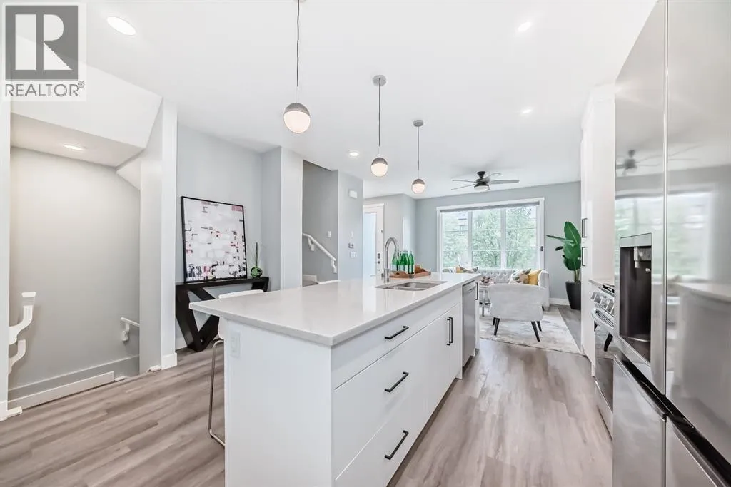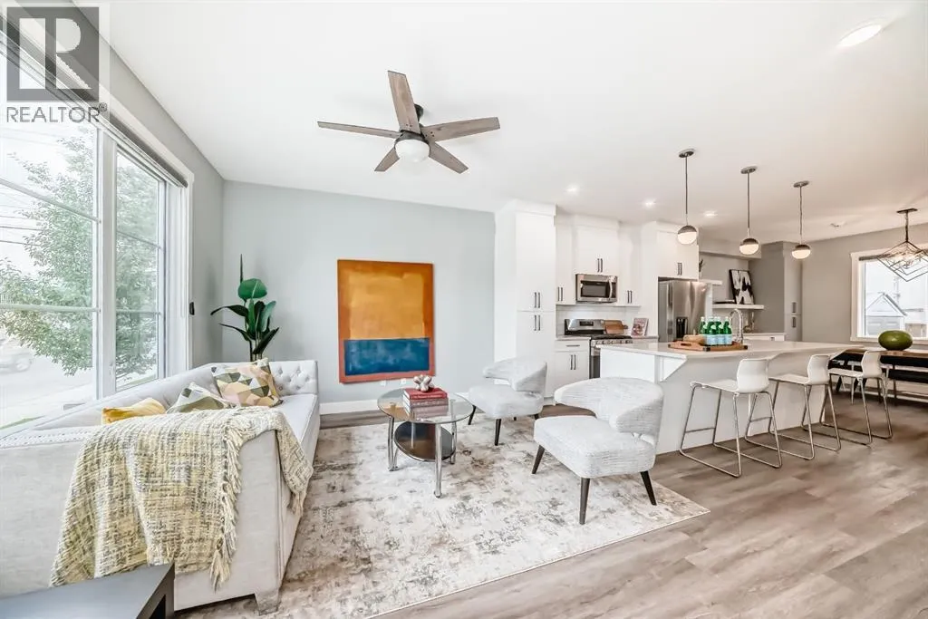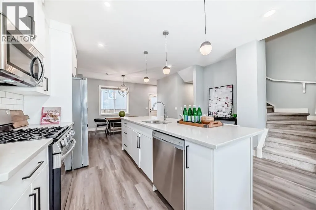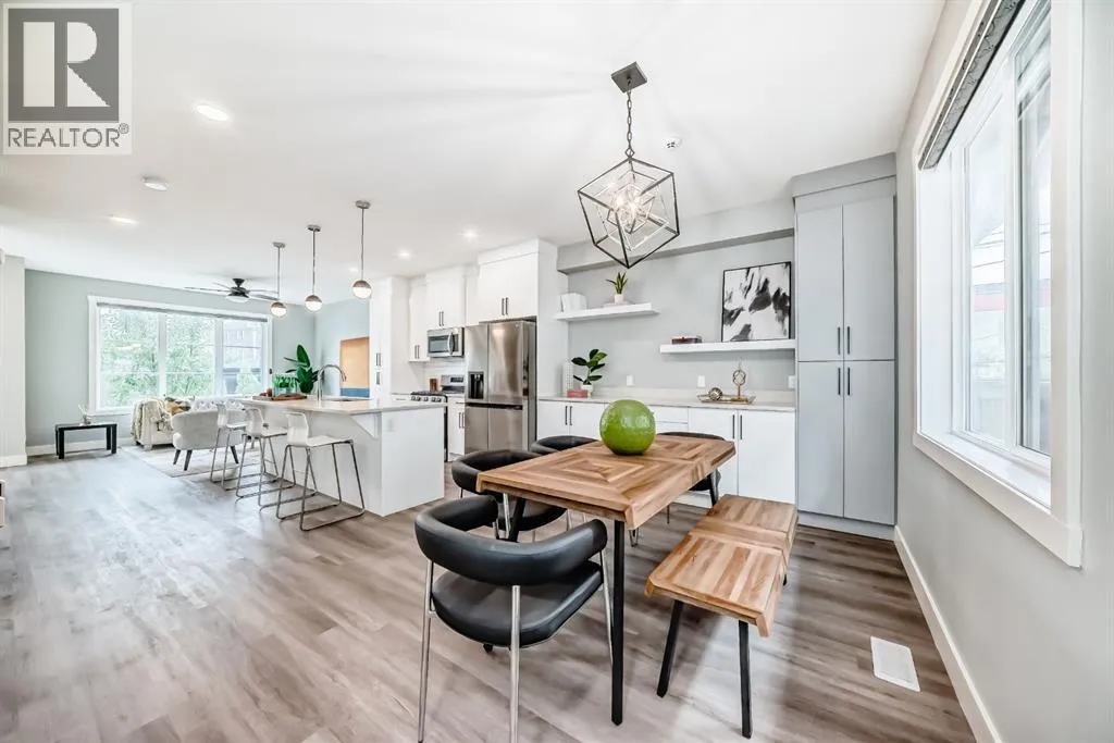 Welcome home to this beautifully designed for comfort, style, and everyday functionality. Sunlight streams through the east-facing windows, brightening an open-concept main floor with soaring 9-ft ceilings and durable luxury vinyl plank (LVP) flooring for a modern, low-maintenance finish. Over 1990 sqft of living space offer 4 bedrooms and 3 and half bathrooms.The chef-inspired kitchen features stainless-steel appliances, an expansive quartz island perfect for casual seating or meal prep, and quartz countertops throughout. A thoughtfully integrated built-in dining area creates the perfect spot for family dinners or entertaining. Just off the kitchen, the walk-in pantry and mudroom with extra shelving keep life organized.Upstairs, the spacious primary suite offers a walk-in closet and 4-piece ensuite, while two additional generously sized bedrooms and another full bath provide room for a growing household, home office, or guest space.The fully finished basement adds valuable living area with a wet bar, additional bedroom, and full bathroomâideal for guests, older children, or movie nights.Outdoors, enjoy a concrete patio for morning coffee or evening barbecues and a backyard shed for extra storage. All of this sits within steps of Montgomeryâs amenitiesâshops, cafés, river pathways, schools, and quick access to major routes. (id:27476)