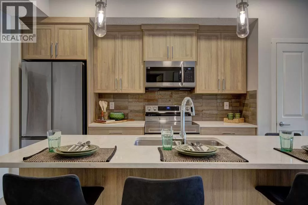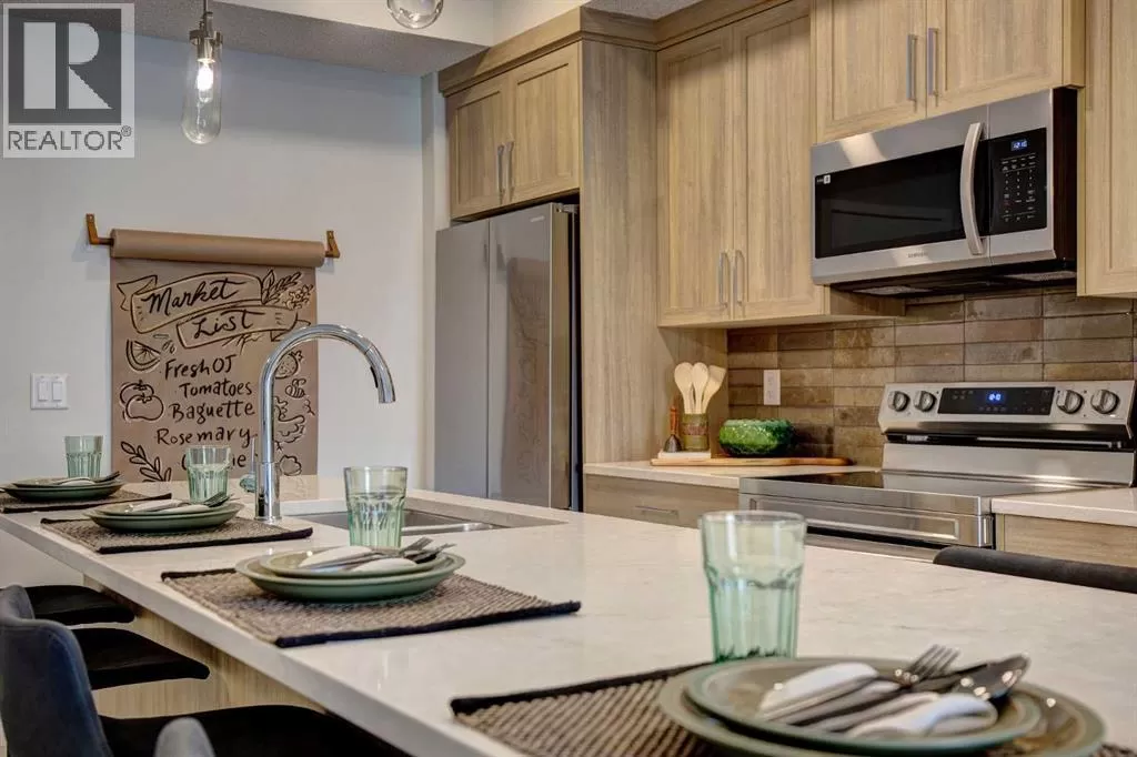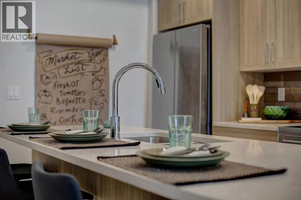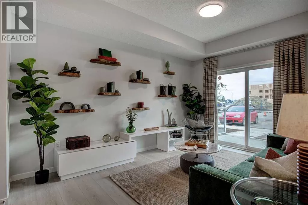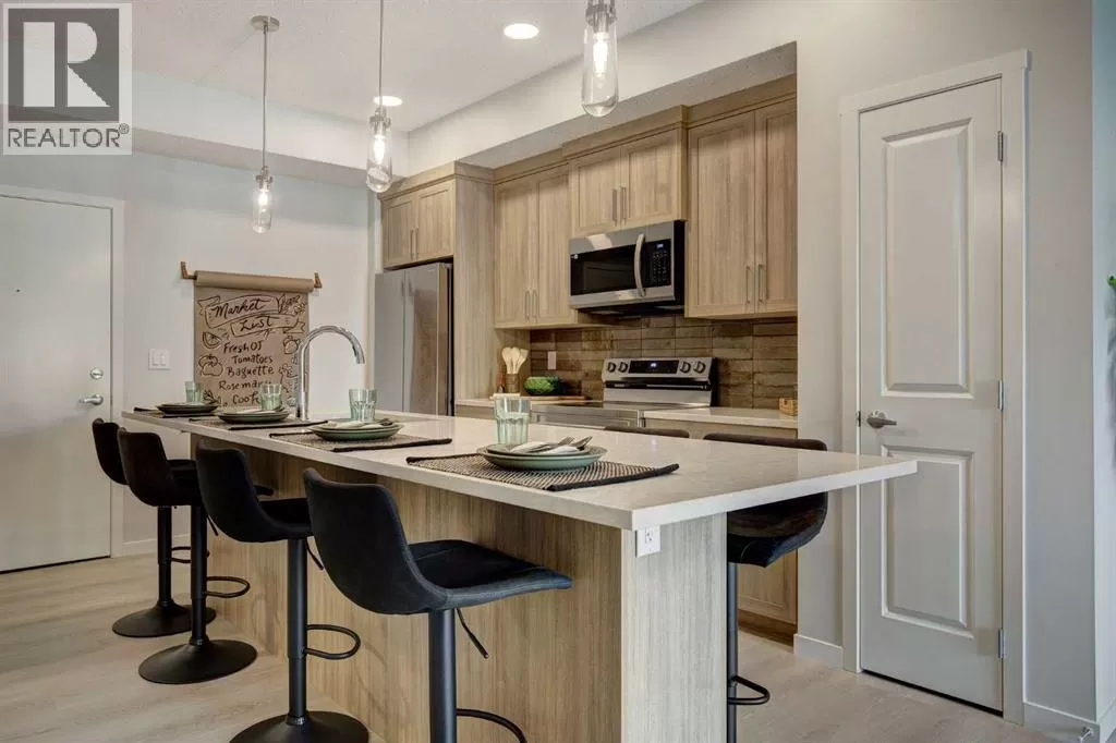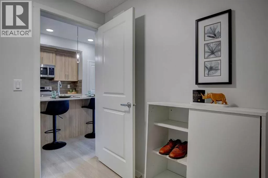 INTRODUCING GLACIER RIDGE, IN BEAUTIFUL NORTHWEST CALGARY. BUILT BY CEDARGLEN LIVING, WINNER OF THE CustomerInsight BUILDER OF CHOICE AWARD, 5 YEARS RUNNING! BRAND NEW "GR04" unit with high-spec features. You will feel right at home in this well thought-out TOP FLOOR, 651.0 RMS sq.ft. 1 bed, 1 bath home with open plan, 9' ceilings, LVP flooring throughout (NO CARPET), Low E triple glazed windows, BBQ gas line on the patio, Fresh Air System (ERV), and so much more. The kitchen is spectacular with full height, two tone cabinets, quartz counters, upgraded bank of drawers for pots and pans, undermount sink, rough-in water line to the fridge and S/S appliances. The island is extensive with built in flush breakfast bar, which transitions into the spacious living area, perfect for entertaining. The spacious primary bedroom has a large bright window (triple pane windows) and sizeable walk-in closet. Right beside your bedroom is a 4pc bath with quartz counters, upgraded tiles to the ceiling, and undermount sink. Nearby is the spacious laundry/storage room, this is a must see (washer & dryer included). Highlights include: Hardie board siding, designer lighting package, sound reducing membrane to reduce sound transmission between floors, clear glass railing to balconies and 1 titled underground parking stall included. A once in a lifetime community in Northwest Calgary. Framed by views of the Rocky Mountains and distinguished by natural coulees that cross the land, Glacier Ridge offers a rare chance for families to live in a new community. PET FRIENDLY COMPLEX, PRE-CONSTRUCTION OPPORTUNITY (drywall stage) and PHOTOS ARE OF A DIFFERENT SHOW SUITE FOR REFERENCE ONLY, FINISHING'S/PLAN WILL DIFFER. ESTIMATED COMPLETION IS DECEMBER 4, 2025. VISIT THE SHOW SUITE TODAY FOR MORE INFO! (id:27476)
