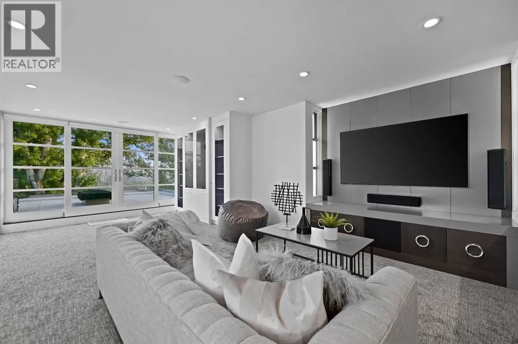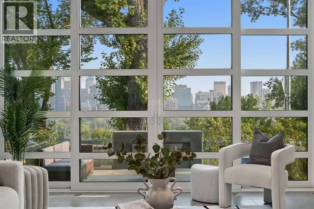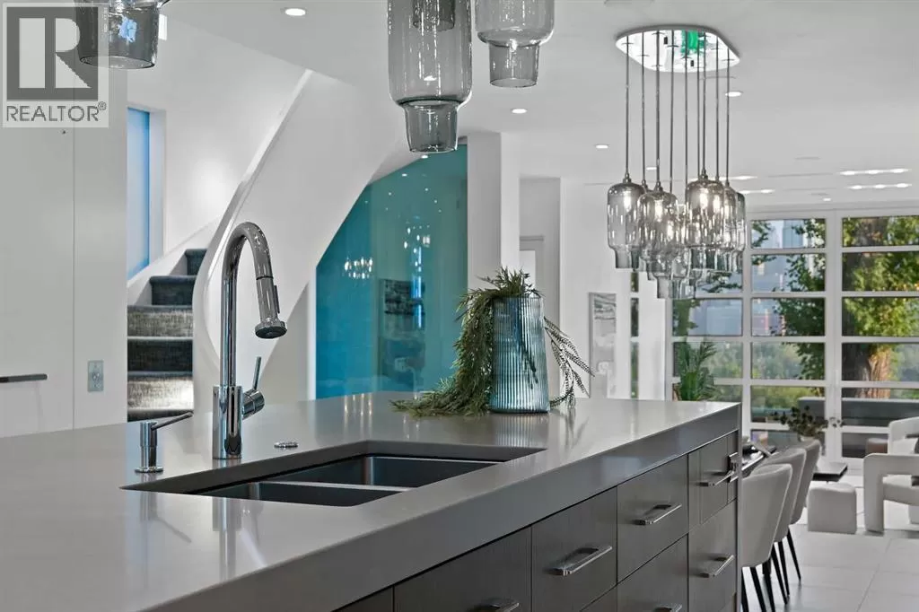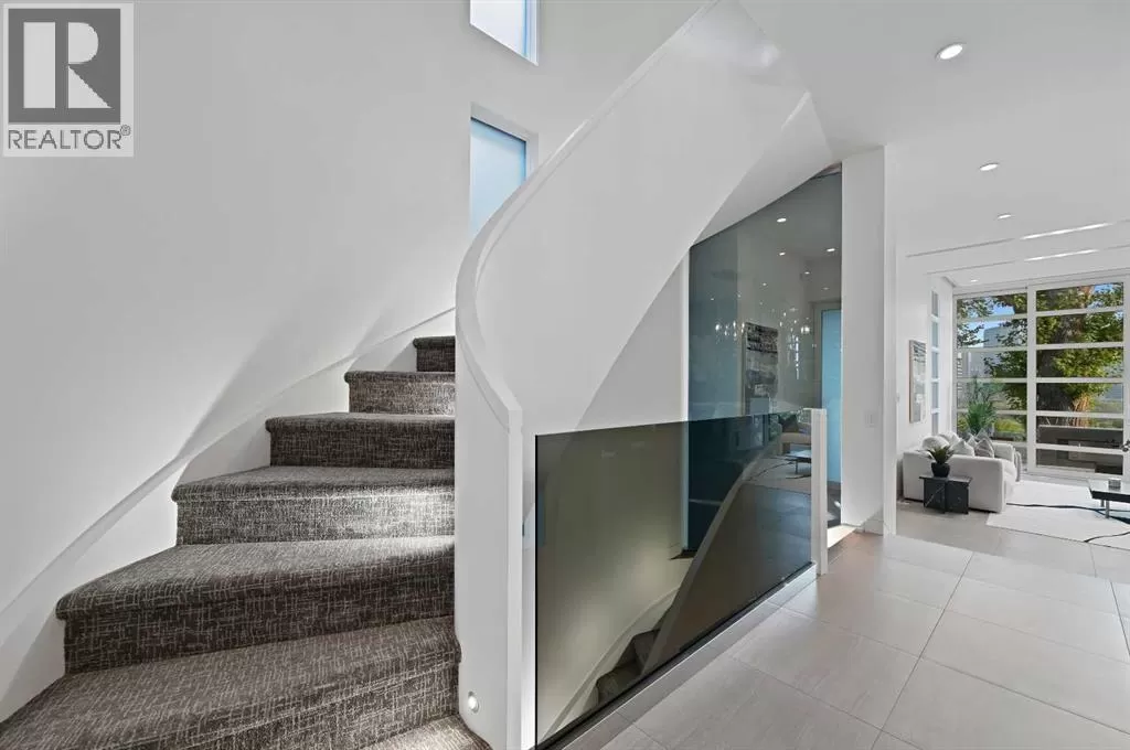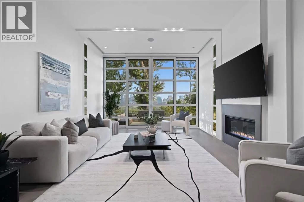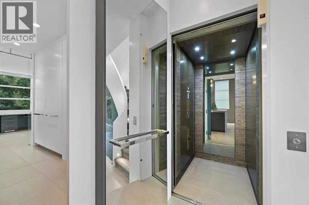 Perched high above the city on one of Calgaryâs most coveted streets, this architectural triumph redefines modern luxury. Designed by Sean McCormick, curated by Paul Lavoie, and masterfully built by Riverview Custom Homes, every square inch of this residence is a study in world-class design and flawless execution. From the moment you enter, youâre enveloped in sleek sophisticationâsoaring ceilings, sculptural lines, and bespoke millwork that blur the boundaries between art and architecture. The living room opens wide with full-height Reynaers sliding walls of glass, connecting to a dramatic front terrace where a dual fireplace and uninterrupted city skyline views create the ultimate backdrop for entertaining. The dining space and chefâs kitchen flow with understated elegance, elevated by a showpiece quartz waterfall island, custom cabinetry, and an integrated Miele appliance suite. Hidden within the paneled wall: a discreet powder room and a private elevator connecting all four levels. At the rear, a refined den and screened âthree-seasonâ room invite intimate moments of calm. Upstairs, the primary suite is pure indulgenceâfloor-to-ceiling windows frame the city lights, while a couture dressing room and spa-inspired ensuite with heated floors, freestanding tub, and oversized shower create a private sanctuary. A second lavish bedroom with ensuite and a designer laundry room complete this level. The top floor is where glamour meets leisureâa sprawling media lounge with home theatre, wet bar with dual Sub-Zero fridges, and seamless access to a private terrace with flame table and fireplace. From sunrise to sunset, the panoramic city and mountain views here are simply unforgettable. A third bedroom and bath round out this floor.On the lower level, discover a private gym, steam shower, and a custom mudroom leading to the immaculate heated double garage with EV charger rough-in. Technology and comfort intertwine with in-floor heating, full snowmelt system, central A/C, complete home automation, and secured gated perimeter with cameras. This is more than a homeâitâs a statement. A one-of-a-kind residence on Crescent Road where luxury, design, and location converge in perfect harmony. (id:27476)