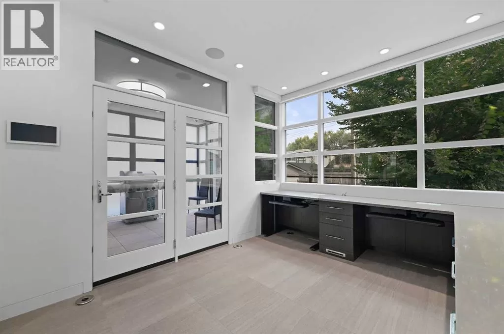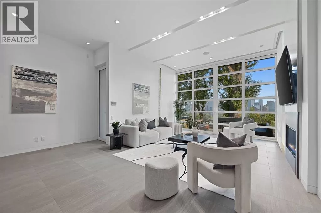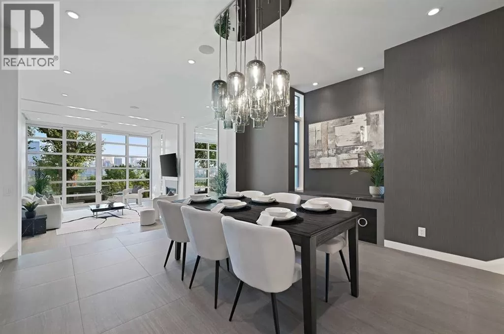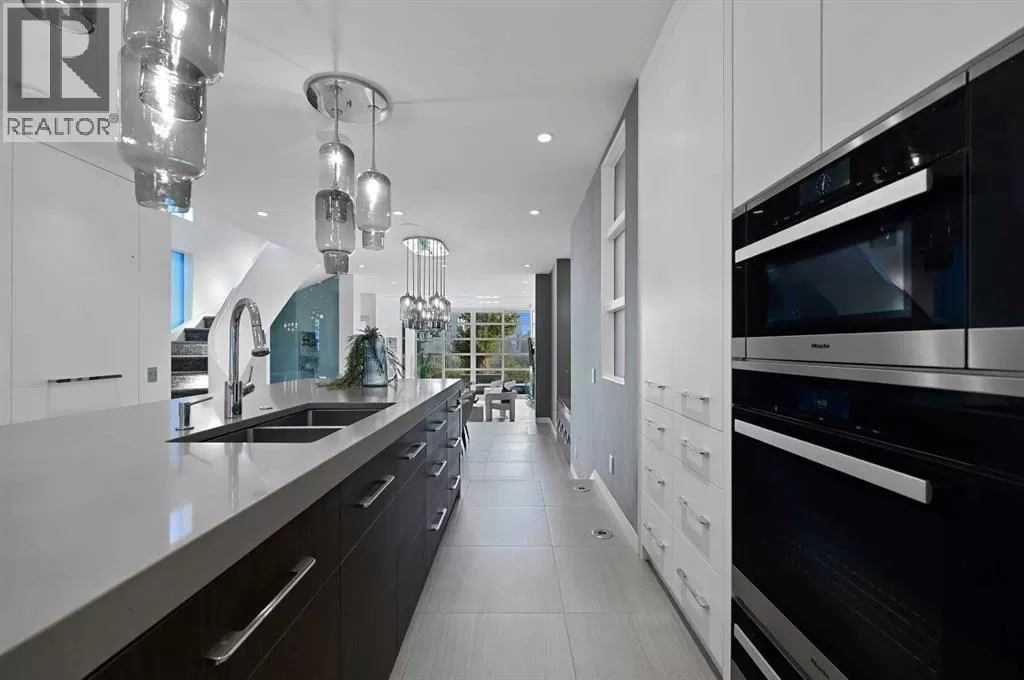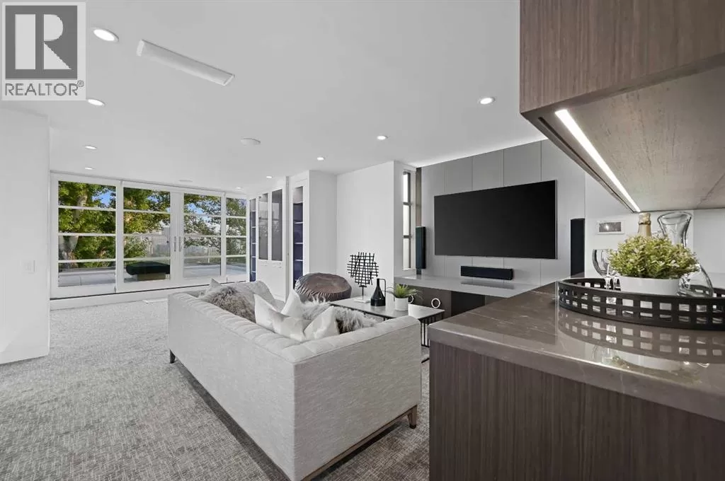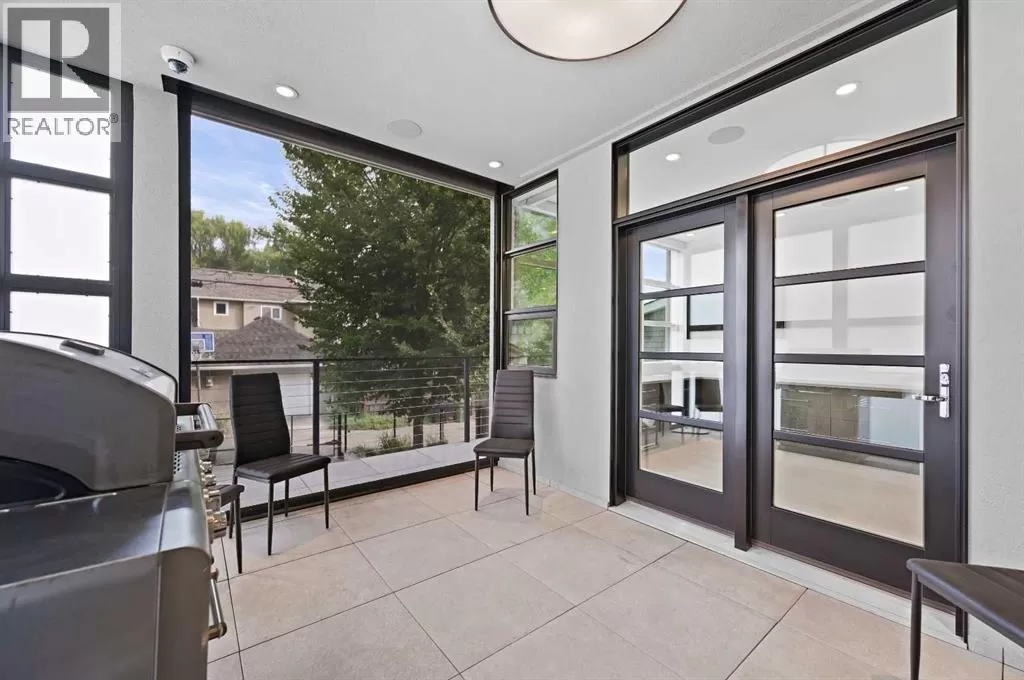 Perched high above the city on one of Calgaryâs most coveted streets, this architectural triumph redefines modern luxury. Designed by Sean McCormick, curated by Paul Lavoie, and masterfully built by Riverview Custom Homes, every square inch of this residence is a study in world-class design and flawless execution. From the moment you enter, youâre enveloped in sleek sophisticationâsoaring ceilings, sculptural lines, and bespoke millwork that blur the boundaries between art and architecture. The living room opens wide with full-height Reynaers sliding walls of glass, connecting to a dramatic front terrace where a dual fireplace and uninterrupted city skyline views create the ultimate backdrop for entertaining. The dining space and chefâs kitchen flow with understated elegance, elevated by a showpiece quartz waterfall island, custom cabinetry, and an integrated Miele appliance suite. Hidden within the paneled wall: a discreet powder room and a private elevator connecting all four levels. At the rear, a refined den and screened âthree-seasonâ room invite intimate moments of calm. Upstairs, the primary suite is pure indulgenceâfloor-to-ceiling windows frame the city lights, while a couture dressing room and spa-inspired ensuite with heated floors, freestanding tub, and oversized shower create a private sanctuary. A second lavish bedroom with ensuite and a designer laundry room complete this level. The top floor is where glamour meets leisureâa sprawling media lounge with home theatre, wet bar with dual Sub-Zero fridges, and seamless access to a private terrace with flame table and fireplace. From sunrise to sunset, the panoramic city and mountain views here are simply unforgettable. A third bedroom and bath round out this floor.On the lower level, discover a private gym, steam shower, and a custom mudroom leading to the immaculate heated double garage with EV charger rough-in. Technology and comfort intertwine with in-floor heating, full snowmelt system, central A/C, complete home automation, and secured gated perimeter with cameras. This is more than a homeâitâs a statement. A one-of-a-kind residence on Crescent Road where luxury, design, and location converge in perfect harmony. (id:27476)