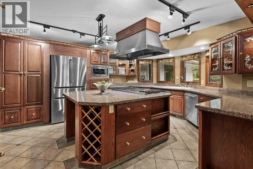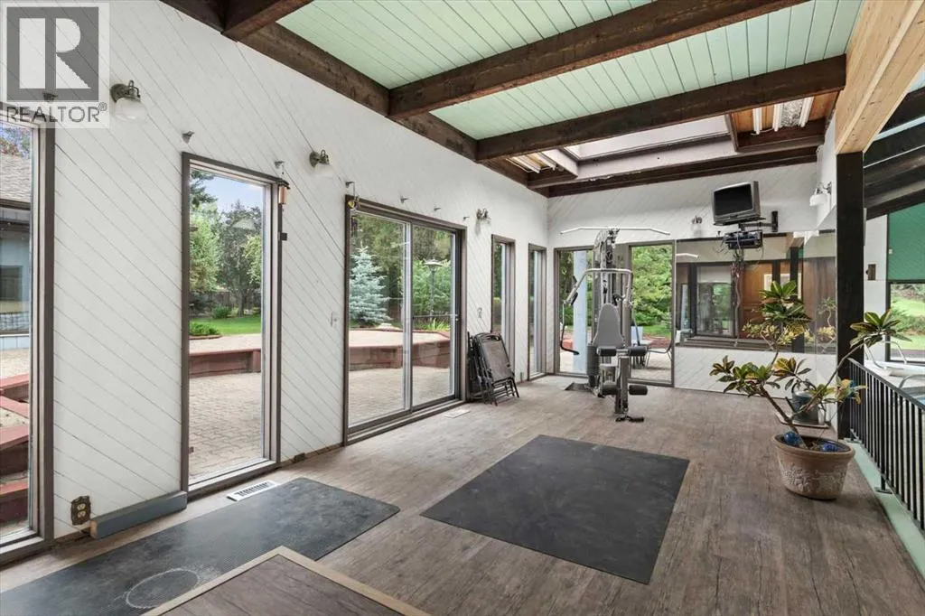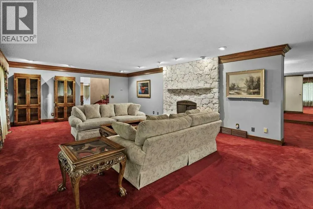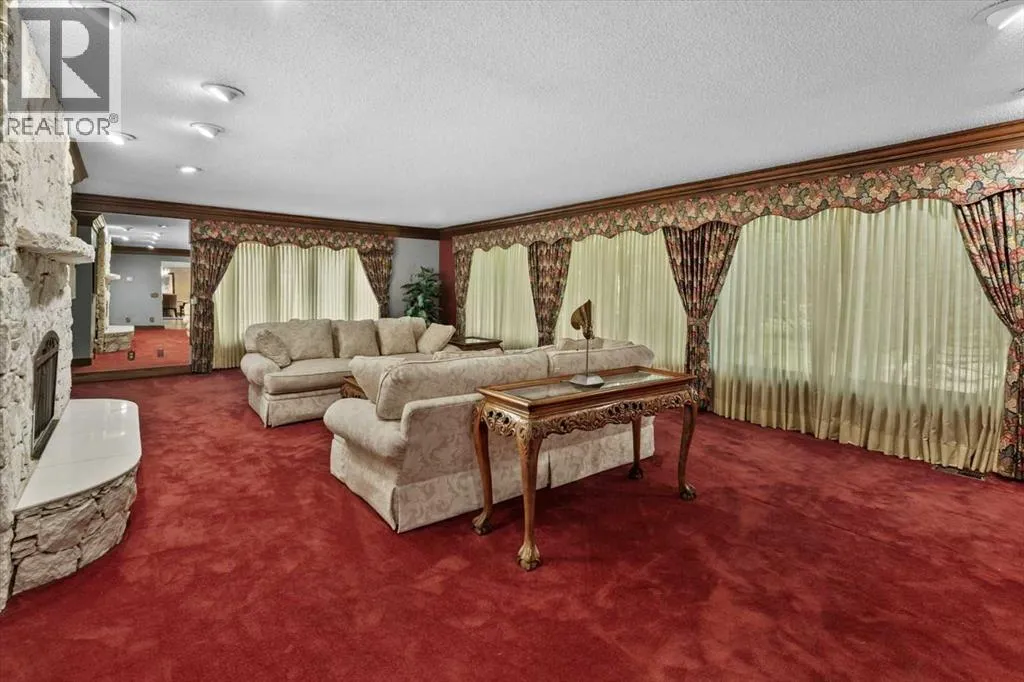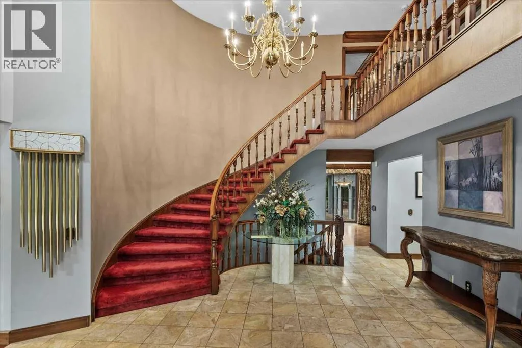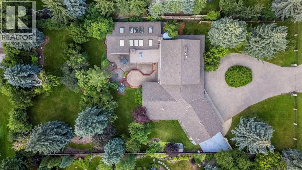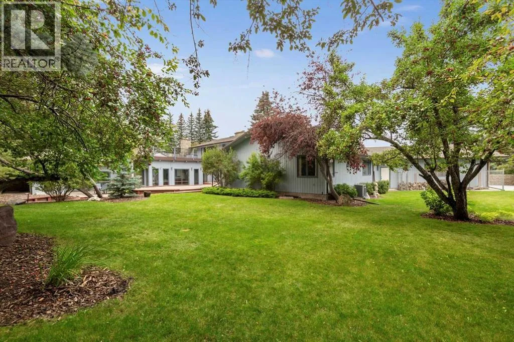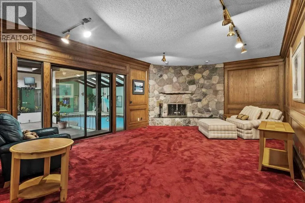 Extremely rare opportunity to own one full Acre of land, a truly unique estate property nestled in a lush park like setting, private grounds in one of Southwest Calgaryâs most coveted communities- Pump Hill. Surrounded by mature trees and located directly across from a tranquil green space, this sprawling family home offers 5 spacious bedrooms, with over 9,000 (pool area included) square feet of living space awaiting your dream renovation.From the moment you step inside, the grand two-storey foyer with its sweeping curved staircase sets the tone for the home's timeless charm and generous proportions. The main floor features expansive formal living and dining rooms, a chef-inspired kitchen with professional-grade gas range, and an informal dining nook overlooking the gardens. A warm and inviting family room is finished with rich wood paneling and a striking corner stone fireplaceâperfect for gathering with family or hosting guests.The indoor swimming pool complex includes a hot tub, sauna, and a dedicated fitness areaâall housed in a bright, skylit pavilion that brings the outdoors in, year-round. Currently decommissioned, the indoor pool complex could be returned to its former glory or re-envisioned as a golf simulator, sport court, artists studio, collectable car display or hobby room.Three spacious bedrooms, each with its own ensuite, are thoughtfully located on the main level. Upstairs, a private primary retreat offers a peaceful escape, complete with a sunny balcony and large ensuite featuring a stylish freestanding soaker tub and a large walk-in shower. A fifth bedroom with powder room and a handsome library overlooking the foyer complete the upper level.The lower level is a nod to retro glamour, boasting a groovy naugahyde bar and lounge, games room with pool table, expansive recreation room with brick archway and wrought iron accents, a large media room and a wine cellar.Outside, the beautifully landscaped backyard is a true extension of the home, with m ultiple levels of paver stone patios for lounging and dining, a built-in fireplace, lower-level gas fire pit with seating, and gardens of established perennials, lush lawns and mature trees. This spacious yard could easily accommodate a hockey rink, basket ball, pickle ball or tennis courts.The circular front drive welcomes guests in style at the double carved-wood front entry doors, that lead to an attached 4-car heated garage with plenty of room for vehicles and all your gear. Beside the garage thereâs an RV pad or the perfect place to store your sailboat.Ideally located near great shopping, dining, and amenities, this exceptional estate is also just minutes from the Glenmore Park and Reservoir, Glenmore Sailing Club, and Calgaryâs extensive pathway system. With easy access to downtown and major roadways, this is inner-city estate living at its finestârarely available and truly unforgettable. (id:27476)