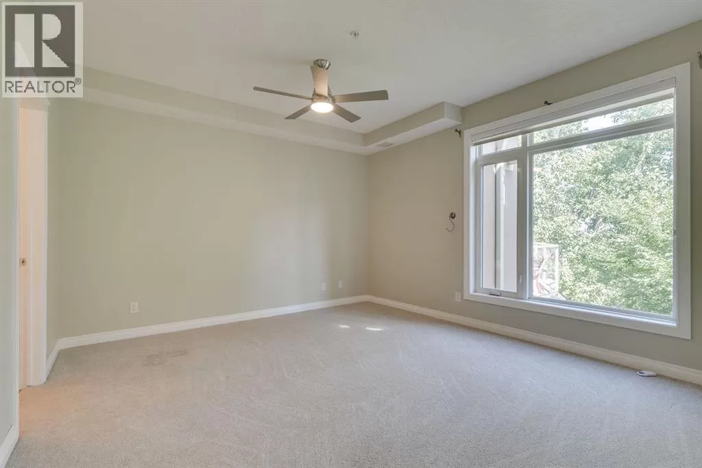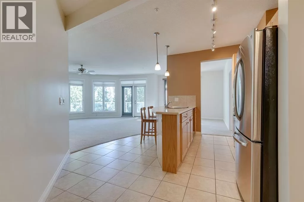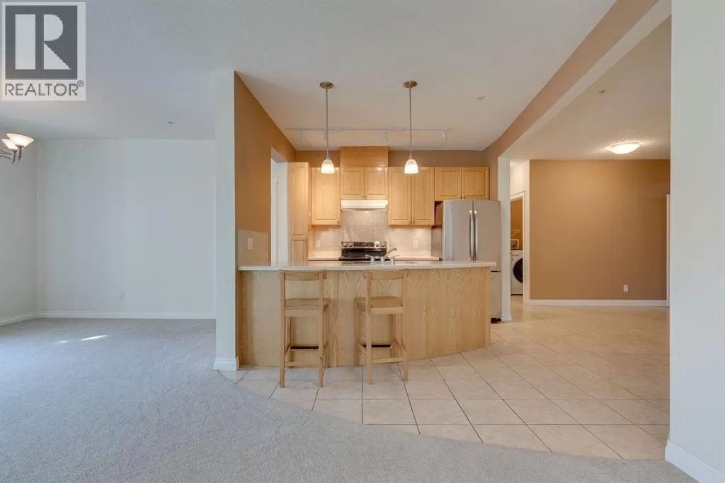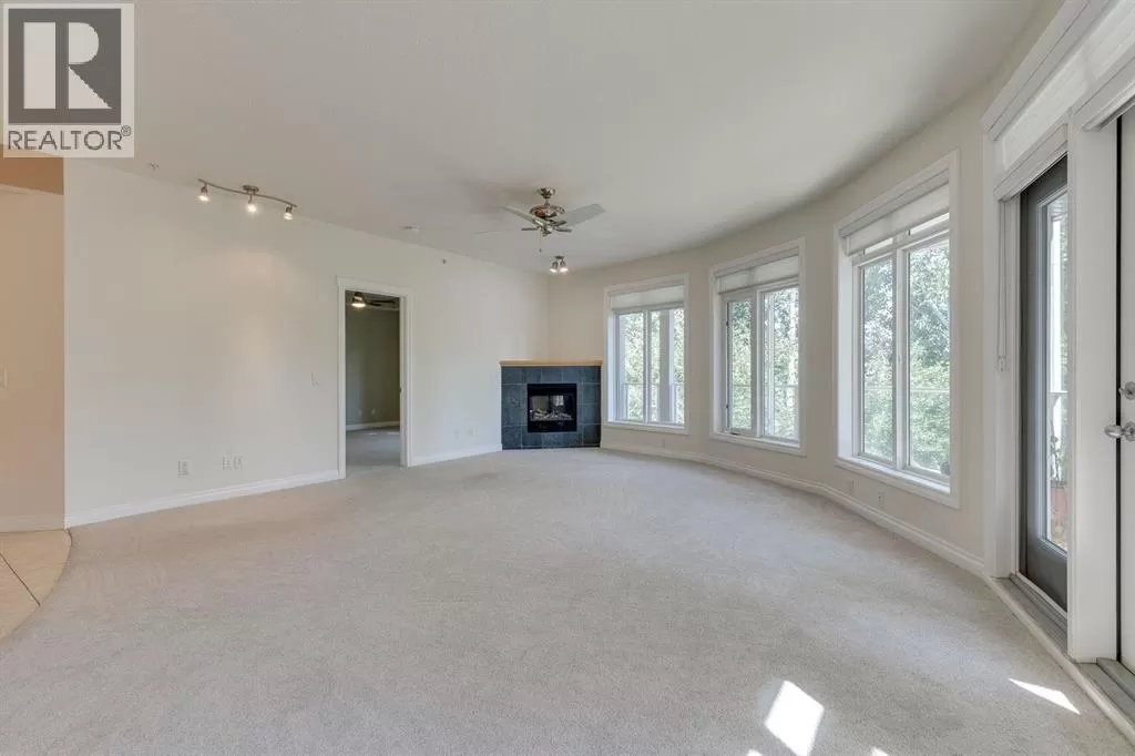 Discover this stunning 1,485+ sq ft corner unit with a wrap-around balcony offering serene, tree lined views overlooking Shaganappi Golf Course. Flooded with natural light, this beautiful home combines style, space, and sophistication in one of the cityâs most desirable locations. Step into a welcoming foyer that leads to a private den, complete with elegant bevelled glass doors and a custom built-in bookcase; perfect for a home office or reading retreat. The expansive living room showcases a stylish gas fireplace with a wood and slate surround, complemented by upgraded lighting and panoramic windows that span the living and dining areas. The kitchen is ideal for entertaining, featuring Corian countertops, a large breakfast bar, and seamless flow into the adjacent dining space. The primary suite is a true retreat, offering a custom walk-in closet with built-in organizers and a luxurious 5pc ensuite, complete with his & hers sinks, a corner soaker tub, and separate shower. The second bedroom includes a walk-through closet with access to a shared 4pc bath, perfect for guests or family. Additional features include a laundry room, plush carpeting throughout, and Hunter Douglas Silhouette window treatments for a polished, upscale finish. This unit also comes with 2 titled, side by side parking stalls. Residents enjoy access to premium amenities including a fitness centre, games room, car wash, storage room, all conveniently located in Building 24.Ideally situated just minutes from the Greek Hellenic Centre, Westbrook Mall, the West LRT, schools, parks, downtown, and outdoor gems like Edworthy Park, Douglas Fir Trail, the Bow River, and nearby off-leash areas. An exceptional opportunity for active, discerning buyers seeking space, convenience, and a beautiful natural setting. This home truly has it all. (id:27476)