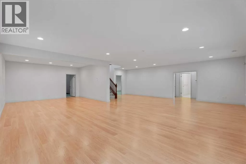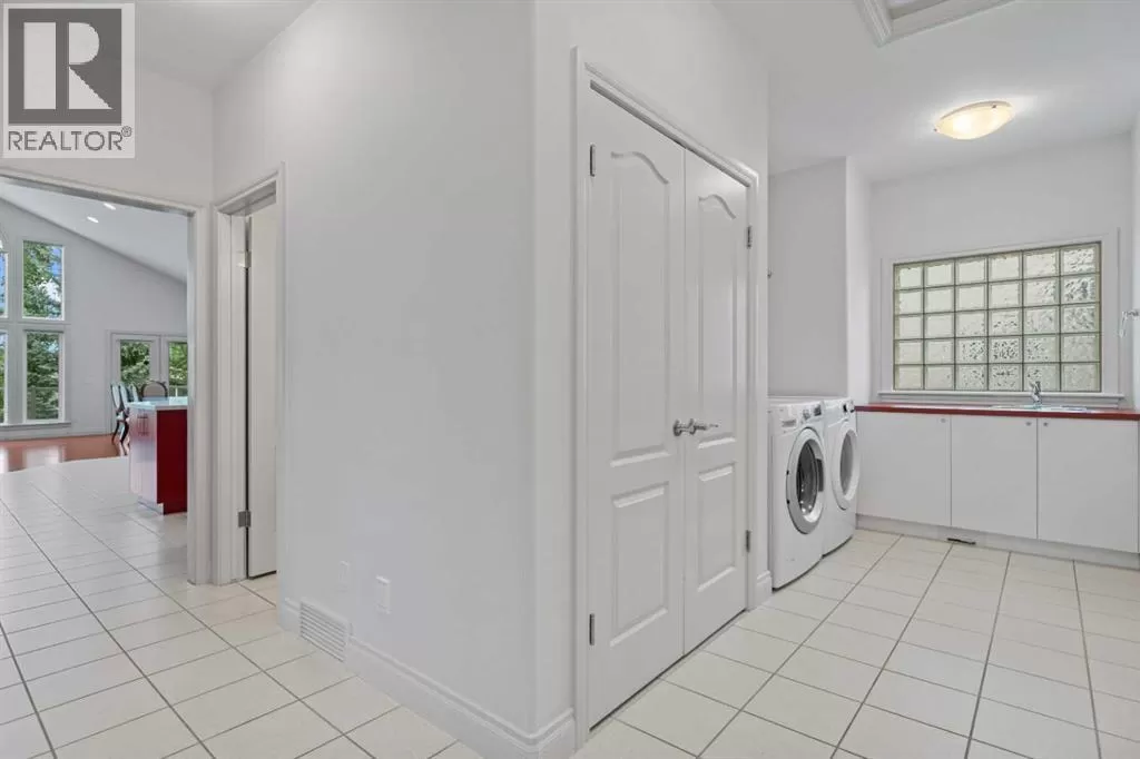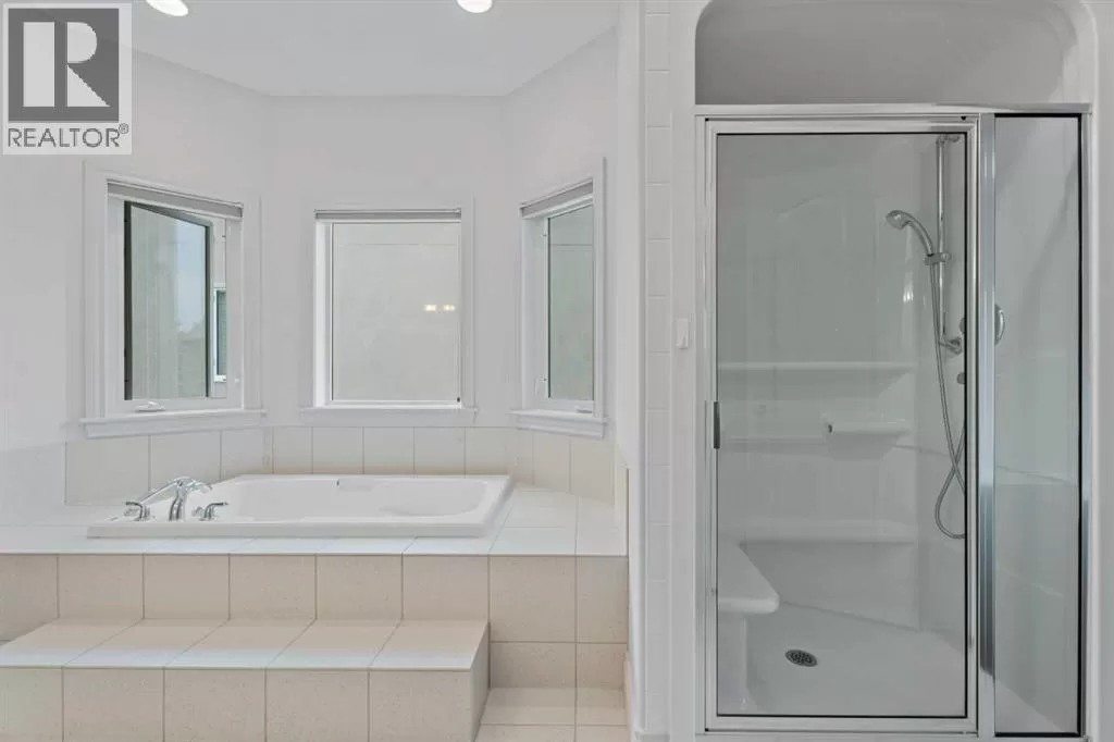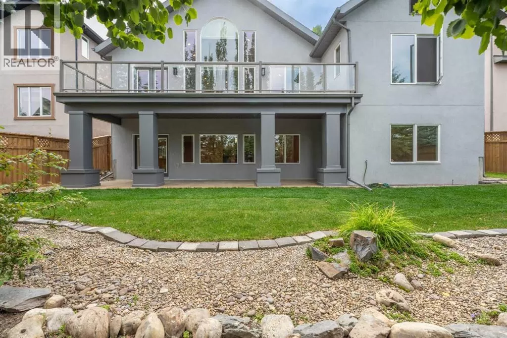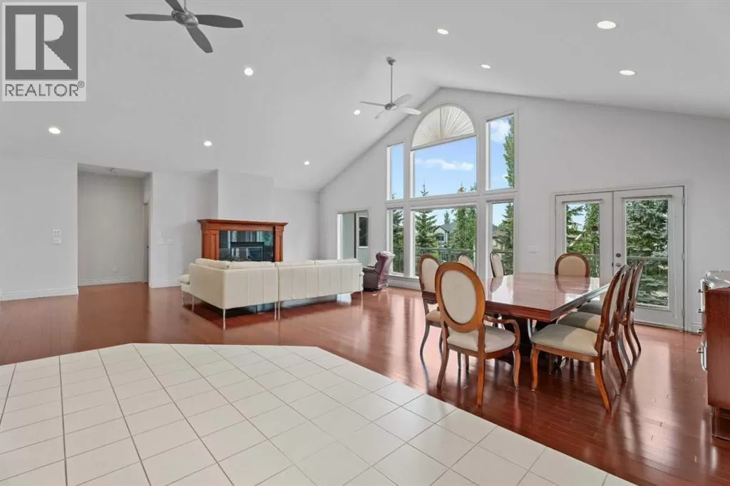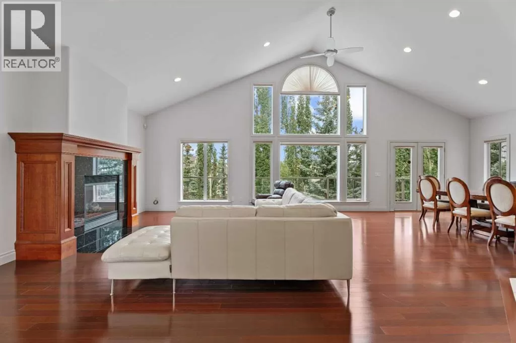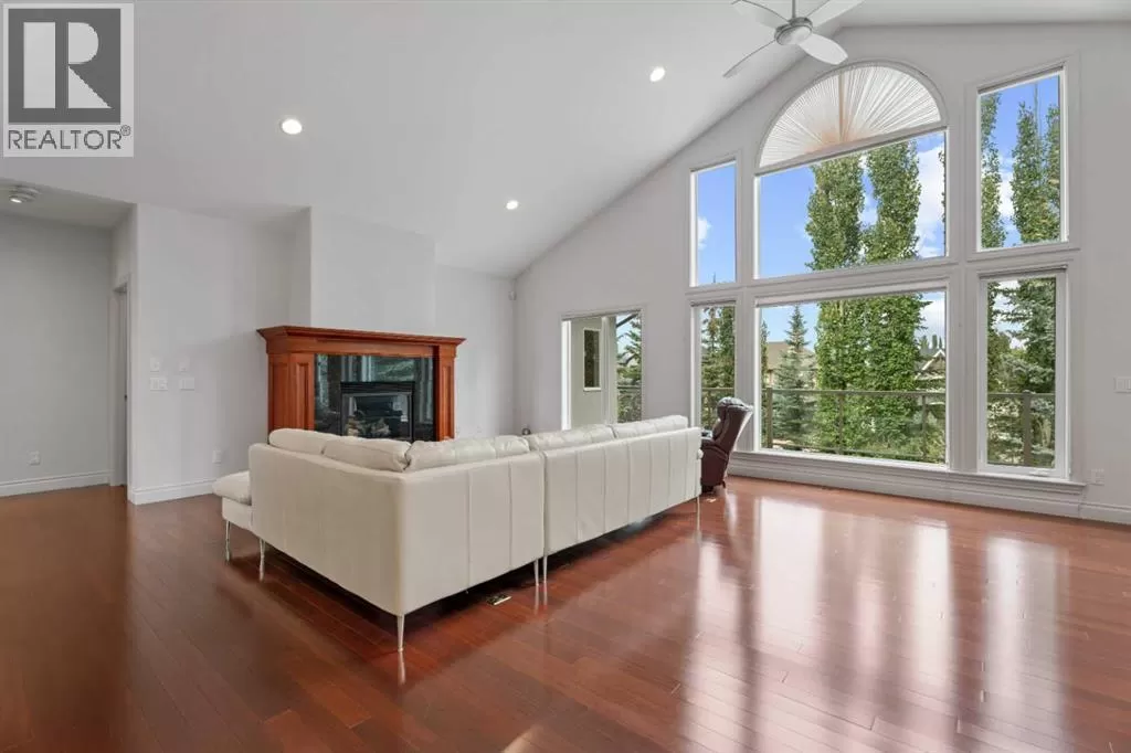 Welcome to this exceptional estate residence in the prestigious community of Aspen, perfectly situated on a beautifully landscaped 8,471 sq. ft. lot that offers privacy, mature trees, and no homes directly behind. This immaculate bungalow showcases timeless craftsmanship with over 4,600 sq. ft. of living space, thoughtfully designed for both everyday comfort and elegant entertaining. From the moment you arrive, the home makes a statement with its oversized triple garage, a newly refinished driveway with ample room for additional parking, and stunning curb appeal that sets the tone for whatâs inside. Step into the main level where soaring vaulted ceilings and expansive windows create a bright, airy atmosphere that is both warm and inviting. The open floor plan flows seamlessly between the living, dining, and kitchen areas, highlighted by a large deck that extends the living space outdoors and overlooks the lush, private backyard. A spacious front office with a nearby 4-piece bath provides the ideal work-from-home setup or easily functions as a second main-floor bedroom. The primary retreat is tucked away for privacy and comfort, featuring a generous 5-piece ensuite with dual vanities, a separate soaker tub and shower, and a private water closet. A large laundry and mudroom with sink adds practicality, while the thoughtful layout ensures convenience throughout. The professionally developed walkout basement nearly doubles the living space, offering a massive recreation and games room perfect for family gatherings or entertaining guests. Comfort is paramount with two dedicated in-floor heating zonesâone for the bedroom wing, which includes two spacious bedrooms and a 4-piece bathroom, and another for the expansive recreation space. A freshly sealed lower-level patio opens onto the meticulously maintained backyard, where mature landscaping, newer fencing, and carefully designed outdoor spaces create a peaceful oasis. Additional highlights of this home include central air conditioning for year-round comfort, a water softener, built-in central vacuum with attachments, and abundant storage space. Every detail reflects the pride of ownership and meticulous care that has gone into maintaining this home. Combining an enviable location in Aspenâs sought-after estate area with a rare blend of space, privacy, and elegance, this residence offers a truly unique opportunity to own a forever home in one of Calgaryâs premier communities. (id:27476)