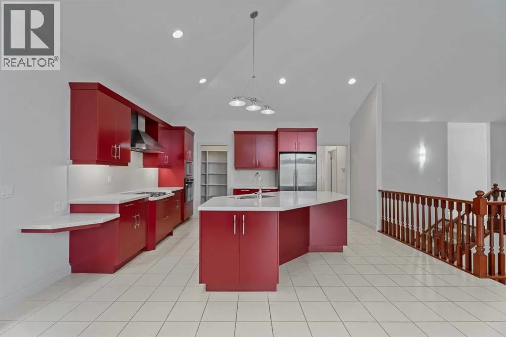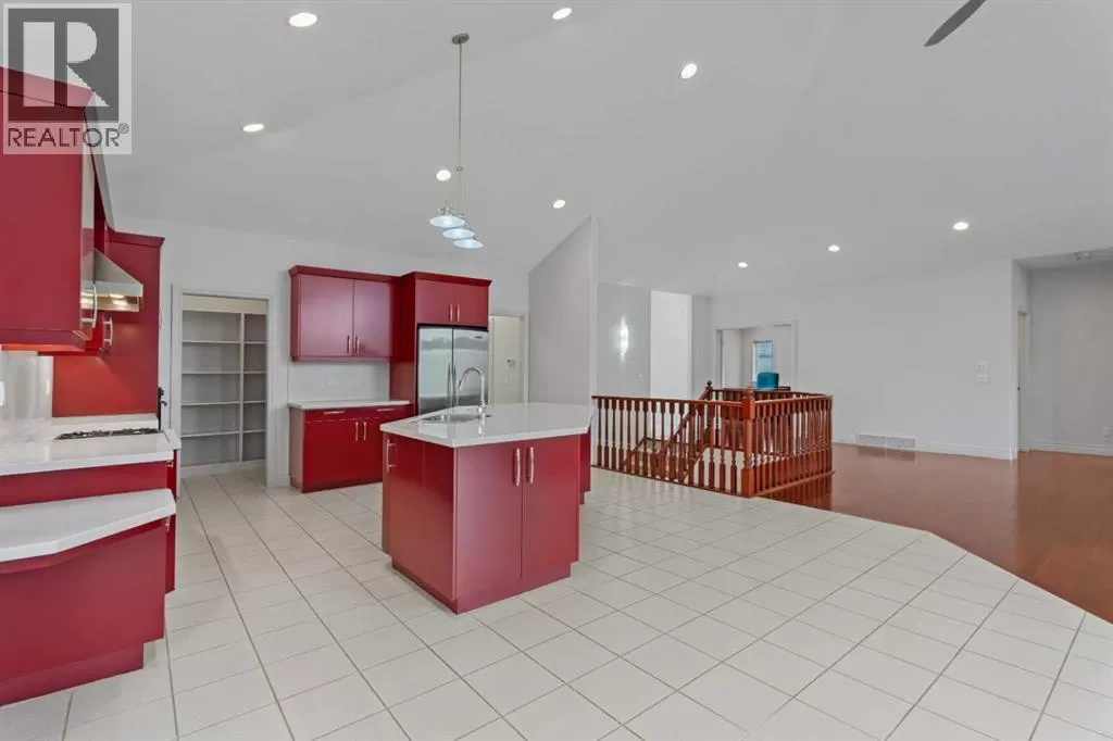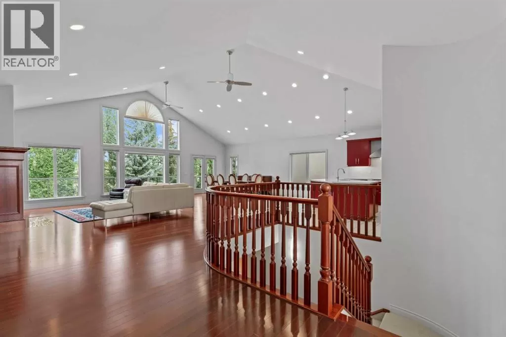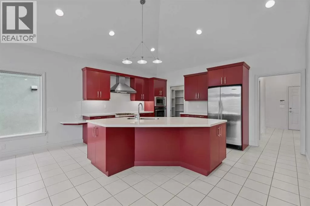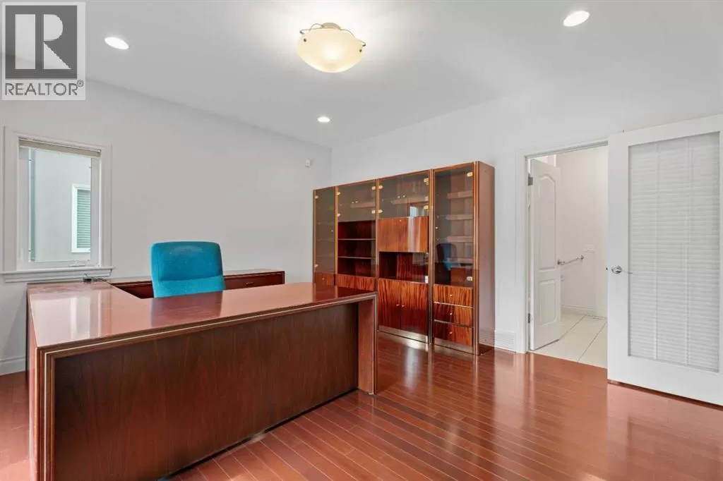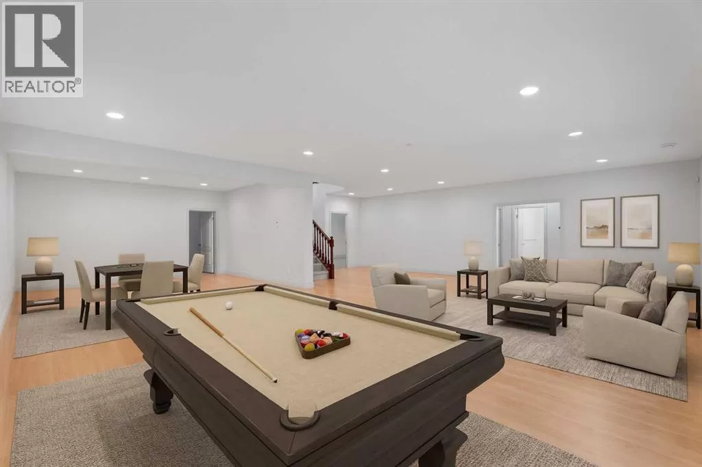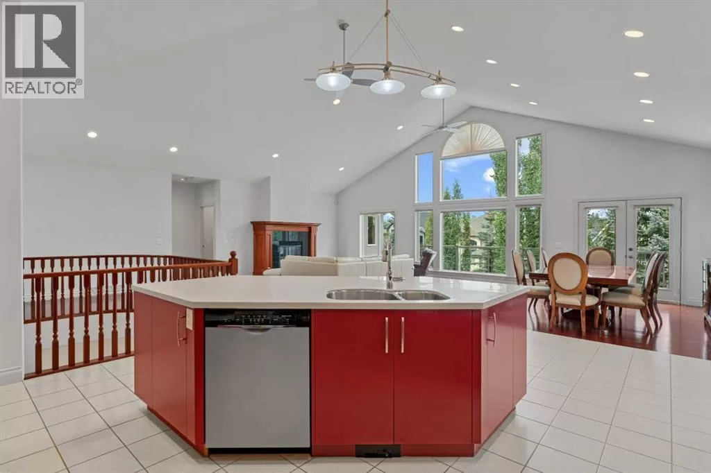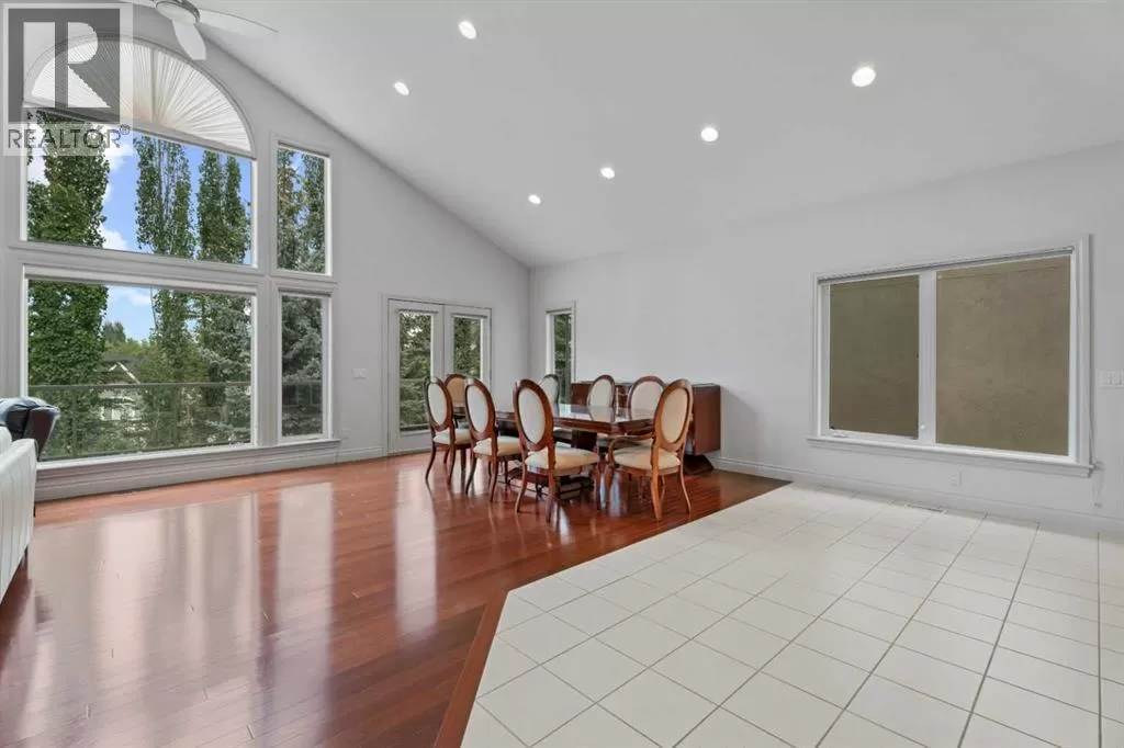 Welcome to this exceptional estate residence in the prestigious community of Aspen, perfectly situated on a beautifully landscaped 8,471 sq. ft. lot that offers privacy, mature trees, and no homes directly behind. This immaculate bungalow showcases timeless craftsmanship with over 4,600 sq. ft. of living space, thoughtfully designed for both everyday comfort and elegant entertaining. From the moment you arrive, the home makes a statement with its oversized triple garage, a newly refinished driveway with ample room for additional parking, and stunning curb appeal that sets the tone for whatâs inside. Step into the main level where soaring vaulted ceilings and expansive windows create a bright, airy atmosphere that is both warm and inviting. The open floor plan flows seamlessly between the living, dining, and kitchen areas, highlighted by a large deck that extends the living space outdoors and overlooks the lush, private backyard. A spacious front office with a nearby 4-piece bath provides the ideal work-from-home setup or easily functions as a second main-floor bedroom. The primary retreat is tucked away for privacy and comfort, featuring a generous 5-piece ensuite with dual vanities, a separate soaker tub and shower, and a private water closet. A large laundry and mudroom with sink adds practicality, while the thoughtful layout ensures convenience throughout. The professionally developed walkout basement nearly doubles the living space, offering a massive recreation and games room perfect for family gatherings or entertaining guests. Comfort is paramount with two dedicated in-floor heating zonesâone for the bedroom wing, which includes two spacious bedrooms and a 4-piece bathroom, and another for the expansive recreation space. A freshly sealed lower-level patio opens onto the meticulously maintained backyard, where mature landscaping, newer fencing, and carefully designed outdoor spaces create a peaceful oasis. Additional highlights of this home include central air conditioning for year-round comfort, a water softener, built-in central vacuum with attachments, and abundant storage space. Every detail reflects the pride of ownership and meticulous care that has gone into maintaining this home. Combining an enviable location in Aspenâs sought-after estate area with a rare blend of space, privacy, and elegance, this residence offers a truly unique opportunity to own a forever home in one of Calgaryâs premier communities. (id:27476)