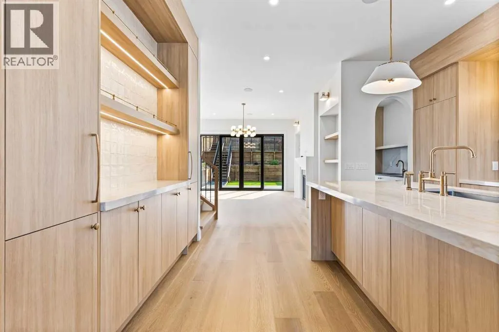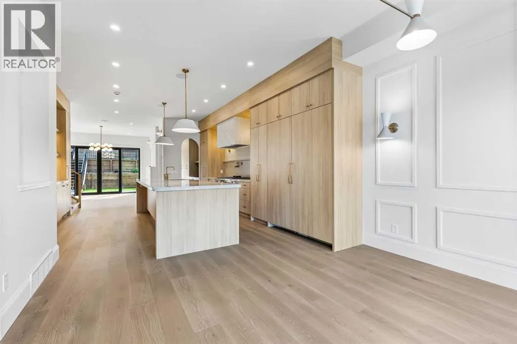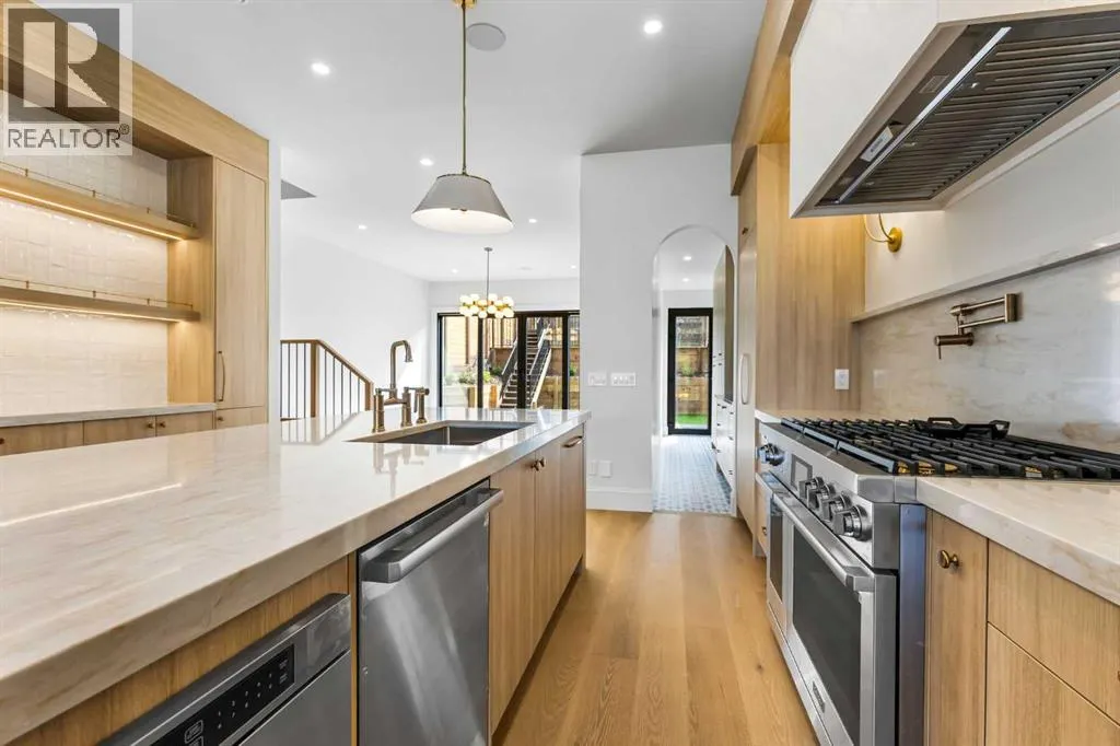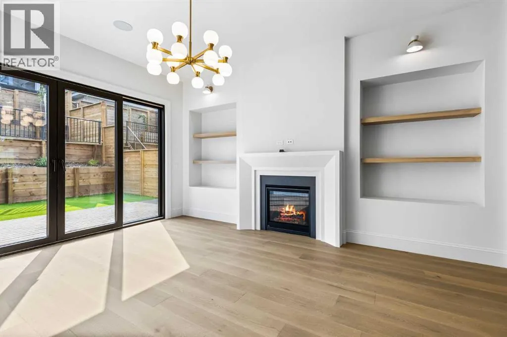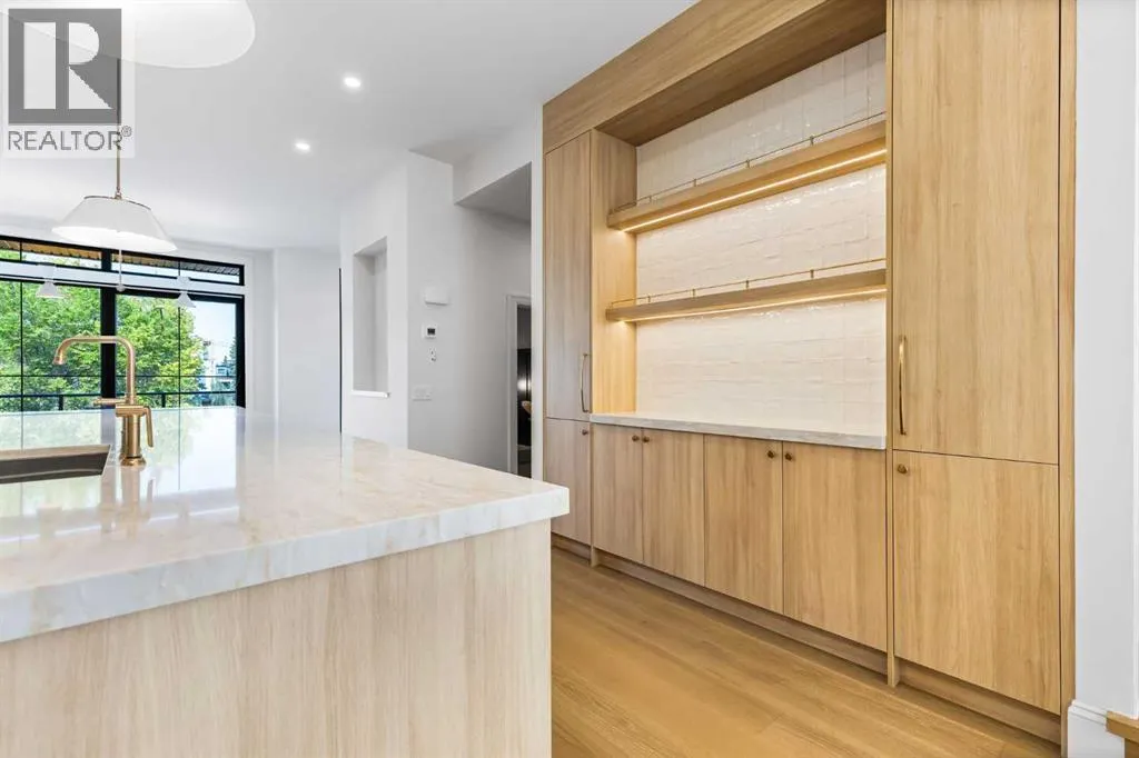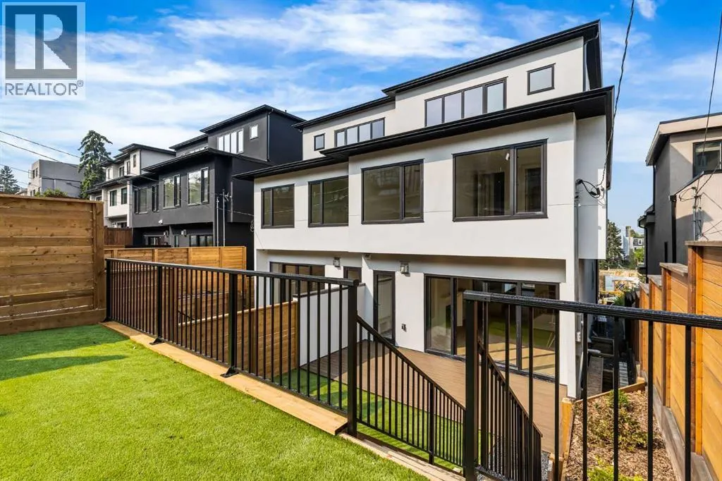 Experience quiet luxury at its finest in this stunning three-storey home, set on one of the highest points in Calgary with uninterrupted skyline views from all levels, and steps from Marda Loop. The exterior makes a striking first impression with its blend of classic white brick detailing, black accents, and timeless stucco. The curb appeal is enhanced by clean glass railings, low-maintenance landscaping, and a welcoming front balcony. Step into a beautiful and functional foyer, complete with custom built-in millwork, a bench, and smart storage including hanging compartments, open shelving, and pull-out drawers. The open-concept design includes a dedicated dining area surrounded by massive sliding doors that lead to the balcony. This is styled for intimate dinners, elevated entertaining, or just enjoying a coffee with stunning skyline views.At the heart of the home, the chefâs kitchen is a true masterpiece. It features a 14-foot island with quartz, a quartz backsplash, plaster textured hood fan, pot filler, and oversized premium appliances including a 48â dual oven gas range and a 66â built-in fridge/freezer. There is a butlerâs pantry with sink and cabinetry, mud room, coffee bar, and tons of storage including under the island. The kitchen is set up to be not only beautiful but also functional and includes a garbage drawer, bar cooler, and spice racks/cabinetry. Across from it, the living room centers around a beautiful fireplace and custom built-ins which make it cozy, refined, and made for real living. Large doors lead to the deck and the sunny south facing backyard, that is tiered, turfed and truly low maintenance. Throughout the home, youâll enjoy tons of natural sunlight from the large windows, 10-foot high ceilings, arched transitions, and wide-plank engineered hardwood create a warm and elevated flow.Upstairs, the primary suite is a serene retreat with a spa-like ensuite featuring a steam shower, dual vanity, custom tilework, and skyline views. Seconda ry bedrooms are generously sized, each with walk-in closets, and connected by a stylish bathroom ideal for kids or guests.The third level includes a beautiful rooftop patio where you can soak in the skyline views, a stylish bathroom with nice finishes, a rec/living area with built-in storage and a gas fireplace. There is a large wet bar with LED lighting in the cabinetry, beatiful tile, shelves and bar fridge. This is the ultimate entertaining area to host friends and family.The fully finished basement extends the living space with heated floors roughed-in, a large flex room or guest suite, and full bathroom. Additional features include a heated double attached garage with epoxy flooring, integrated speakers and security system, central A/C, roughed-in heated driveway.Whether you're enjoying a quiet morning in the sun, hosting friends on the rooftop, or watching the city light up at night, this home was built for a lifestyle thatâs elevated and timeless. (id:27476)