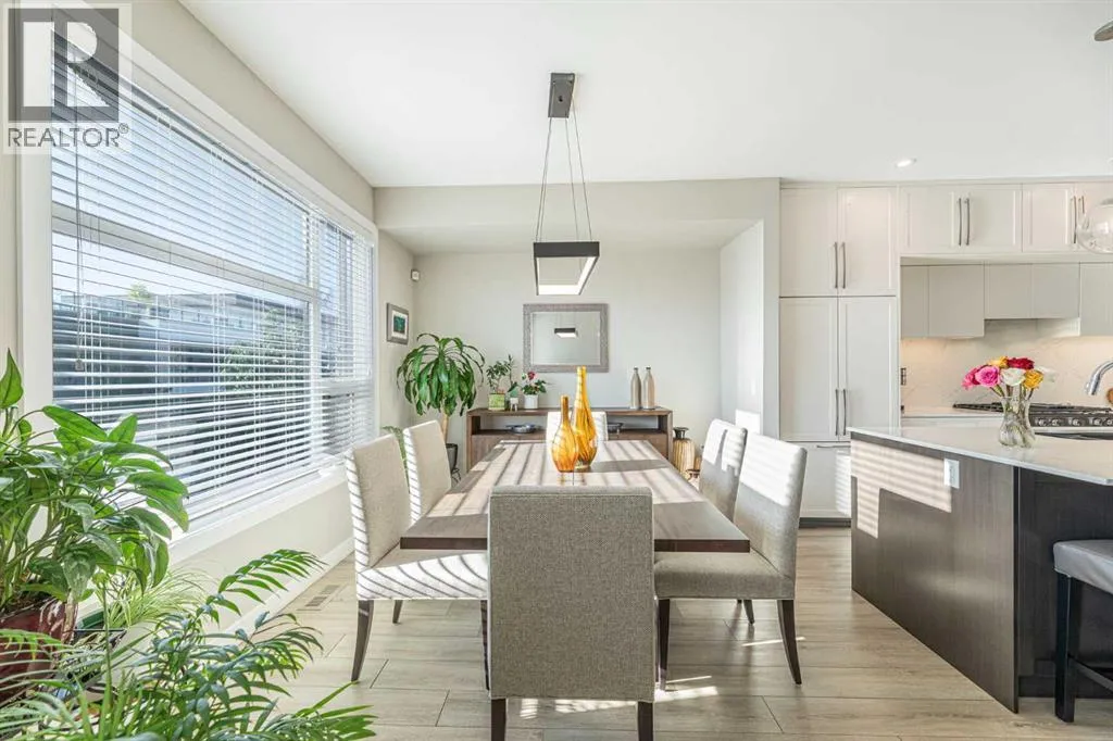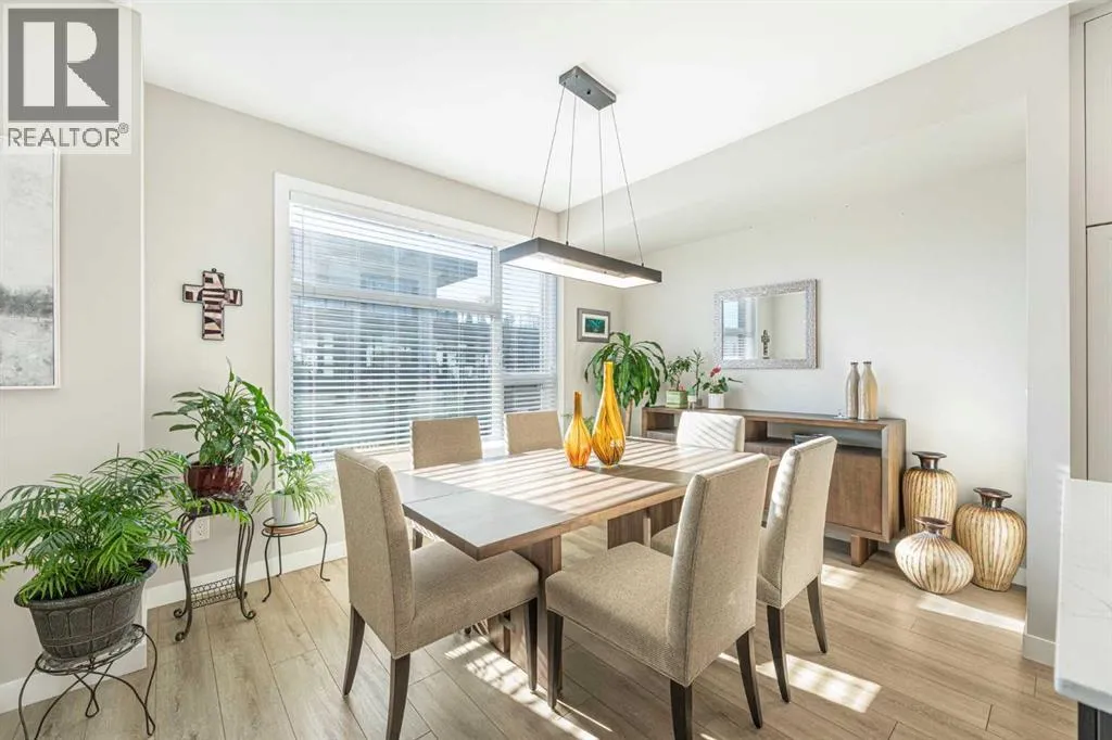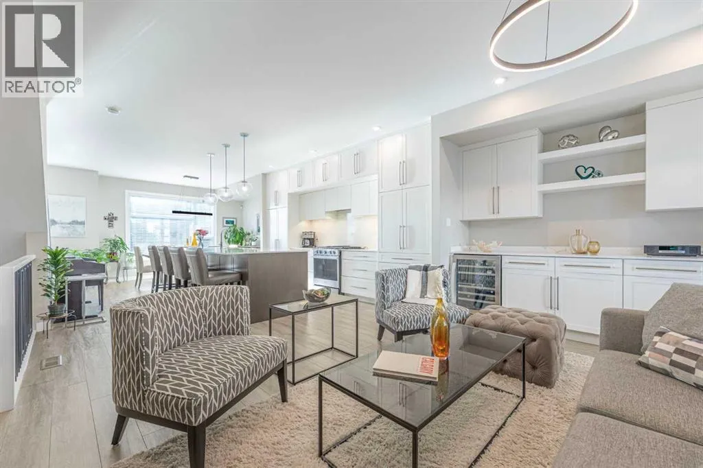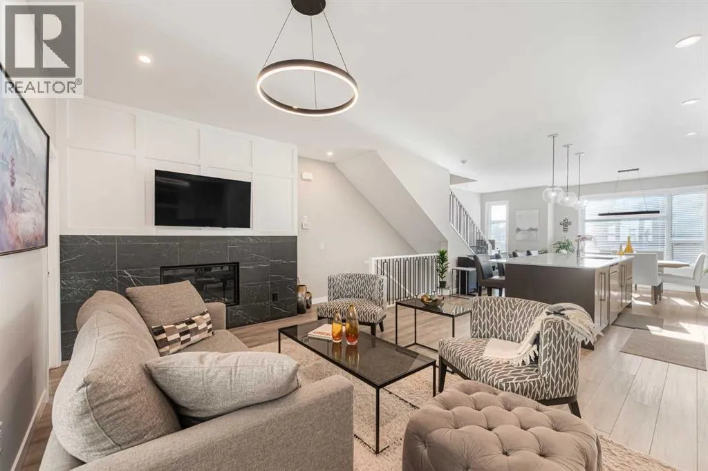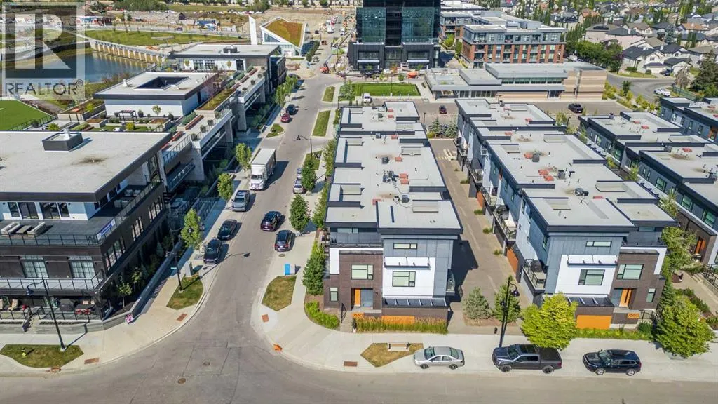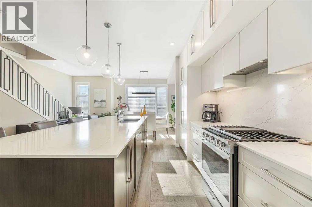 Welcome to this stunning original owner townhome located in the sought-after West District in West Springs. This beautifully upgraded 1,763 sq ft home offers a modern lifestyle with exceptional convenience and design. Step into a spacious entry foyer on the lower level, large enough to comfortably accommodate a home office, additional sitting area, or even exercise equipment. Thoughtfully designed with custom built-in cupboards for storage and direct access to the finished double attached garage, this space is both functional and versatile. The main level impresses with luxury vinyl plank flooring throughout, high ceilings, and an open-concept layout filled with natural light. The chef-inspired kitchen features full height cabinetry, deep storage in the oversized island, quartz countertops and backsplash, a gas range, and a built-in, integrated refrigerator for a sleek, modern finish. Adjacent to the kitchen is a built-in bar or coffee station with a wine fridge. The bright and spacious living room boasts a beautiful fireplace and opens onto a private balcony, perfect for relaxing. The generous dining area easily fits a large table, creating a seamless flow for both daily living and entertaining. Upstairs, youâll find three well-appointed bedrooms and two full bathrooms. The primary suite is a luxurious retreat with a custom walk-in closet and a spa-inspired ensuite featuring a dual floating vanity and luxury shower. A convenient stacked laundry is also located on this level. Enjoy being part of a vibrant community, just steps from top-rated schools, shopping, dining, fitness centres, and everyday amenities. Radio Park, opening in September, is walking distance from your front door and will span 8.4 acres, offering year-round activities, pathways, and a dedicated dog park for residents to enjoy. With close proximity to Winsport, city parks, and quick access to Highway 1, you're minutes from the mountains or downtown Calgary. (id:27476)