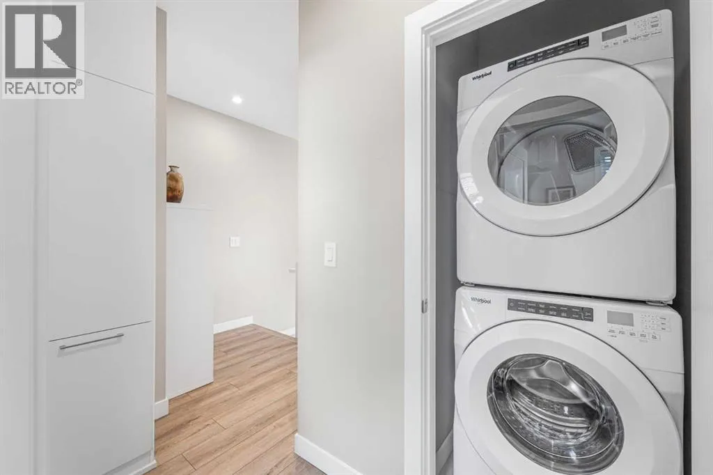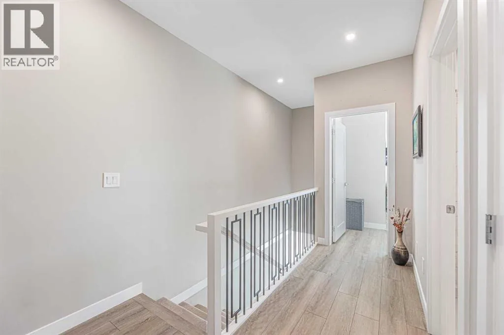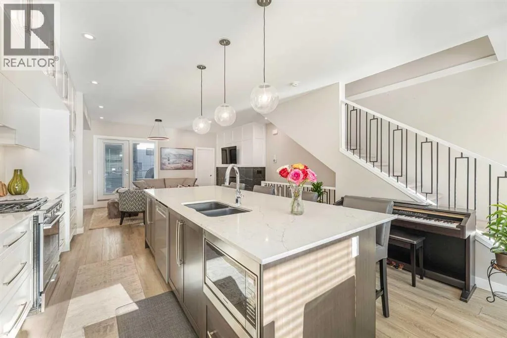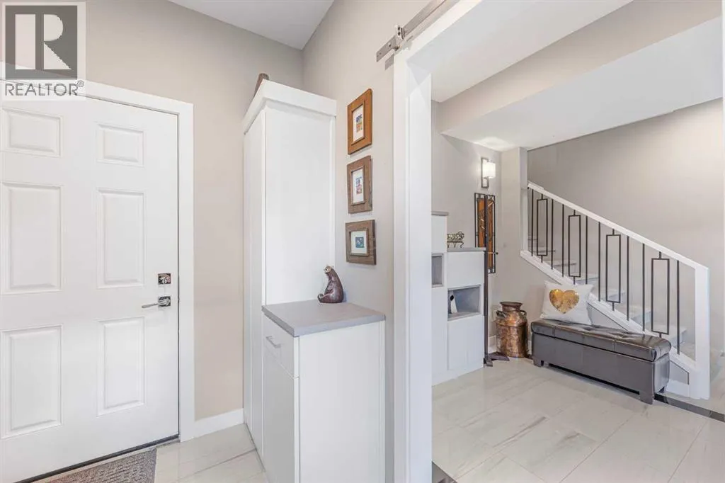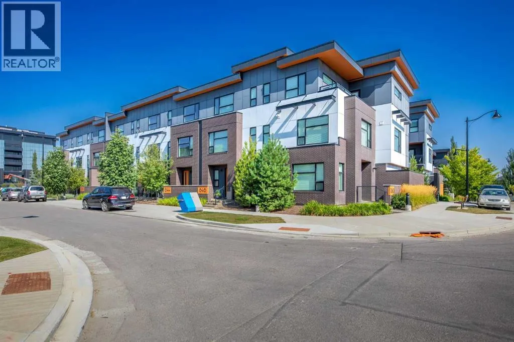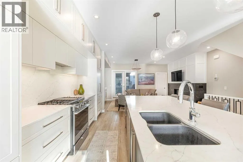 Welcome to this stunning original owner townhome located in the sought-after West District in West Springs. This beautifully upgraded 1,763 sq ft home offers a modern lifestyle with exceptional convenience and design. Step into a spacious entry foyer on the lower level, large enough to comfortably accommodate a home office, additional sitting area, or even exercise equipment. Thoughtfully designed with custom built-in cupboards for storage and direct access to the finished double attached garage, this space is both functional and versatile. The main level impresses with luxury vinyl plank flooring throughout, high ceilings, and an open-concept layout filled with natural light. The chef-inspired kitchen features full height cabinetry, deep storage in the oversized island, quartz countertops and backsplash, a gas range, and a built-in, integrated refrigerator for a sleek, modern finish. Adjacent to the kitchen is a built-in bar or coffee station with a wine fridge. The bright and spacious living room boasts a beautiful fireplace and opens onto a private balcony, perfect for relaxing. The generous dining area easily fits a large table, creating a seamless flow for both daily living and entertaining. Upstairs, youâll find three well-appointed bedrooms and two full bathrooms. The primary suite is a luxurious retreat with a custom walk-in closet and a spa-inspired ensuite featuring a dual floating vanity and luxury shower. A convenient stacked laundry is also located on this level. Enjoy being part of a vibrant community, just steps from top-rated schools, shopping, dining, fitness centres, and everyday amenities. Radio Park, opening in September, is walking distance from your front door and will span 8.4 acres, offering year-round activities, pathways, and a dedicated dog park for residents to enjoy. With close proximity to Winsport, city parks, and quick access to Highway 1, you're minutes from the mountains or downtown Calgary. (id:27476)