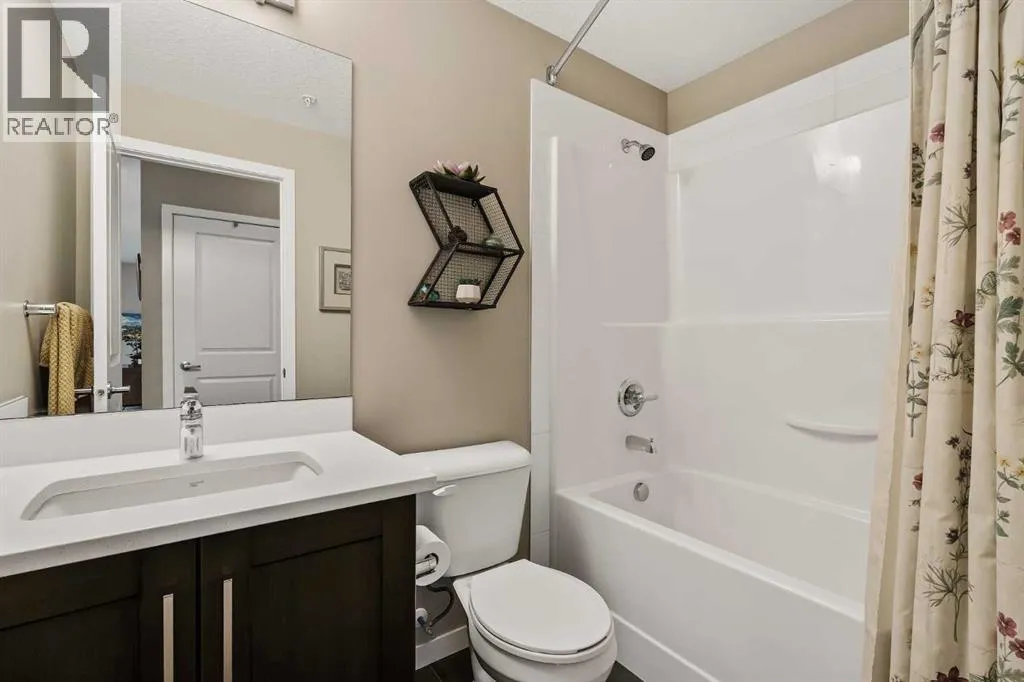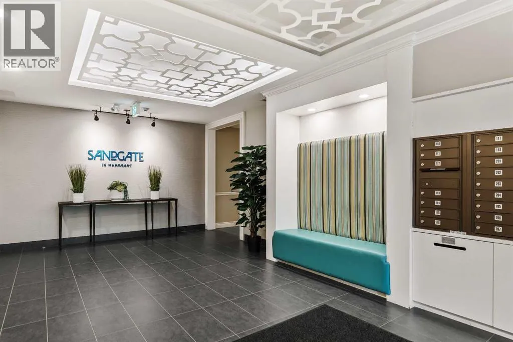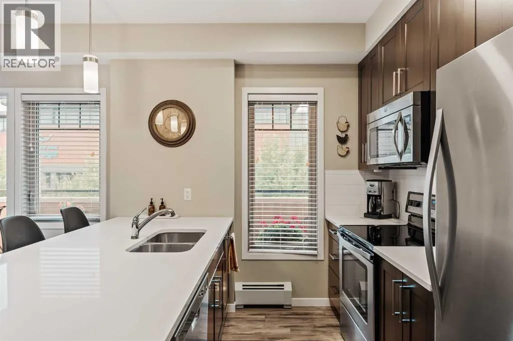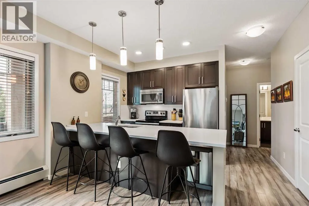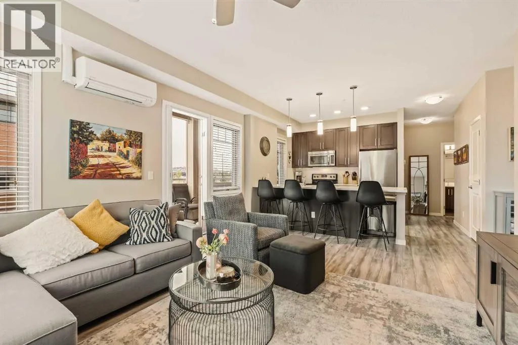 Welcome to Sandgate at Mahogany Lake. This custom built south east facing corner suite offers air conditioning and a private 36 by 6 foot deck that captures the sun throughout the day. The open concept layout features a bright living room with four large windows overlooking the courtyard and a stylish kitchen with quartz countertops, upgraded cabinets, a peninsula island, and premium stainless steel appliances. Two bedrooms and two full bathrooms are located on opposite sides of the living space for privacy, each with organized closet cabinetry. Residents enjoy exceptional amenities including a 1300 square foot fitness centre, a welcoming common area library, and two comfortable guest suites for visiting family and friends. Additional features include nine foot ceilings, luxury vinyl plank flooring, concrete construction, extra storage, and titled underground parking. All of this is set within award winning Mahogany, where you can enjoy year round recreation at Calgaryâs largest lake along with walkable access to Mahogany Village Market with its shops, cafés, and restaurants including Sobeys, Tim Hortons, State and Main, and the renowned Chairmanâs Steakhouse. (id:27476)
