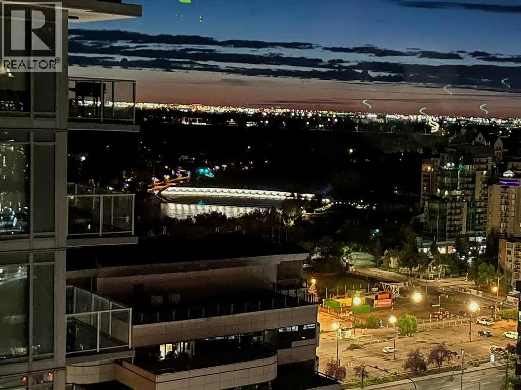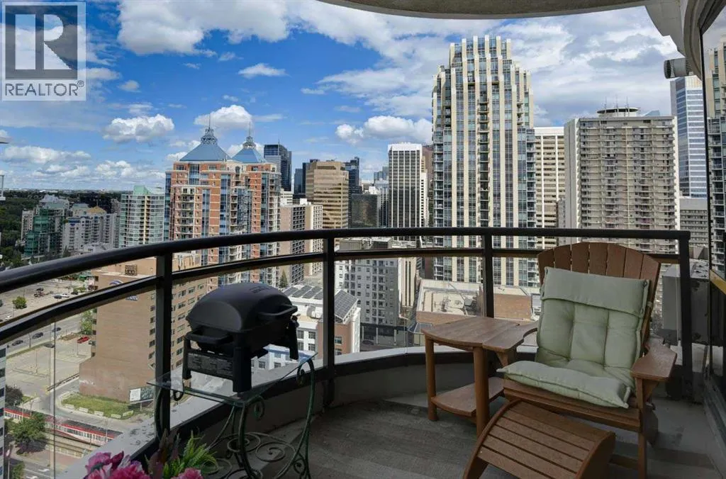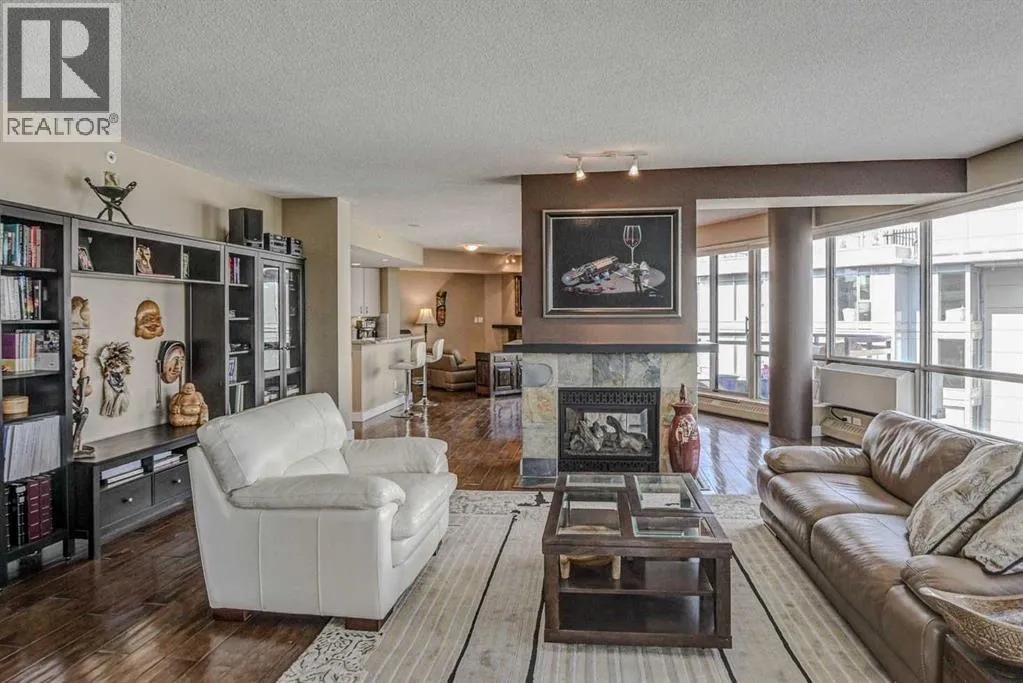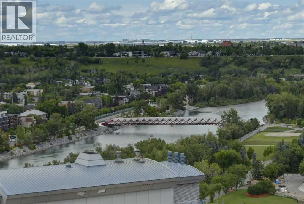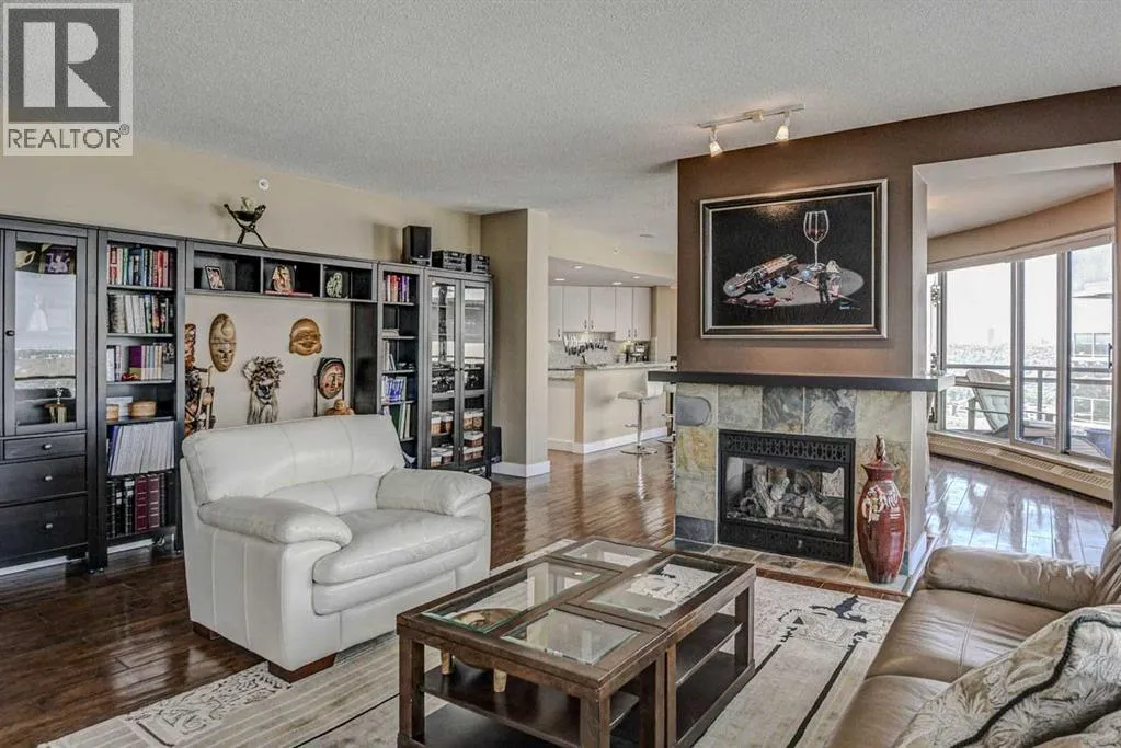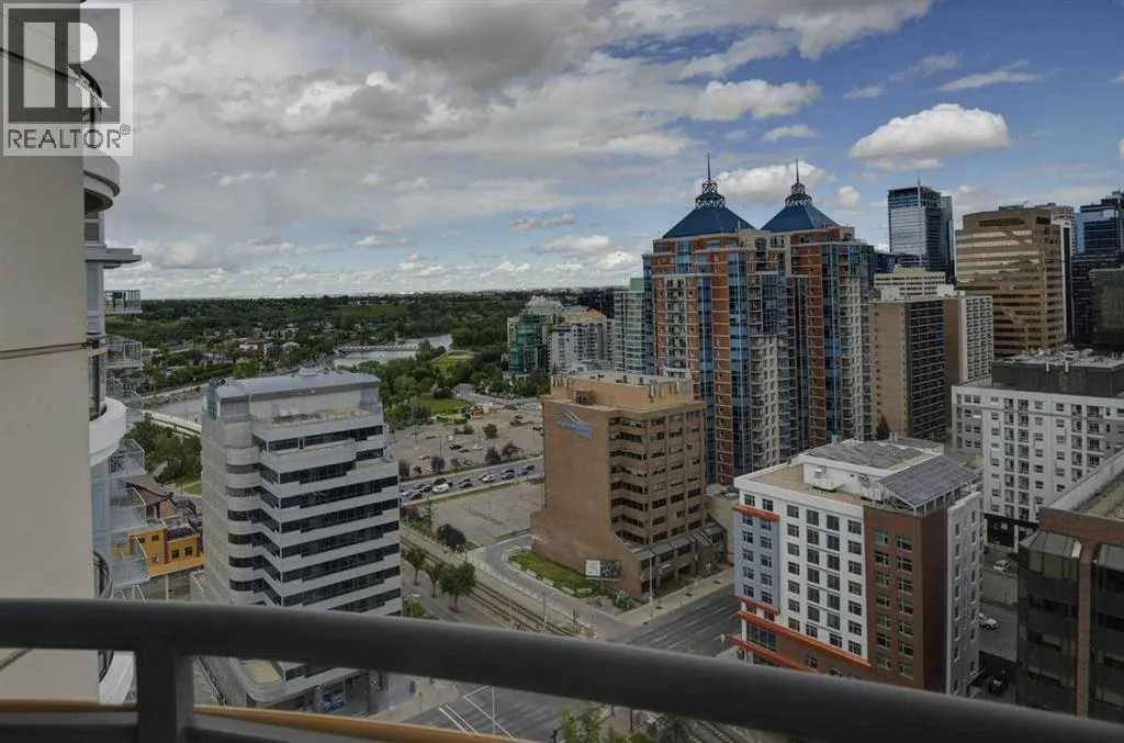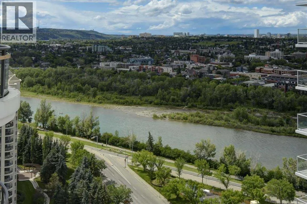 Perched high on the 24th floor of the McLeod at Riverwest building, this stunning 2-bedroom plus a den residence delivers sophisticated inner-city living with panoramic Bow River and skyline views. Spanning over 1,900 sq ft, the elegant curved floorplan wraps around floor-to-ceiling windows, flooding the home with natural light and showcasing a seamless blend of luxury and comfort. The renovated $30K kitchen is a chefâs dream with sleek granite countertops, Stove is double oven induction, stainless steel appliances, updated backsplash, garburator and a raised breakfast bar, all newly painted in crisp white. The living and dining rooms are elegantly anchored by a double-sided gas fireplace, creating a warm and connected atmosphere for entertaining or relaxing. Just off the kitchen, a cozy flex area features a second gas fireplace, a perfect spot to curl up with a book or enjoy a quiet moment away from the main living spaces. French doors lead to a quiet den ideal for remote work or a creative retreat. The primary suite is a tranquil haven with balcony access, dual closets and a 4-piece ensuite featuring in-floor heating and a bidet. The second bedroom is equally refined with its own 3-piece ensuite that includes a spa-style $8K steam shower. A stylish powder room, in-suite laundry with ample storage space, up/down blinds and engineered hardwood add further comfort and style. 3 Air conditioning split systems in the bedrooms and a window unit in the living room provide year-round climate control. Two assigned underground parking stalls and an additional storage unit ensure convenience and peace of mind. The expansive curved balcony offers unobstructed river, Peace Bridge and downtown views, a front-row seat to Calgaryâs finest! Residents of Riverwest enjoy access to premium amenities including a fitness centre, indoor pool, and recreation lounge. Set in the heart of the Downtown West End, this unbeatable location is steps to the Bow River Pathway, LRT station, vibrant Kensington and future Green Line. Walk or bike to cafés, shops and restaurants while enjoying all the vibrancy and ease of urban life. A rare opportunity to own a true retreat in the sky, this home offers upscale living in one of Calgaryâs most connected and scenic downtown communities! (id:27476)