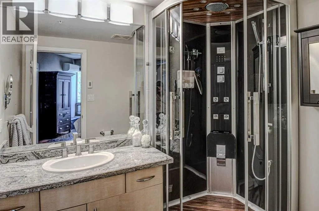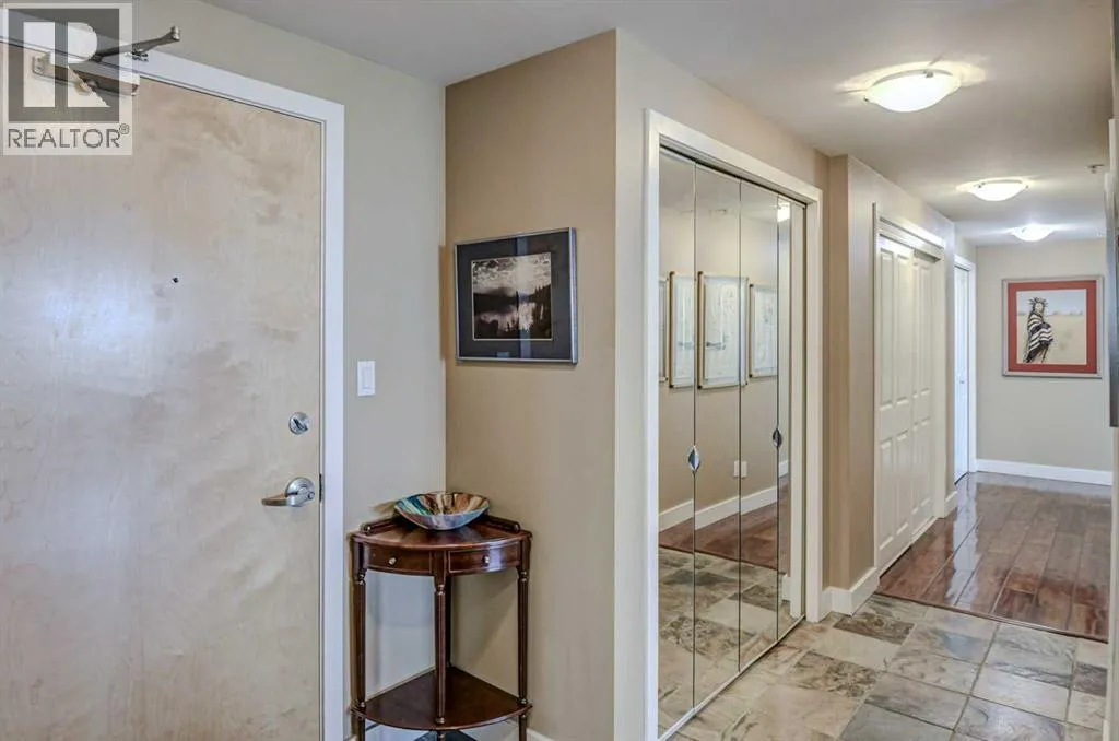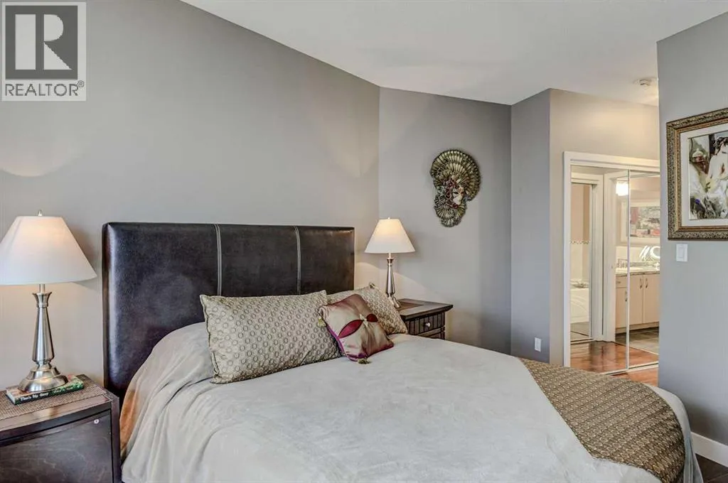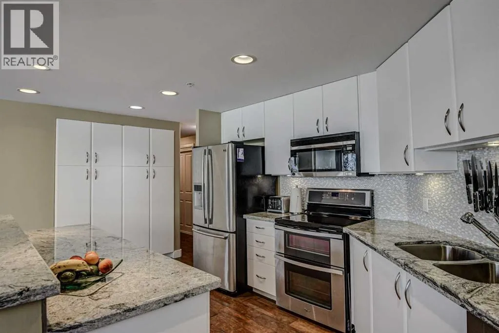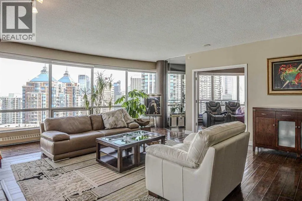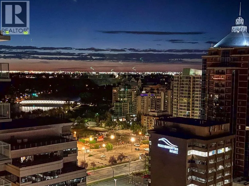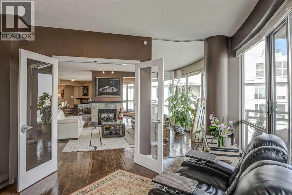 Perched high on the 24th floor of the McLeod at Riverwest building, this stunning 2-bedroom plus a den residence delivers sophisticated inner-city living with panoramic Bow River and skyline views. Spanning over 1,900 sq ft, the elegant curved floorplan wraps around floor-to-ceiling windows, flooding the home with natural light and showcasing a seamless blend of luxury and comfort. The renovated $30K kitchen is a chefâs dream with sleek granite countertops, Stove is double oven induction, stainless steel appliances, updated backsplash, garburator and a raised breakfast bar, all newly painted in crisp white. The living and dining rooms are elegantly anchored by a double-sided gas fireplace, creating a warm and connected atmosphere for entertaining or relaxing. Just off the kitchen, a cozy flex area features a second gas fireplace, a perfect spot to curl up with a book or enjoy a quiet moment away from the main living spaces. French doors lead to a quiet den ideal for remote work or a creative retreat. The primary suite is a tranquil haven with balcony access, dual closets and a 4-piece ensuite featuring in-floor heating and a bidet. The second bedroom is equally refined with its own 3-piece ensuite that includes a spa-style $8K steam shower. A stylish powder room, in-suite laundry with ample storage space, up/down blinds and engineered hardwood add further comfort and style. 3 Air conditioning split systems in the bedrooms and a window unit in the living room provide year-round climate control. Two assigned underground parking stalls and an additional storage unit ensure convenience and peace of mind. The expansive curved balcony offers unobstructed river, Peace Bridge and downtown views, a front-row seat to Calgaryâs finest! Residents of Riverwest enjoy access to premium amenities including a fitness centre, indoor pool, and recreation lounge. Set in the heart of the Downtown West End, this unbeatable location is steps to the Bow River Pathway, LRT station, vibrant Kensington and future Green Line. Walk or bike to cafés, shops and restaurants while enjoying all the vibrancy and ease of urban life. A rare opportunity to own a true retreat in the sky, this home offers upscale living in one of Calgaryâs most connected and scenic downtown communities! (id:27476)