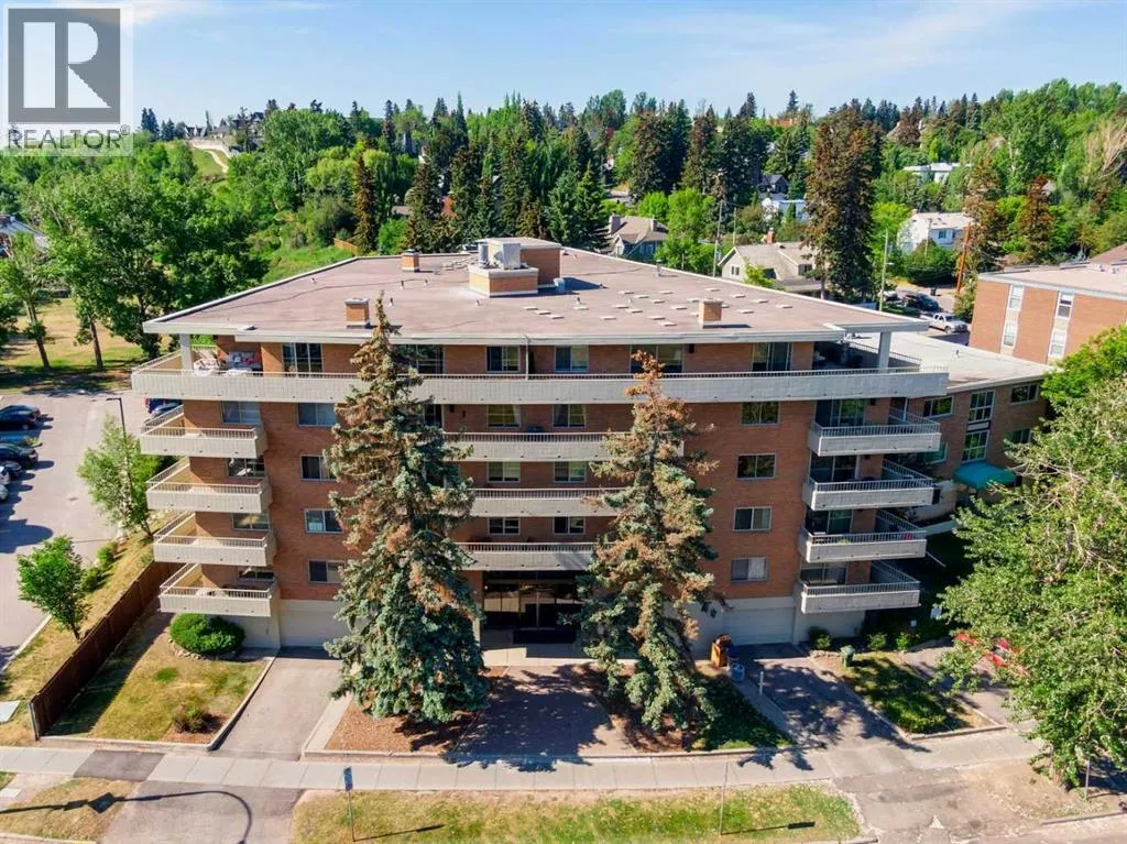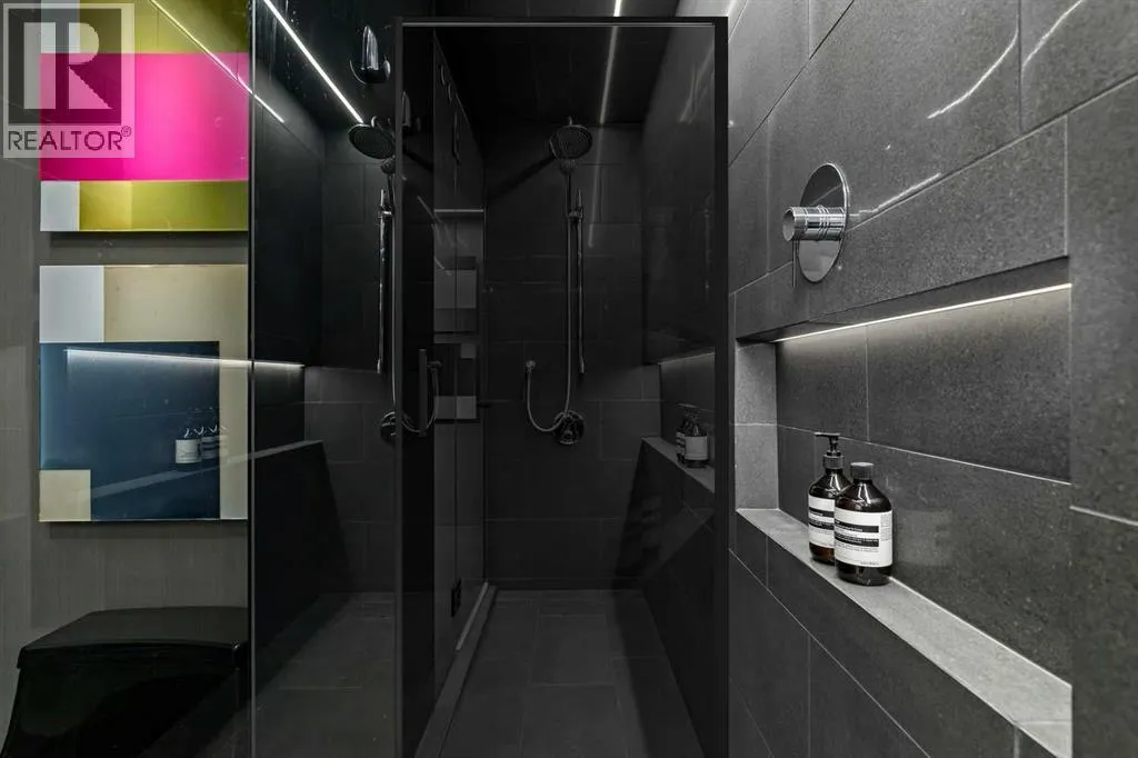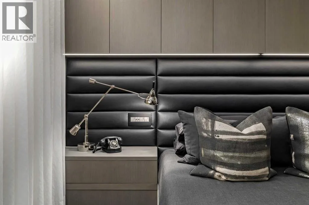 An unprecedented offering in Calgaryâs prestigious Mount Royal. Welcome to Palace Royale â a mid-century modern icon of concrete construction, meticulously revitalized with a new roof, boiler, elevator, and a fully restored exterior envelope. Perfectly poised steps from vibrant shops, galleries, cafés, and the downtown core, this residence fuses architectural pedigree with cosmopolitan living at its finest. Formerly a two-bedroom, the residence has been masterfully reimagined into a grand one-bedroom with an opulent dining salon â a bold design statement that can easily be converted back to 2 bedroom, if desired. Every inch of this 1,009 sq. ft. interior radiates luxury, with more than $300,000 invested in finishes and technology of uncompromising quality. The chefâs kitchen is a triumph of form and function: reconstructed oak millwork, striking black granite surfaces, and a fully integrated Miele ensemble â including built-in coffee station, steam and wall ovens, dishwasher, 32â induction cooktop with concealed Faber hood, and freestanding refrigerator/freezer. This is a kitchen designed not merely for cooking, but for performance. The living space is both dramatic and intimate, defined by architectural millwork, black glass accents, and LED illumination. Hidden at first glance, entertainment unfolds with a motorized 65â drop-down television, James Loudspeakers, subwoofer, and six-zone surround sound â transforming the room into a private cinema. The primary suite is pure indulgence: wall-to-wall wardrobes, a custom platform bed with integrated storage, leather-padded headboard accented with linear LED lighting, and a discreetly incorporated 55â television with Bluesound audio. The ensuite rivals world-class spas with bespoke cabinetry, a sculptural black-glass shower, Kohler fixtures, and a soaring mirror wall. The main bath is equally spectacular, anchored by a double porcelain Lappato tile shower with multiple showerheads encased in glass â an architectural cent erpiece rarely seen even in the cityâs most exclusive residences. Refinements extend throughout: porcelain Lappato flooring, triple-pane Lux windows, Ripplefold drapery with Hunter Douglas blinds, reverse-osmosis water filtration, soft water system, LeGrand lighting controls, and bespoke foyer millwork concealing pantry, coat, and shoe storage. Step outside to the wraparound south- and west-facing balcony, where lush treetop views give way to the glittering downtown skyline. Complete with a built-in Broil King BBQ and elegant lounge area, it is an outdoor sanctuary unlike any other. A private adjacent storage room and secure underground parking stall elevate both convenience and exclusivity. Palace Royale is more than a home â it is theatre, artistry, and refinement. A singular residence for the connoisseur who demands the exceptional, set within one of Calgaryâs most celebrated enclaves. (id:27476)