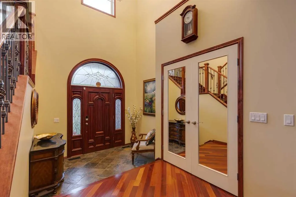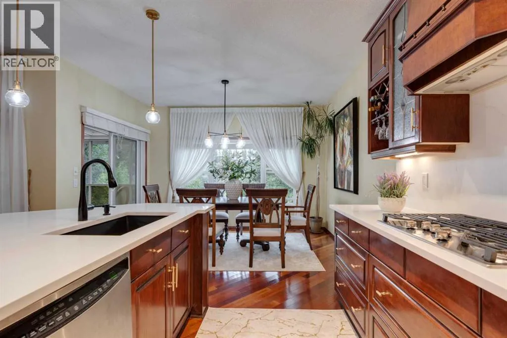 Backing onto a park and tranquil natural reserve that connects to Griffith Woods Park, this immaculate two-storey home blends European-inspired craftsmanship, timeless elegance, and a thoughtful family-friendly layout. A custom mahogany front door with artisan-crafted glass sets the stage for the quality within, opening into a grand sunlit foyer framed by Brazilian cherry hardwood and soaring 9â ceilings. From the spacious living room, where a stone gas fireplace makes a bold statement, the layout flows into an elegant dining room that connects to a screened three-season room with awning, creating year-round opportunities for effortless indoor/outdoor living. The chef-inspired kitchen is designed for connection and function and features a gas cooktop, stone counters, a large island with seating, and a walk-in pantry, while the mud and laundry room with direct access to the garage ensures practical family functionality and everyday convenience. Expansive windows frame sweeping views of the private backyard and lush green space, flooding the home with natural light. Upstairs, the primary suite is its own retreat and boasts a large walk-in closet and spotless ensuite complete with dual vanities and a corner soaker tub. Two additional bedrooms, along with a four-piece bathroom and a bright bonus room, make for an ideal family layout. The walk-out lower level enhances the homeâs versatility, offering in-floor heating, a cozy family room anchored by a second gas fireplace and wood built-ins, a kitchenette, a fourth bedroom, and a full bathroom with steam shower, perfect for older children, long-term guests, or a caregiver. Outside, the south-facing backyard is a private oasis with mature landscaping, a covered patio, and direct access to a recreational field with a skating rink, tennis courts, soccer fields, and pathways that wind along the Elbow River. The oversized 27â wide garage provides ample space for vehicles and storage. Surrounded by extensive pathways and abunda nt wildlife, Discovery Ridge offers the closest thing to mountain living within city limits while still being minutes to Stoney Trail, Signal Hill Shopping Centre, and premier golf at Elbow Springs and Pinebrook. Additional features include central air conditioning, central vac, a water softener, an irrigation system, and the assurance of quality construction by Homes by AVI. Blending timeless craftsmanship with family-friendly design, this residence offers the perfect backdrop for cherished memories and everyday joy. Donât miss the chance to make Discovery Ridge your home! (id:27476)