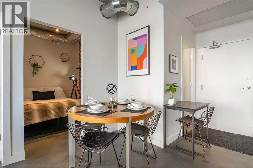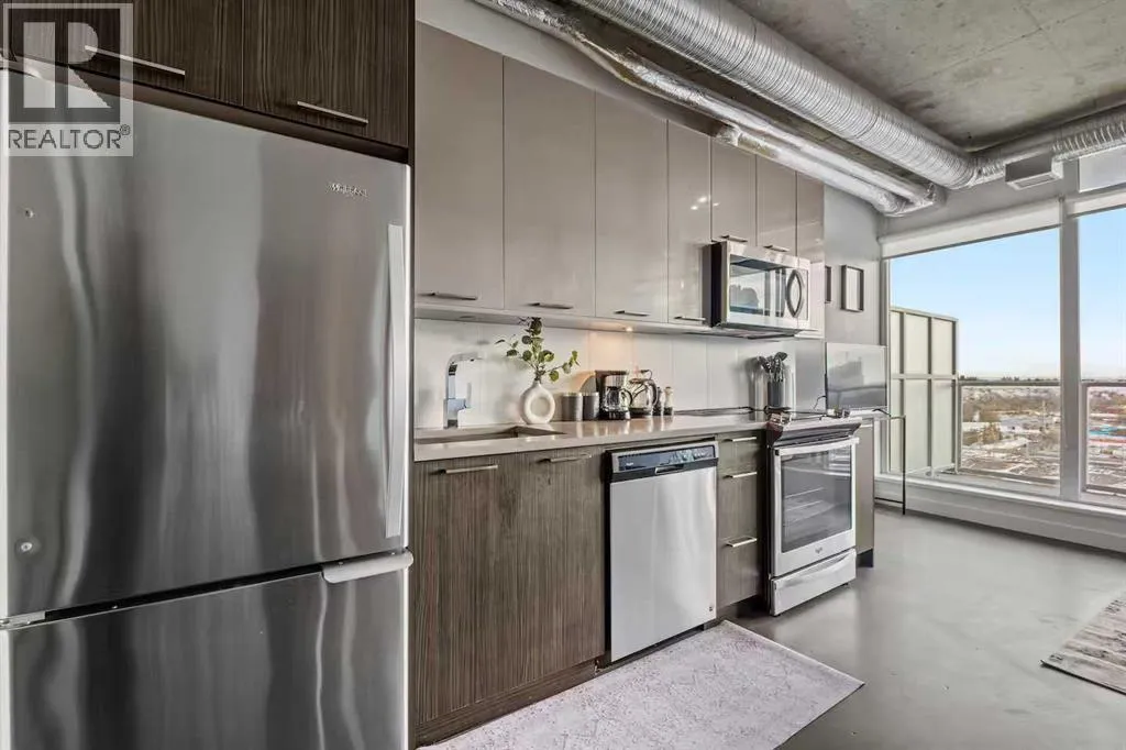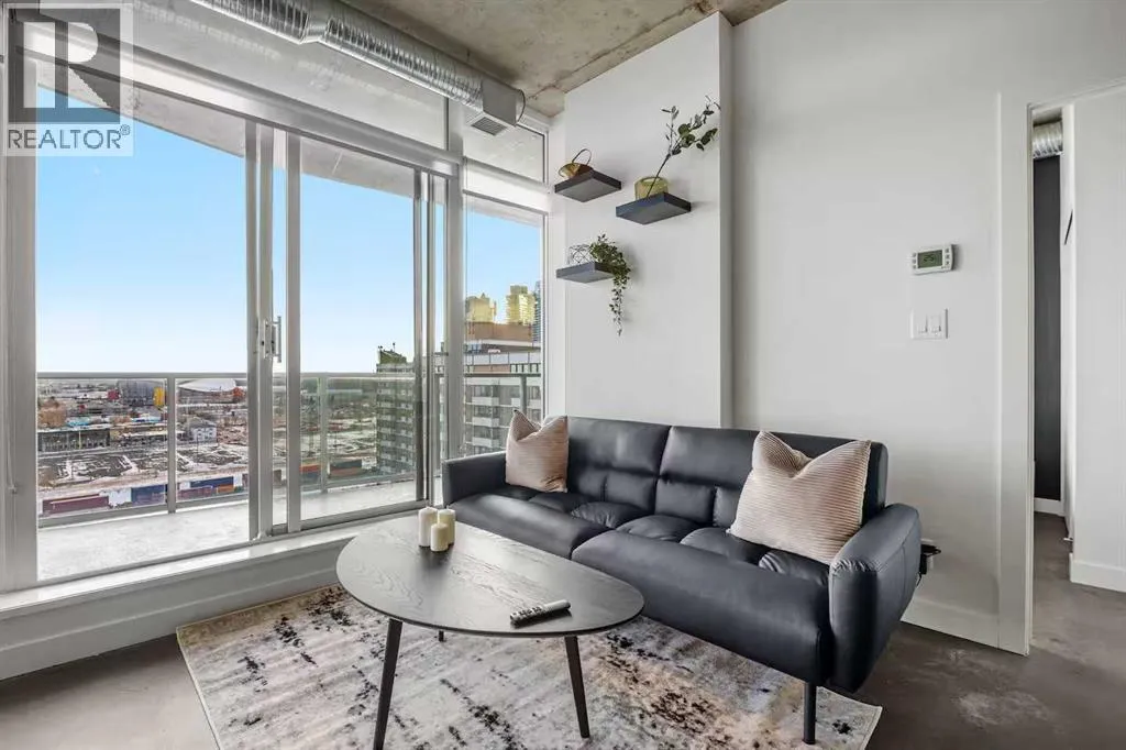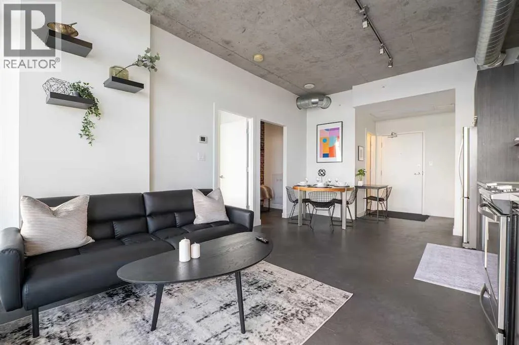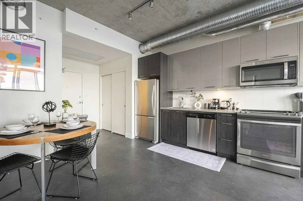 Welcome to INK by Battistellaâwhere modern design meets vibrant downtown living. Perfectly situated in the heart of East Village, this striking condo is ideal for first home owners and professionals seeking a stylish urban retreat! Just steps from the City Hall LRT, Superstore, the award-winning Central Library, National Music Centre, Studio Bell, RiverWalk, and St. Patrickâs Island, this is truly the best of Calgary at your doorstep. Inside, this sun-drenched south-facing residence showcases uninterrupted views of the Saddledome and Stampede Grounds through expansive floor-to-ceiling windows. The industrial loft-inspired design exudes sophistication with 9â exposed concrete ceilings, matte polished concrete floors, and central air conditioning for year-round comfort. The open-concept layout includes a versatile den/office (currently used as a bedroom), spacious primary bedroom, and a sleek 4-piece bathroom. The kitchen is a showpiece in itself, boasting quartz countertops, glossy metal upper cabinetry, premium hardware, and full-size stainless-steel appliancesâseamlessly blending function and style. With in-suite laundry and a modern floorplan, this residence is perfectly tailored for the urban lifestyle. Whether youâre seeking your own inner-city sanctuary or a rental investment, INK offers a rare opportunity to own in one of Calgaryâs most dynamic communities! (id:27476)