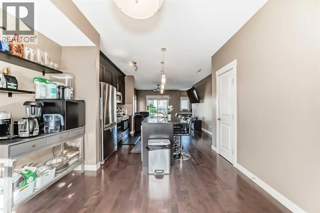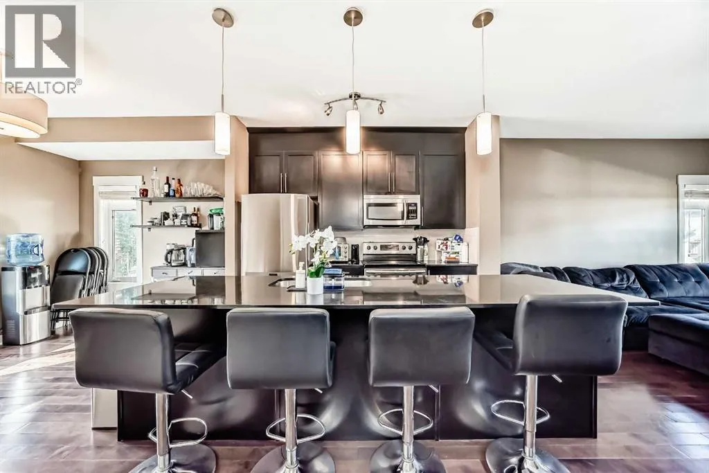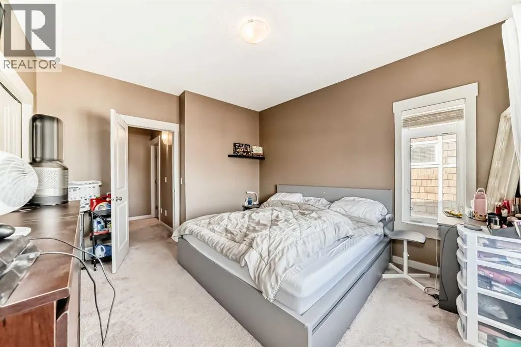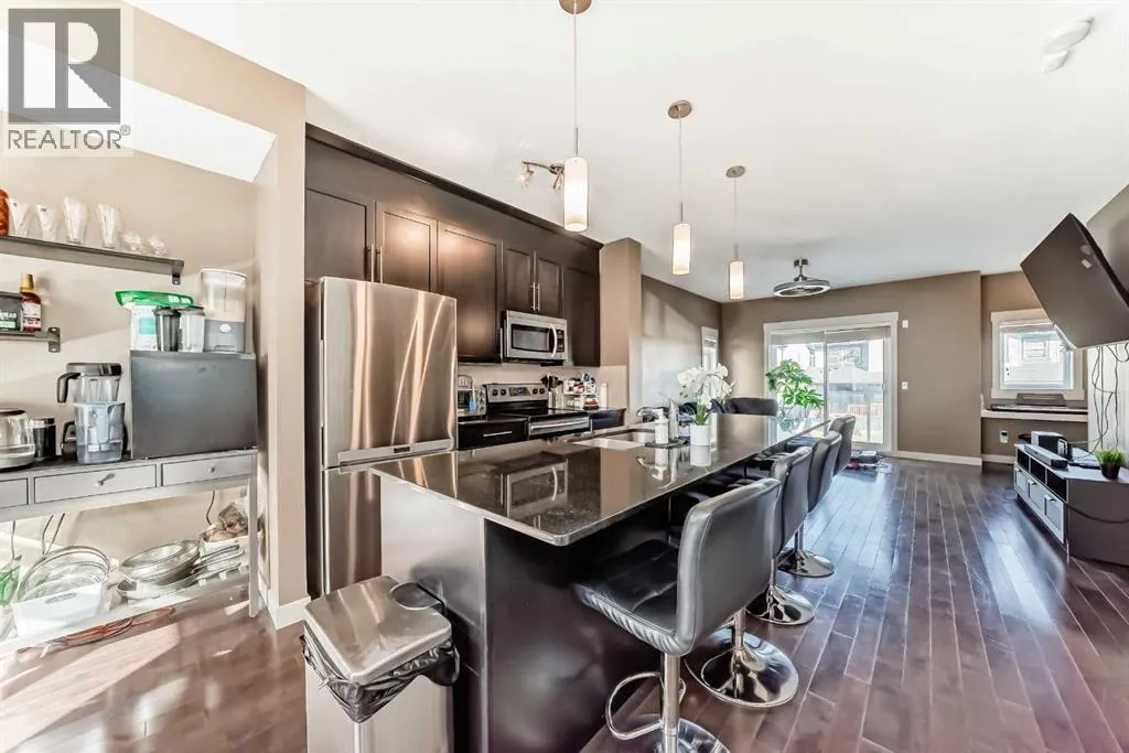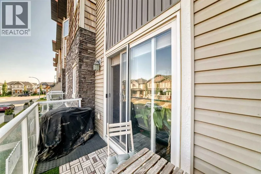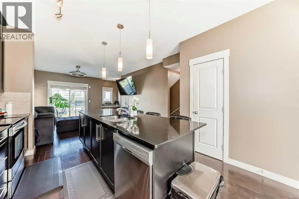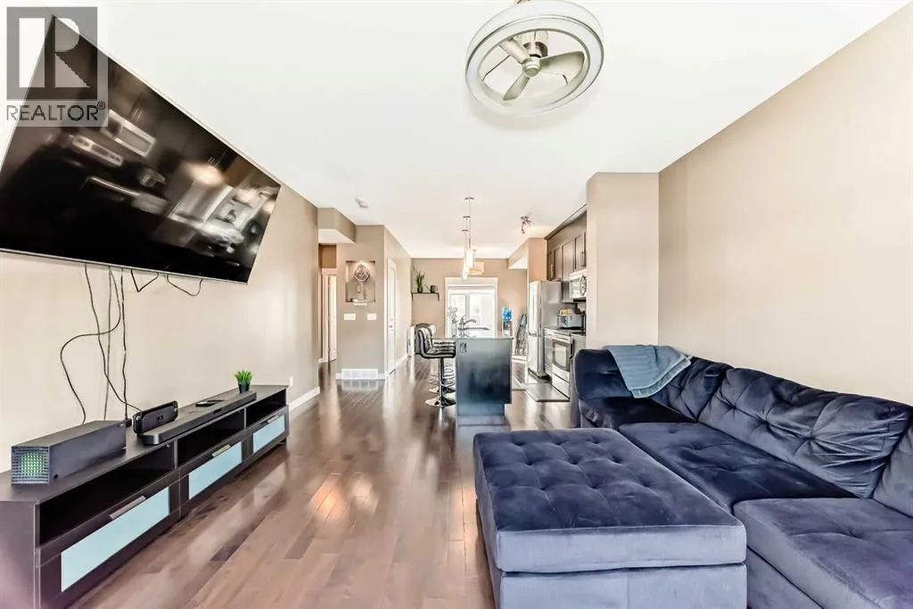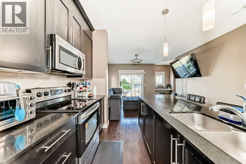 MODERN END UNIT | 2012 BUILD | 3 PARKING NEAR BY OPTIONS | DOUBLE GARAGE | GREAT LOCATION | FLEX ROOM + DEN | FULLY FINISHED. This move-in ready townhouse in Skyview Ranch combines modern design, functional space, and one of NE Calgaryâs most convenient locationsâall at outstanding value. Built in 2012 and well maintained, itâs bright and welcoming with windows on 3 sides and no front/back neighbours. The entry level offers a double attached garage (brand-new door), storage, and a versatile flex roomâideal as a gym, office, hobby space, or bedroomâplus a private front patio. The main floor impresses with a spacious great room, dining area, half bath, and a chefâs kitchen featuring quartz counters, large island, upgraded cabinets, stainless steel appliances, OTR microwave & under-mount sink. Step onto the east-facing deck for BBQs or summer evenings. Upstairs boasts 2 bedrooms including a primary with ensuite, another full bath, an office/den and a brand new set of washer/dryer. Walk to schools, parks, pond & playgrounds, with fast access to Stoney, Deerfoot, Airport & CrossIron. A 3-minutes walk to the bus station. A stylish newer home in a prime locationâan exceptional opportunity you donât want to miss. (id:27476)