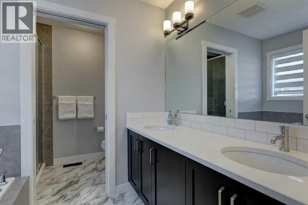 Welcome to 878 Bluerock Way SW, a contemporary home in Vermillion Hill/Alpine Park, offering a total of 3,494 sq ft of FULLY DEVELOPED space. This property comes complete with a FULLY-FINISHED BASEMENT WITH SEPARATE SIDE ENTRY, providing additional family living space. With everything already done for you, this home delivers true move-in ready value.Built by Genesis Builders, modern comfort is front and center with a CENTRALIZED AIR CONDITIONING SYSTEM, a double attached garage with EV Charger, and a full Smart Home Package that includes a Ring Video Doorbell, Ecobee Thermostats, Amazon Echo Integration, and Lutron Smart Light Dimmers. Privacy and convenience continue with installed WINDOW COVERINGS, a FINISHED FENCE, a DECK WITH GAS HOOK-UP, and FULL LANDSCAPING, saving you the expense and hassle of doing these projects yourself.The main floor features an OPEN-CONCEPT layout with 9-foot ceilings, LUXURY VINYL PLANK FLOORING, a spacious living room with 50" electric FIREPLACE, and a GOURMET KITCHEN with a gas cooktop, chimney hood fan, built-in microwave and wall oven, fridge with water and ice dispenser, and a walk-through SPICE KITCHEN WITH GAS STOVE AND PANTRY. Upstairs, enjoy 2 PRIMARY BEDROOMS with DOUBLE DOORS, VAULTED CEILINGS, FULL ENSUITES with DUAL VANITIES, and WALK-IN CLOSETS. A total of 4 Bedrooms, 3 Full Bathrooms, a Bonus Room/Loft, and Laundry complete the level. The FULLY-FINISHED BASEMENT (with permits) offers a recreation area, 2 bedrooms, and a full bathroom, making it ideal for multi-generational families or suite potential subject to city approval and permitting. Additional value comes with 2 high-efficiency furnaces and 2 humidifiers.Outside, enjoy James Hardie siding, a west-facing composite deck, and a low-maintenance yard. With so many upgrades already complete, this home stands apart from new construction and offers unmatched practical value. Book your showing today! (id:27476)