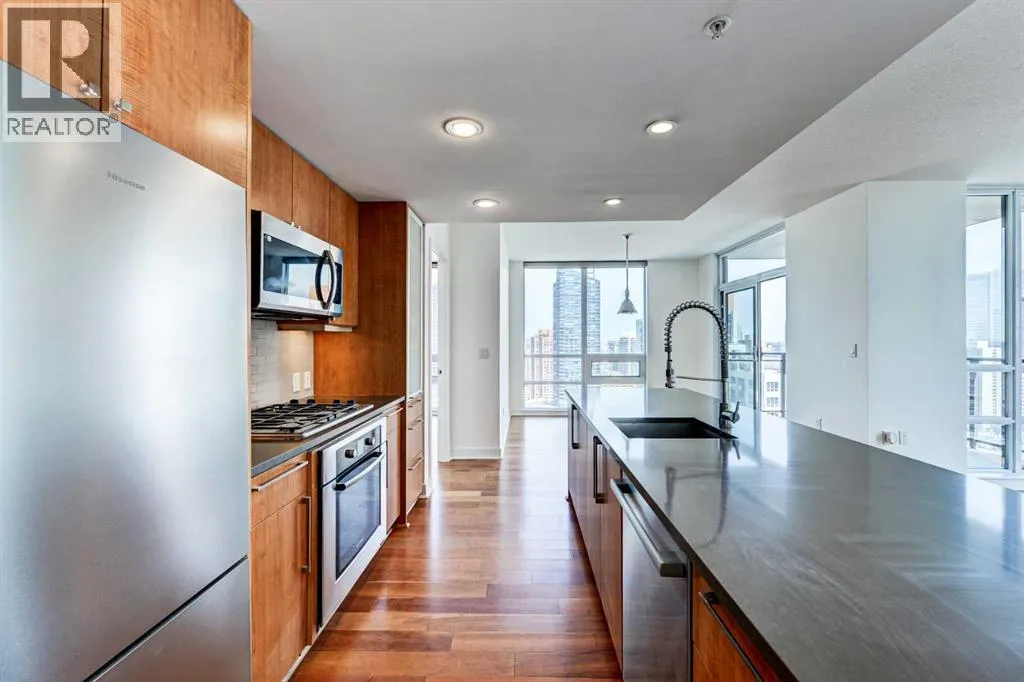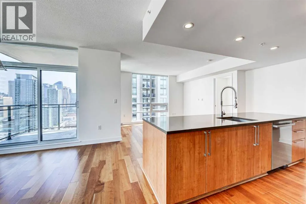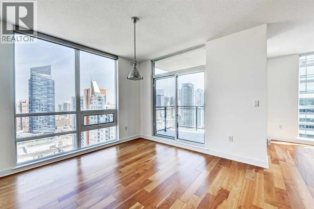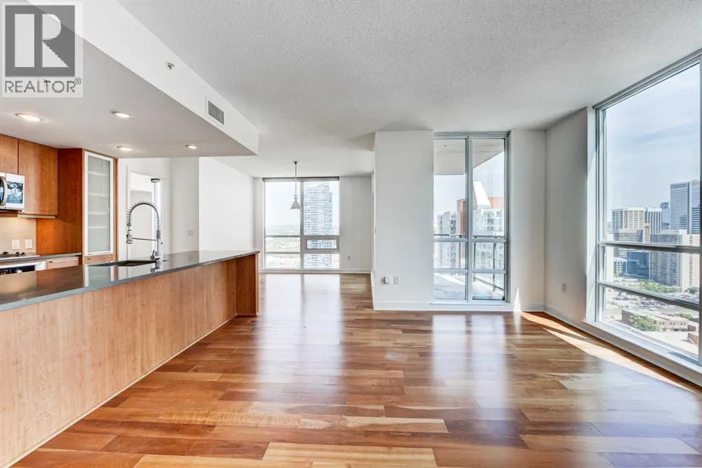Experience elevated urban living in this stunning sub-penthouse unit on the 24th floor of the Nova Building, featuring one of the most spectacular panoramic NE corner views in the city. This highly coveted floor plan offers 2 bedrooms + den, 2 full bathrooms, titled underground parking, and 2 storage lockers, providing exceptional comfort and convenience. Recently updated throughout, this move-in-ready home has been freshly painted, including ceilings, with new doors and baseboards adding a crisp, modern finish. The open-concept layout features floor-to-ceiling windows, flooding the space with natural light and showcasing the breathtaking skyline. Interior details include luxury wide-plank laminate hardwood flooring, quartz countertops, a massive kitchen island, and brand-new, never-used stainless steel appliances including a fridge, microwave/hood fan, and dishwasher. Perfect for entertaining or day-to-day living, the seamless flow between the kitchen, dining, and living areas makes this home both functional and inviting. The generously sized primary suite offers a true retreat with a spacious walk-through closet leading to a spa-inspired ensuite featuring dual vanities, a soaker tub, and a separate glass shower. The Nova offers premium amenities, including a fully equipped fitness centre, sauna, residentsâ lounge/party room, and landscaped courtyard. Located in the heart of the Beltline, youâre just steps to 17th Avenueâs vibrant dining, shopping, and nightlife, with Co-op grocery store right across the street for ultimate convenience. Donât miss this opportunity to own one of the best units in the building. (id:27476)
