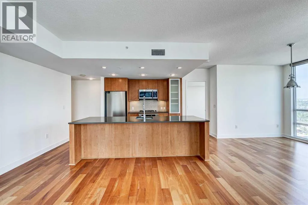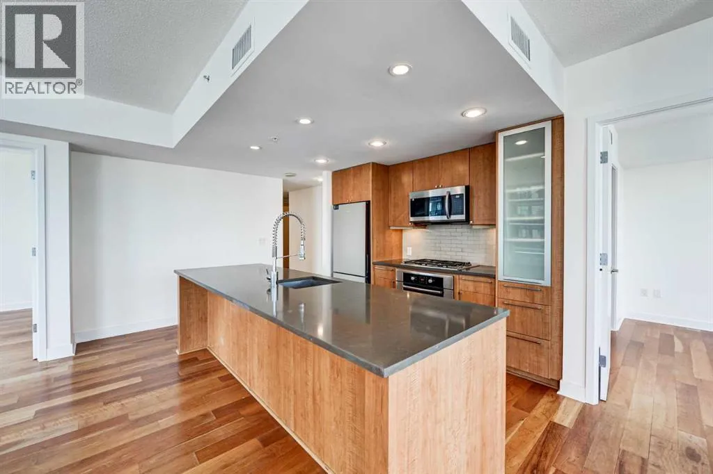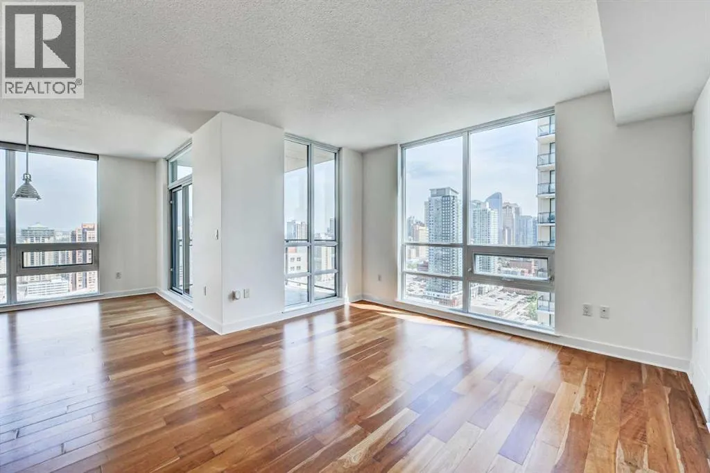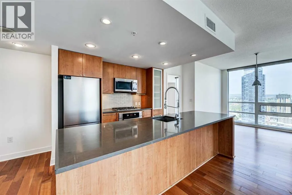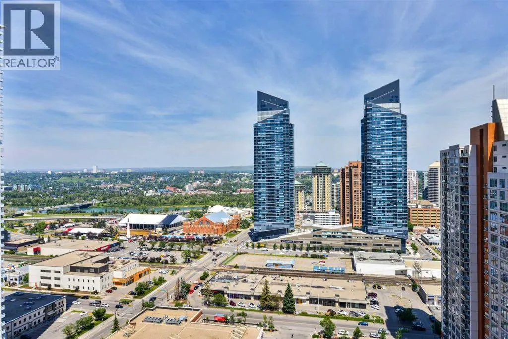 Experience elevated urban living in this stunning sub-penthouse unit on the 24th floor of the Nova Building, featuring one of the most spectacular panoramic NE corner views in the city. This highly coveted floor plan offers 2 bedrooms + den, 2 full bathrooms, titled underground parking, and 2 storage lockers, providing exceptional comfort and convenience. Recently updated throughout, this move-in-ready home has been freshly painted, including ceilings, with new doors and baseboards adding a crisp, modern finish. The open-concept layout features floor-to-ceiling windows, flooding the space with natural light and showcasing the breathtaking skyline. Interior details include luxury wide-plank laminate hardwood flooring, quartz countertops, a massive kitchen island, and brand-new, never-used stainless steel appliances including a fridge, microwave/hood fan, and dishwasher. Perfect for entertaining or day-to-day living, the seamless flow between the kitchen, dining, and living areas makes this home both functional and inviting. The generously sized primary suite offers a true retreat with a spacious walk-through closet leading to a spa-inspired ensuite featuring dual vanities, a soaker tub, and a separate glass shower. The Nova offers premium amenities, including a fully equipped fitness centre, sauna, residentsâ lounge/party room, and landscaped courtyard. Located in the heart of the Beltline, youâre just steps to 17th Avenueâs vibrant dining, shopping, and nightlife, with Co-op grocery store right across the street for ultimate convenience. Donât miss this opportunity to own one of the best units in the building. (id:27476)
