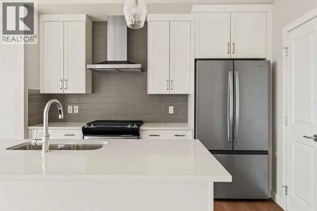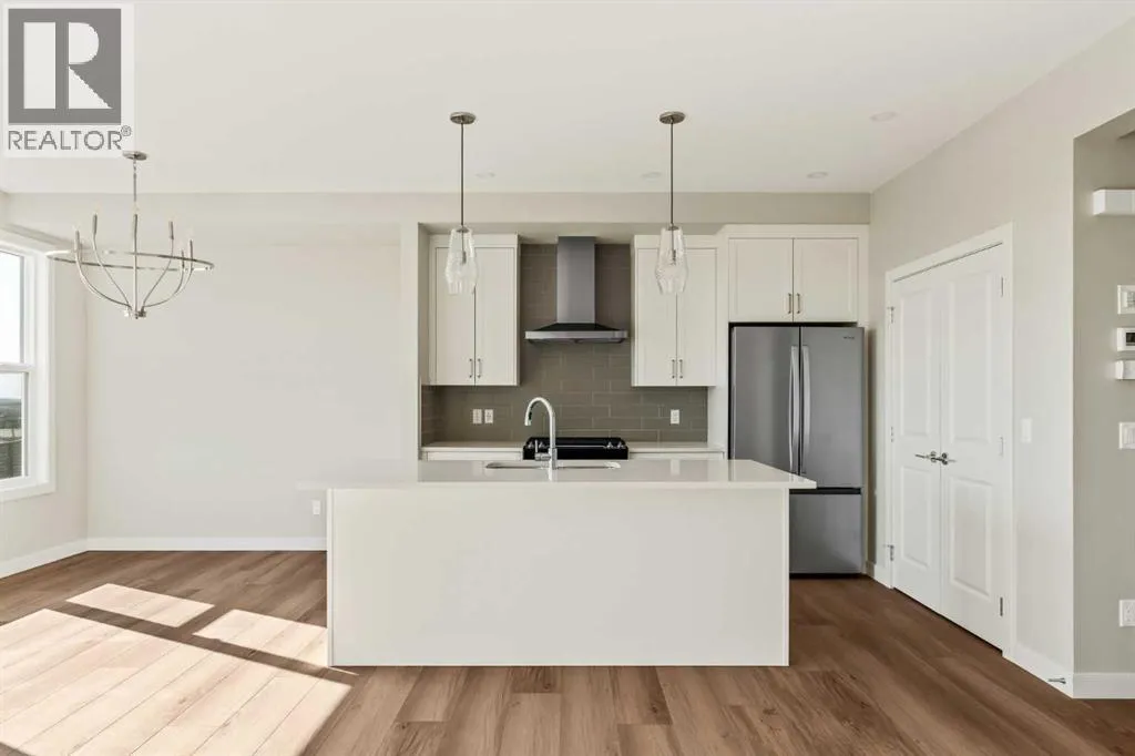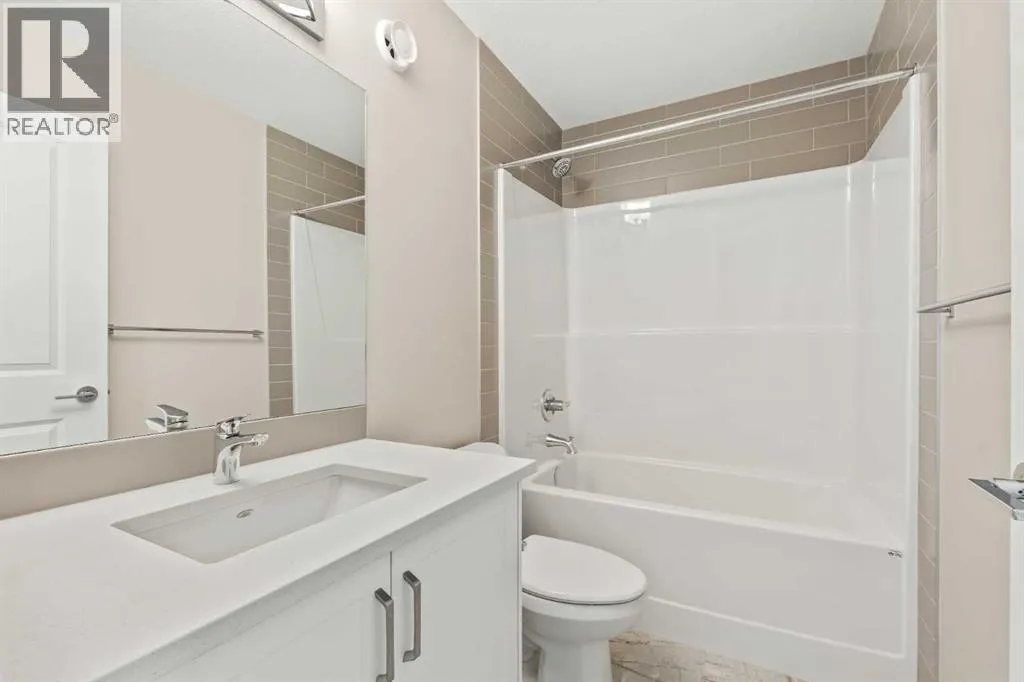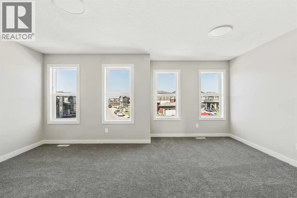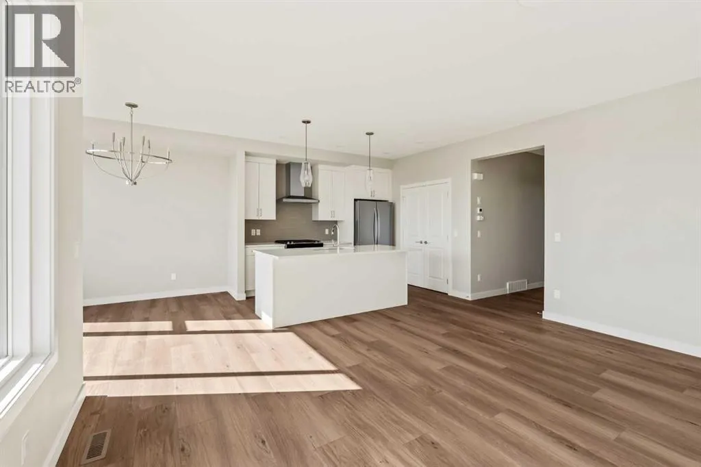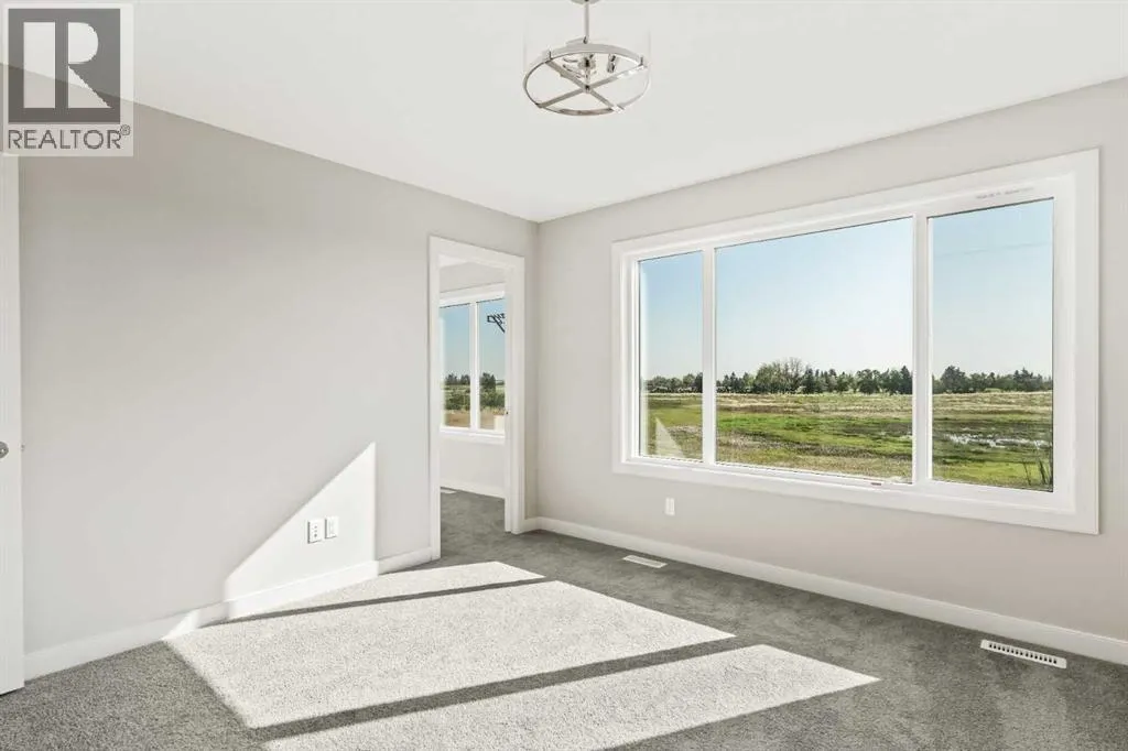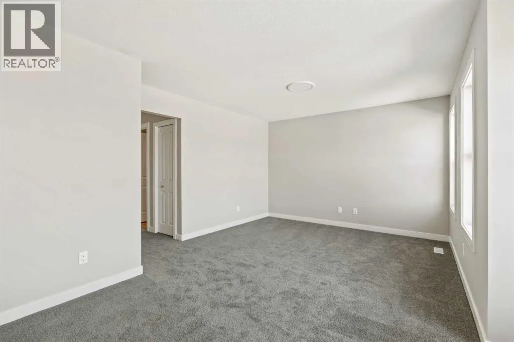 **OPEN HOUSE - SUNDAY, NOVEMBER 16th FROM 1:00-3:00!** An incredible opportunity awaits in this brand-new, move-in ready home on an oversized pie lot in the vibrant new community of Belvedere! Offering nearly 2,100 sq. ft. of beautifully designed living space above grade, plus a full basement with side entrance, this 4-bedroom, 3-bathroom home is ideal for growing families or multi-generational living. The open-concept main floor is both stylish and functional, featuring a central kitchen that seamlessly connects to the living and dining areas - perfect for family gatherings or entertaining. The chefâs kitchen is finished with ceiling-height white shaker cabinetry, timeless subway tile backsplash, quartz countertops, a built-in chimney hood fan, lower microwave, and a spacious pantry. The oversized island provides additional seating and serves as the heart of the home. The bright and inviting living room (~16âx14â) is anchored by a cozy fireplace, while a wall of rear windows floods the space with natural light year-round. From the dining area, patio doors lead to a 12âx10â deck overlooking your private backyard - ready for summer BBQs and outdoor entertaining. Completing the main floor is a bedroom that could be used as a home office space, full bathroom, and a functional mudroom with direct access to the double attached garage. Upstairs, the expansive 14âx18â family room with a wall of windows offers endless possibilities for a media space + home office or playroom. The primary suite is a true retreat with a 5-piece ensuite featuring dual sinks, quartz counters, a tiled walk-in shower, soaking tub, and a spacious walk-in closet with large window. Two additional large bedrooms, a full bath, and a large laundry room complete the upper level. The side entrance provides direct access to the basement, offering future flexibility. With rough-ins already in place, the lower level could be developed into a legal suite (subject to municipal approval) for rental income, or customized into additional living space for your family with ample room for a living space, bedroom and full bathroom. Set on a generous 3,800 sq. ft. pie lot, this home provides plenty of space inside and out. Plus, with full builder warranty and Alberta New Home Warranty, you can purchase with complete peace of mind. Donât miss this opportunity to own a brand-new, move-in ready home in Belvedere - designed with todayâs modern family in mind! (id:27476)