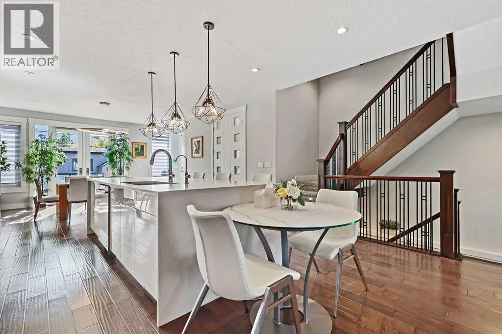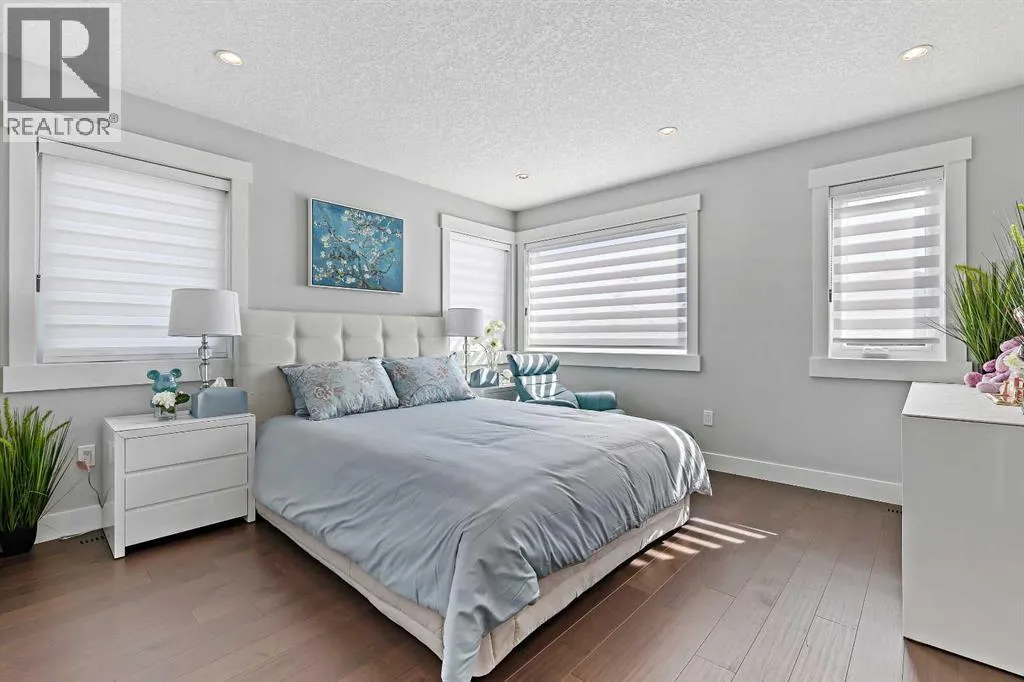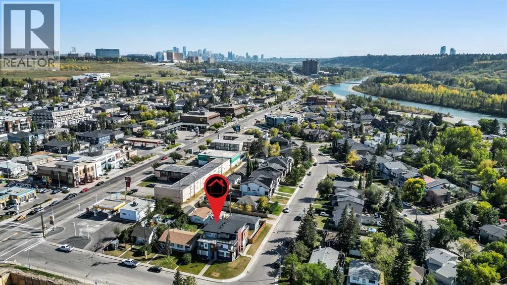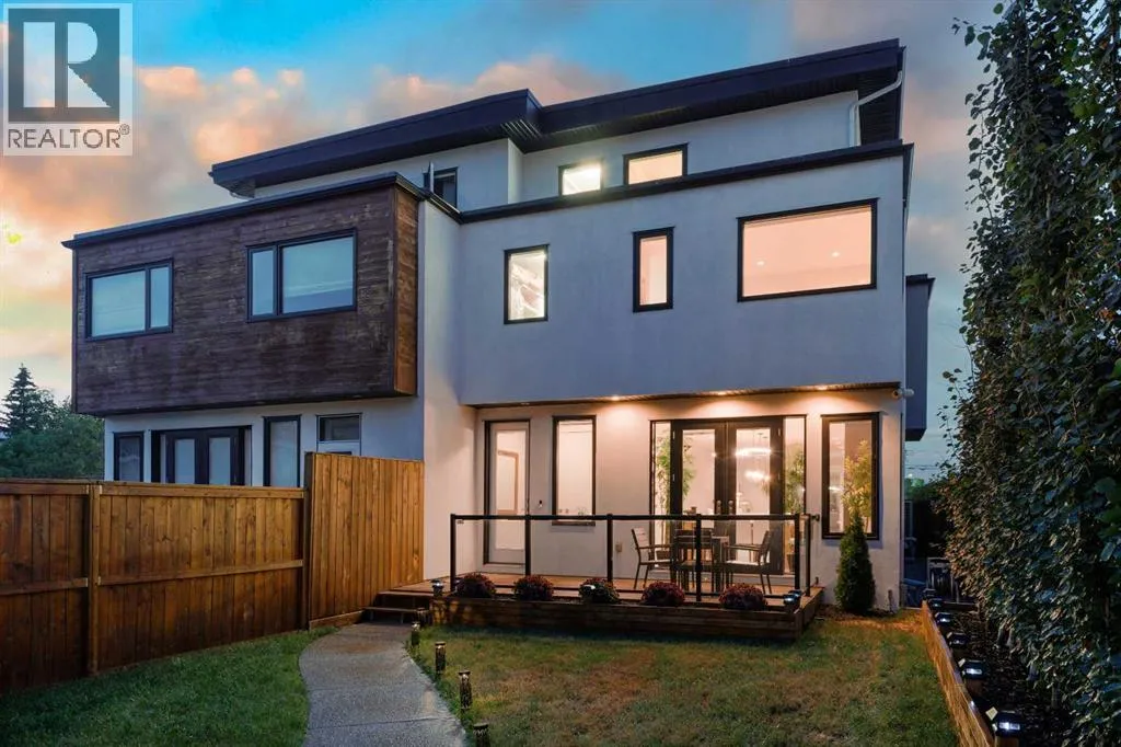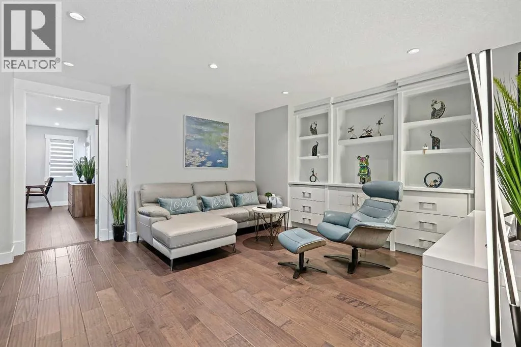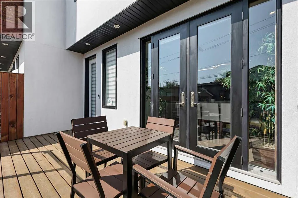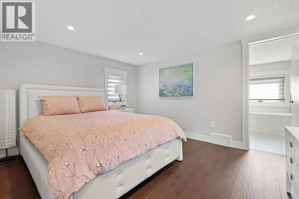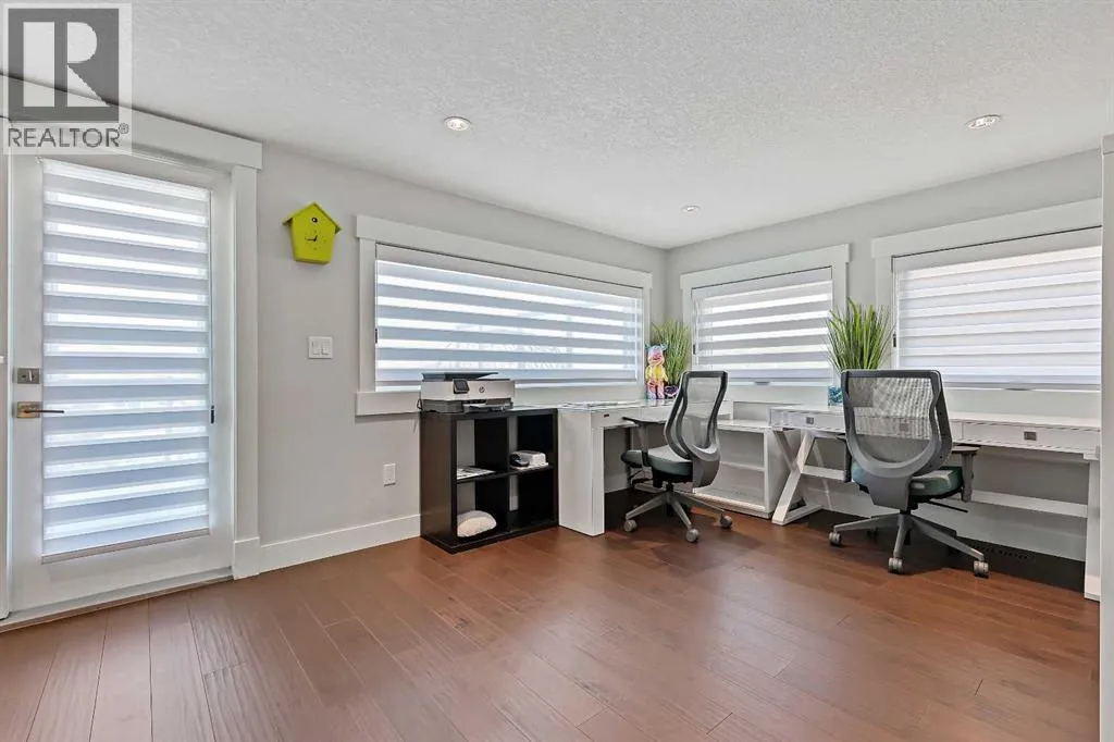 A rare opportunity in Montgomery â semi-detached home stands out with four fully finished levels, nearly 4000 sqft of developed living space, a private balcony, and a long list of premium upgrades. Steps from the Bow River pathway, Shouldice Park, Market Mall, and minutes to both Foothills and Children's Hospital, this location is as connected as it is private. Inside, the home is finished with luxury Canadian maple hardwood on all upper levels, layered lighting (including updated LED fixtures), and fresh paint throughout. The main floor showcases a sleek chef's kitchen with JennAir stainless steel appliances, including a gas cooktop, built-in oven, chimney hood fan, and integrated microwave. A full walk-in pantry, with double doors, and extended island with waterfall quartz complete the space. The spacious living area offers floor-to-ceiling windows and a gas fireplace framed by custom tile. The second level hosts dual primary suites, each with walk-in closets and five-piece ensuites featuring full tile, deep tubs, and separate glass showers. A bonus room with custom built-in shelving and a full laundry room with storage complete this level. On the top floor, a third bedroom, with its own 5 pc ensuite, walk in closet, and dedicated office that's open to a private rooftop balcony with unobstructed views. The fully developed basement includes a fourth bedroom, full bath, in-floor heating, large rec room with wet bar and beverage fridge, and extra storage. Additional upgrades include: newer high-capacity heat pump system, Kinetico water softener, dechlorinator, purified drinking tap, security cameras (x4), dual doorbell cams, Hunter Douglas window coverings and a freshly painted interior. Detached garage and landscaped yard, with a large deck and beautifully tended garden complete the package. (id:27476)