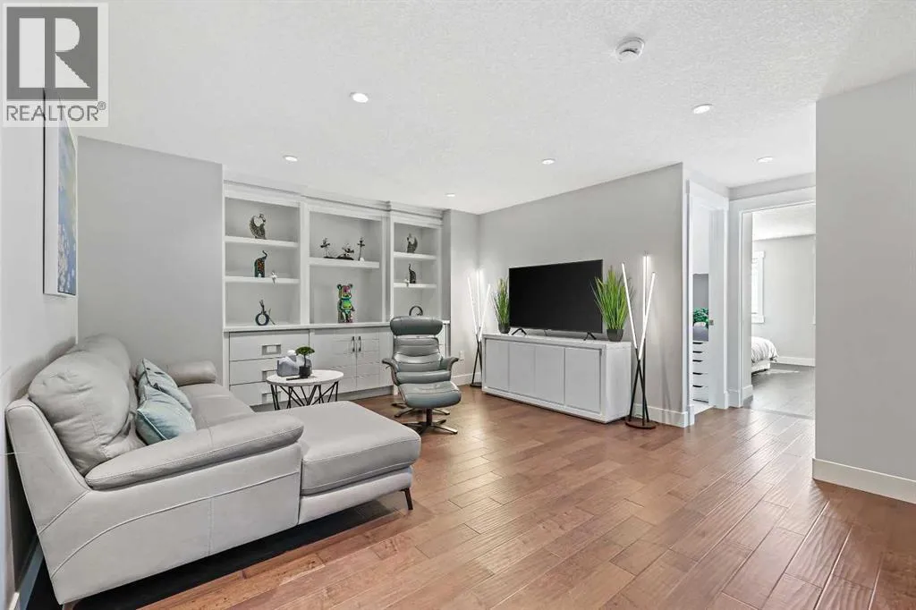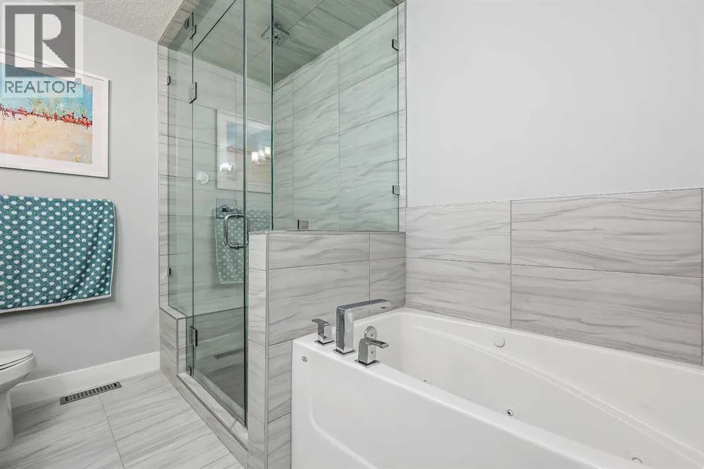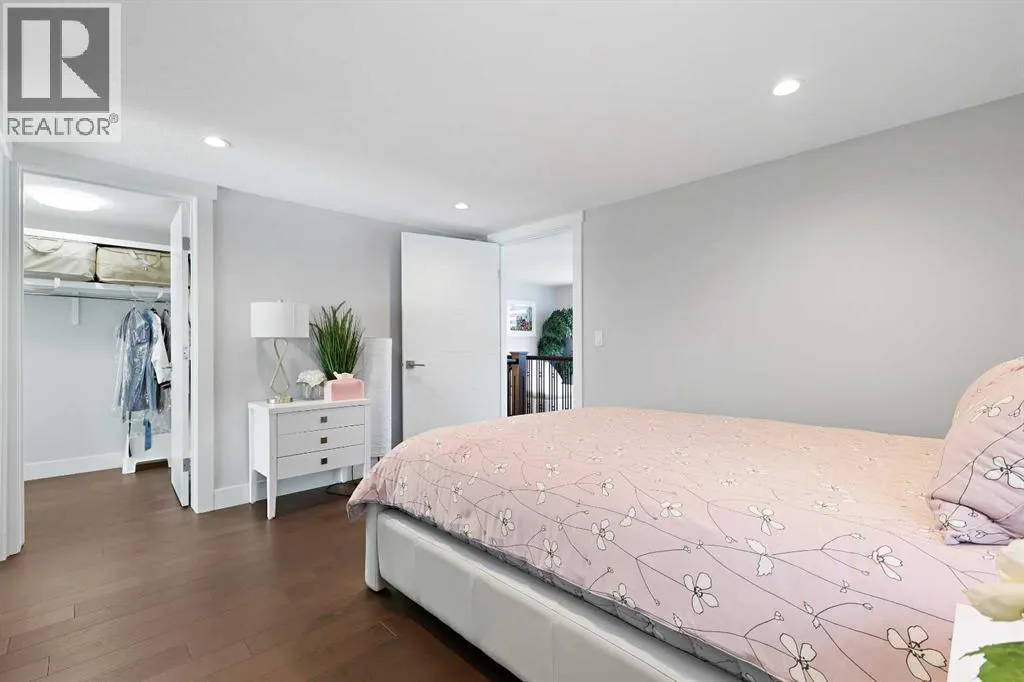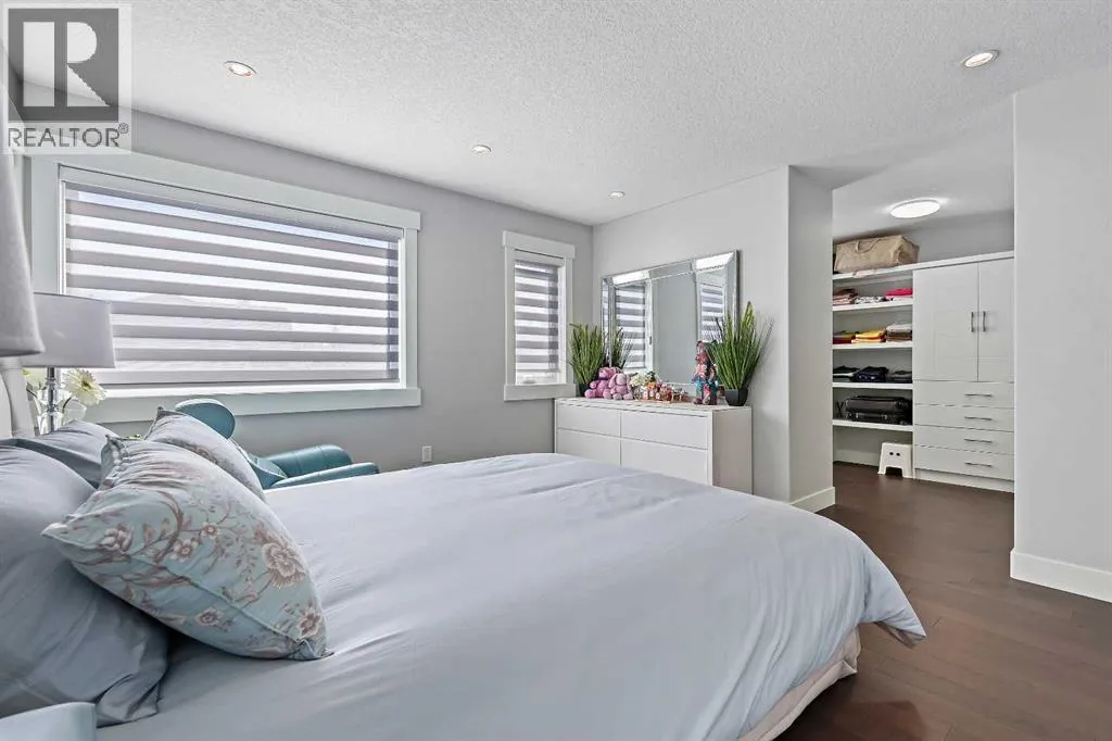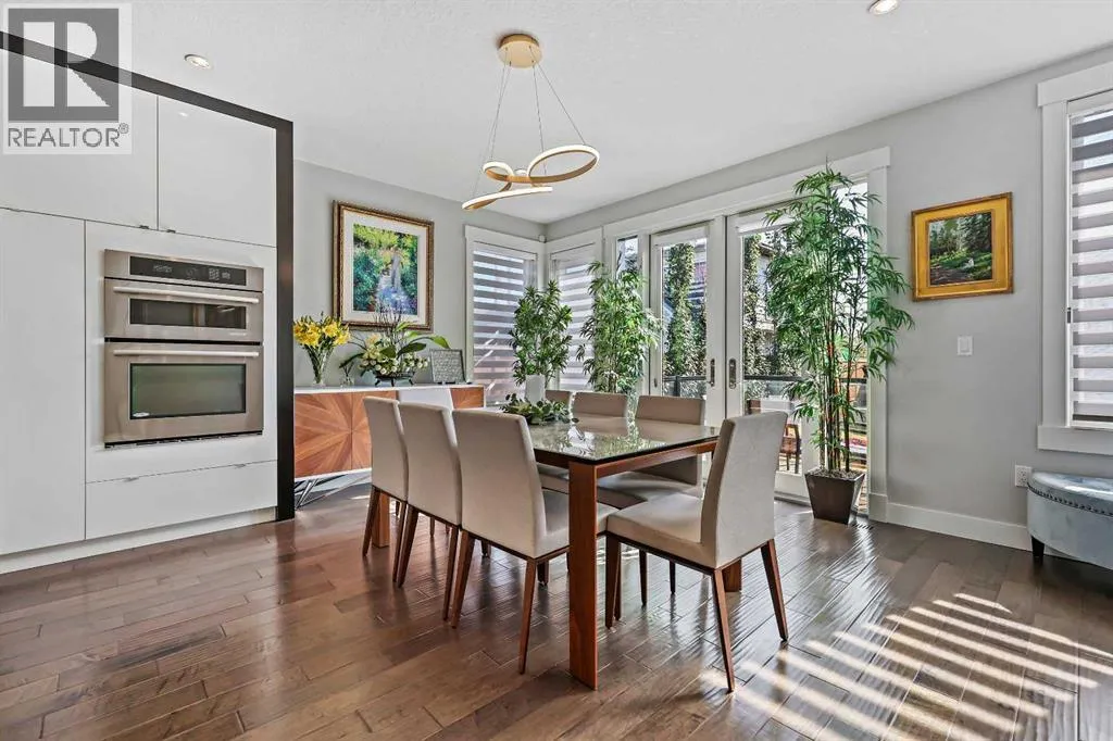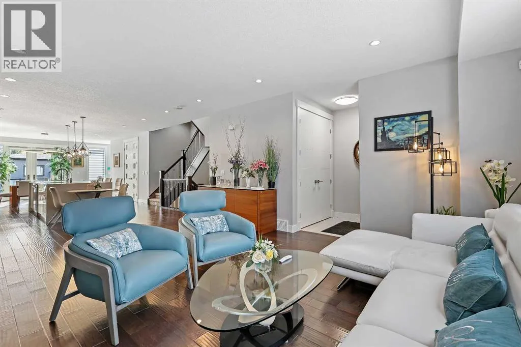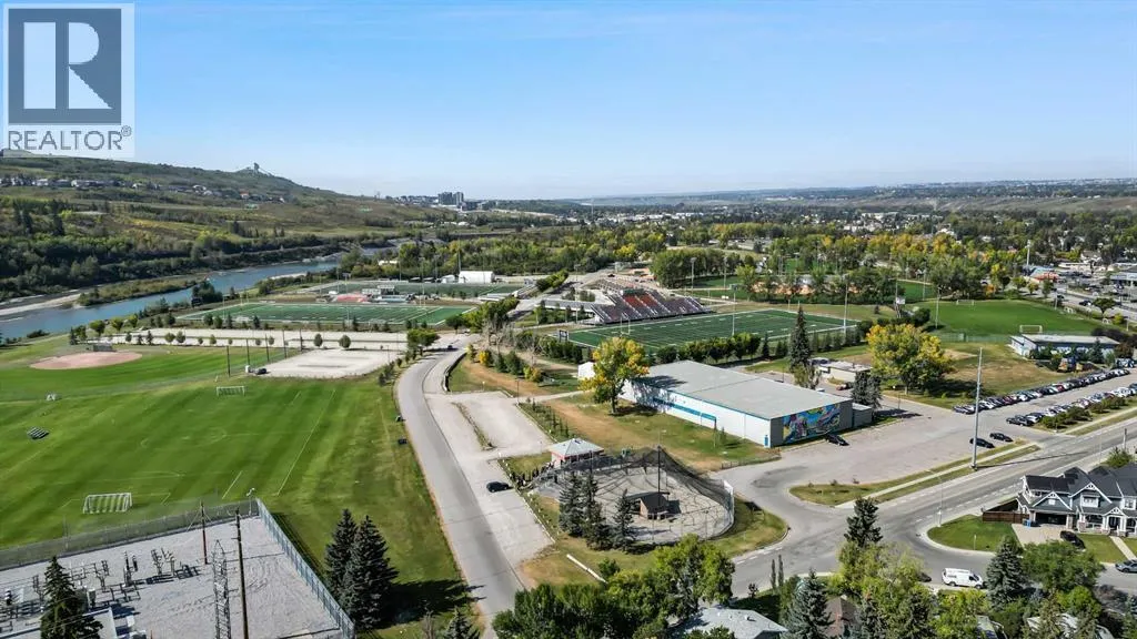 A rare opportunity in Montgomery â semi-detached home stands out with four fully finished levels, nearly 4000 sqft of developed living space, a private balcony, and a long list of premium upgrades. Steps from the Bow River pathway, Shouldice Park, Market Mall, and minutes to both Foothills and Children's Hospital, this location is as connected as it is private. Inside, the home is finished with luxury Canadian maple hardwood on all upper levels, layered lighting (including updated LED fixtures), and fresh paint throughout. The main floor showcases a sleek chef's kitchen with JennAir stainless steel appliances, including a gas cooktop, built-in oven, chimney hood fan, and integrated microwave. A full walk-in pantry, with double doors, and extended island with waterfall quartz complete the space. The spacious living area offers floor-to-ceiling windows and a gas fireplace framed by custom tile. The second level hosts dual primary suites, each with walk-in closets and five-piece ensuites featuring full tile, deep tubs, and separate glass showers. A bonus room with custom built-in shelving and a full laundry room with storage complete this level. On the top floor, a third bedroom, with its own 5 pc ensuite, walk in closet, and dedicated office that's open to a private rooftop balcony with unobstructed views. The fully developed basement includes a fourth bedroom, full bath, in-floor heating, large rec room with wet bar and beverage fridge, and extra storage. Additional upgrades include: newer high-capacity heat pump system, Kinetico water softener, dechlorinator, purified drinking tap, security cameras (x4), dual doorbell cams, Hunter Douglas window coverings and a freshly painted interior. Detached garage and landscaped yard, with a large deck and beautifully tended garden complete the package. (id:27476)