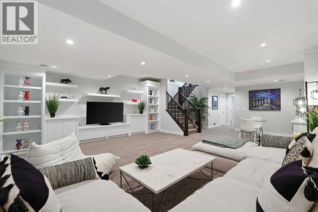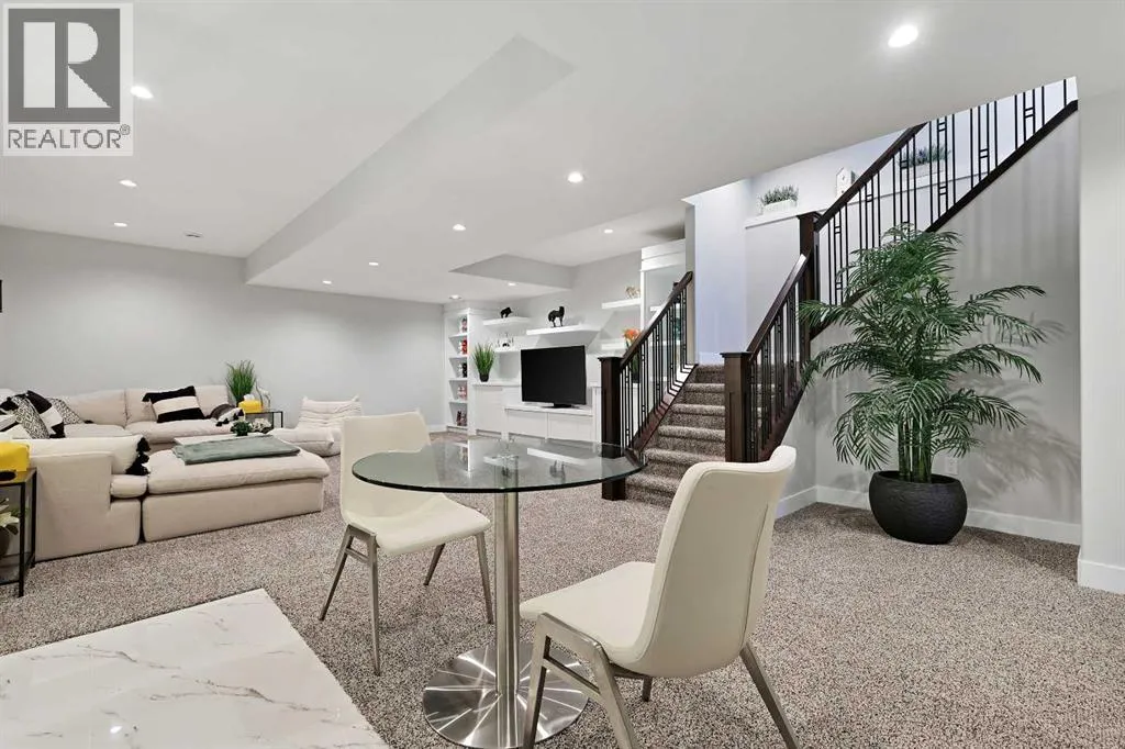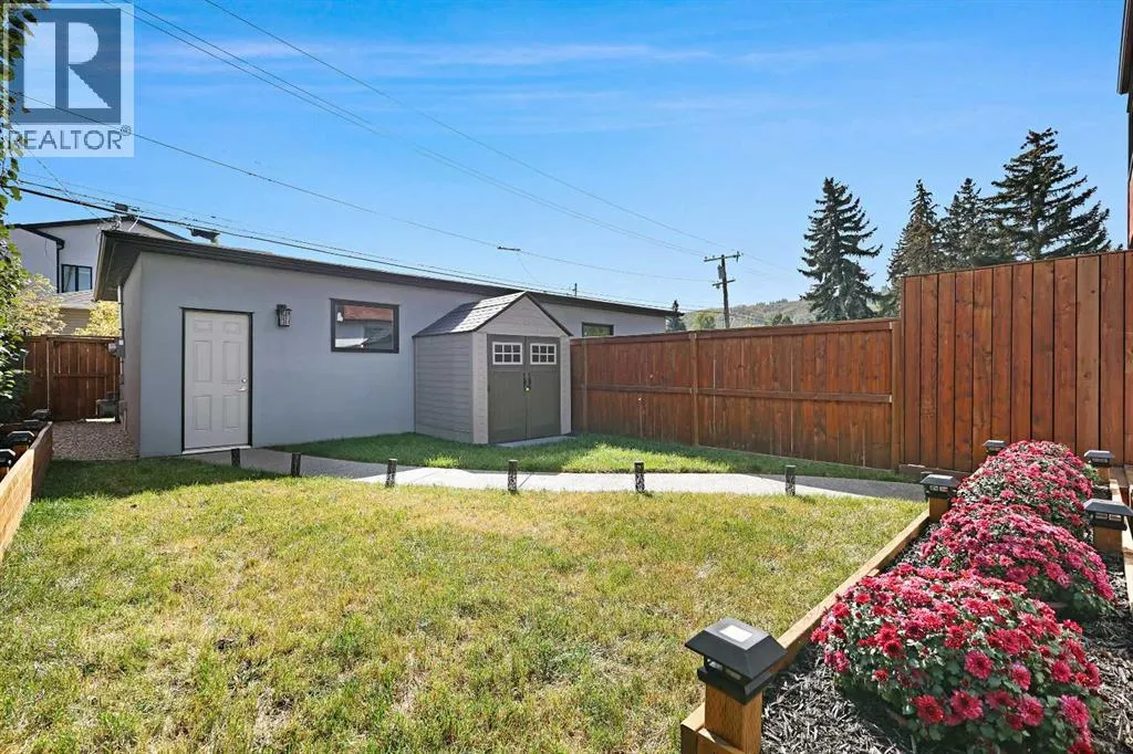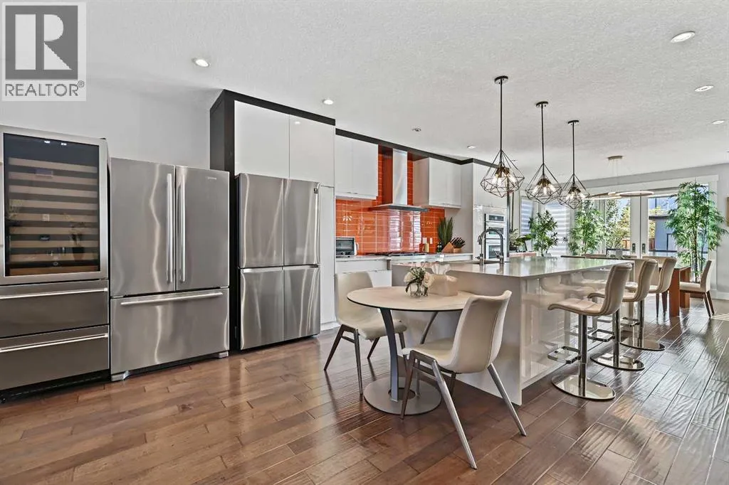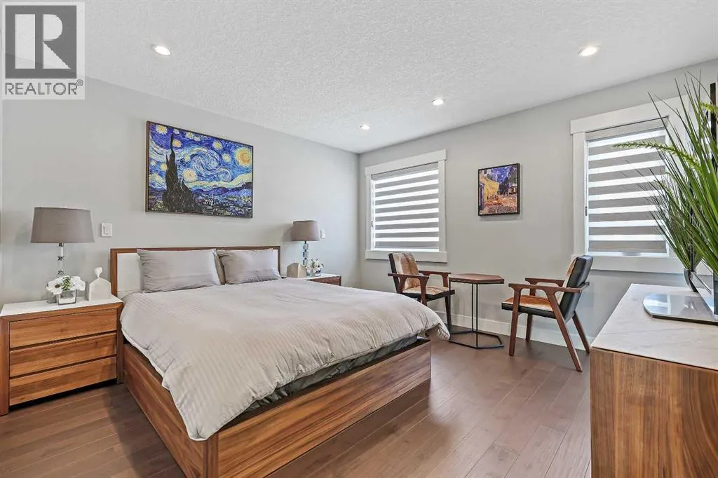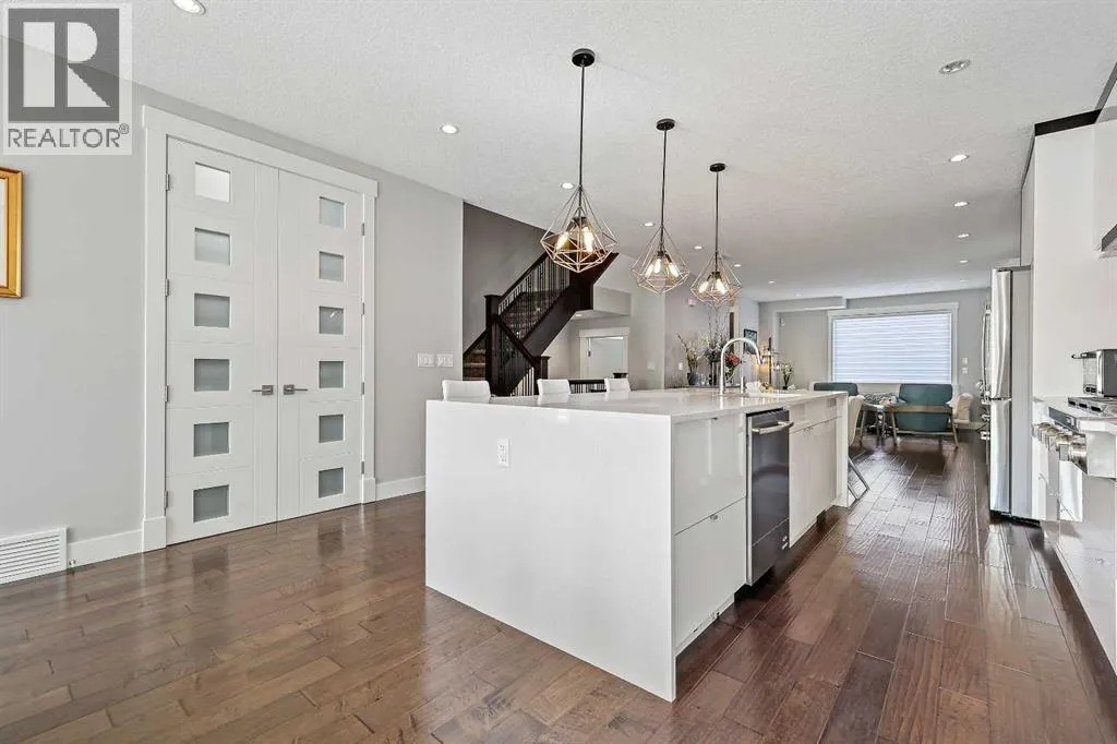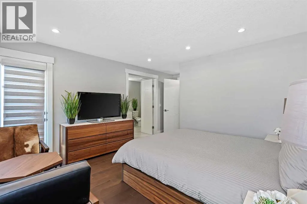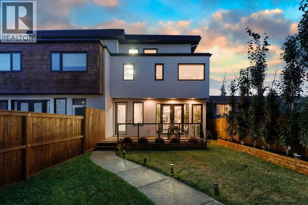 A rare opportunity in Montgomery â semi-detached home stands out with four fully finished levels, nearly 4000 sqft of developed living space, a private balcony, and a long list of premium upgrades. Steps from the Bow River pathway, Shouldice Park, Market Mall, and minutes to both Foothills and Children's Hospital, this location is as connected as it is private. Inside, the home is finished with luxury Canadian maple hardwood on all upper levels, layered lighting (including updated LED fixtures), and fresh paint throughout. The main floor showcases a sleek chef's kitchen with JennAir stainless steel appliances, including a gas cooktop, built-in oven, chimney hood fan, and integrated microwave. A full walk-in pantry, with double doors, and extended island with waterfall quartz complete the space. The spacious living area offers floor-to-ceiling windows and a gas fireplace framed by custom tile. The second level hosts dual primary suites, each with walk-in closets and five-piece ensuites featuring full tile, deep tubs, and separate glass showers. A bonus room with custom built-in shelving and a full laundry room with storage complete this level. On the top floor, a third bedroom, with its own 5 pc ensuite, walk in closet, and dedicated office that's open to a private rooftop balcony with unobstructed views. The fully developed basement includes a fourth bedroom, full bath, in-floor heating, large rec room with wet bar and beverage fridge, and extra storage. Additional upgrades include: newer high-capacity heat pump system, Kinetico water softener, dechlorinator, purified drinking tap, security cameras (x4), dual doorbell cams, Hunter Douglas window coverings and a freshly painted interior. Detached garage and landscaped yard, with a large deck and beautifully tended garden complete the package. (id:27476)