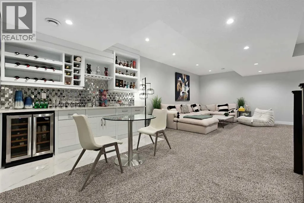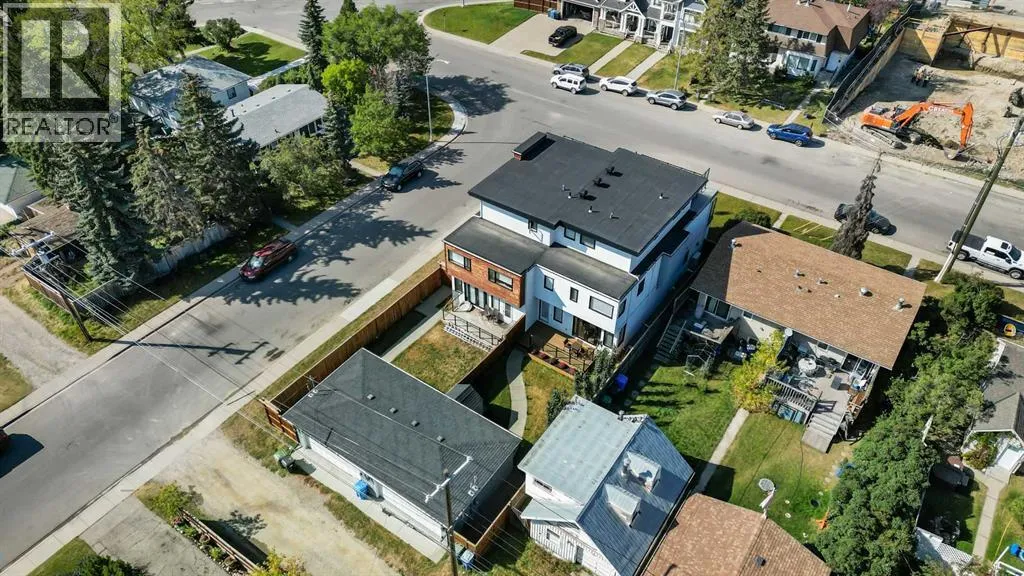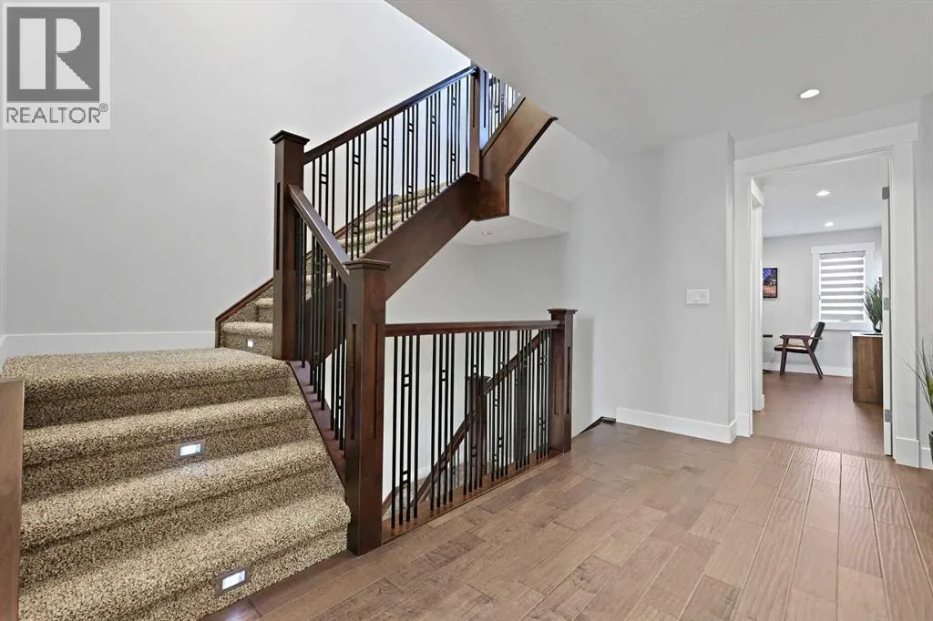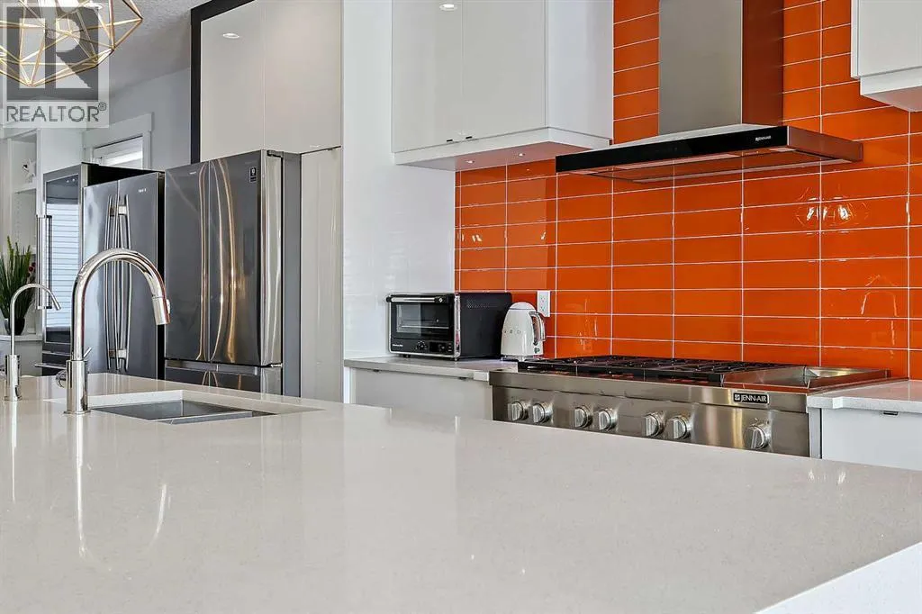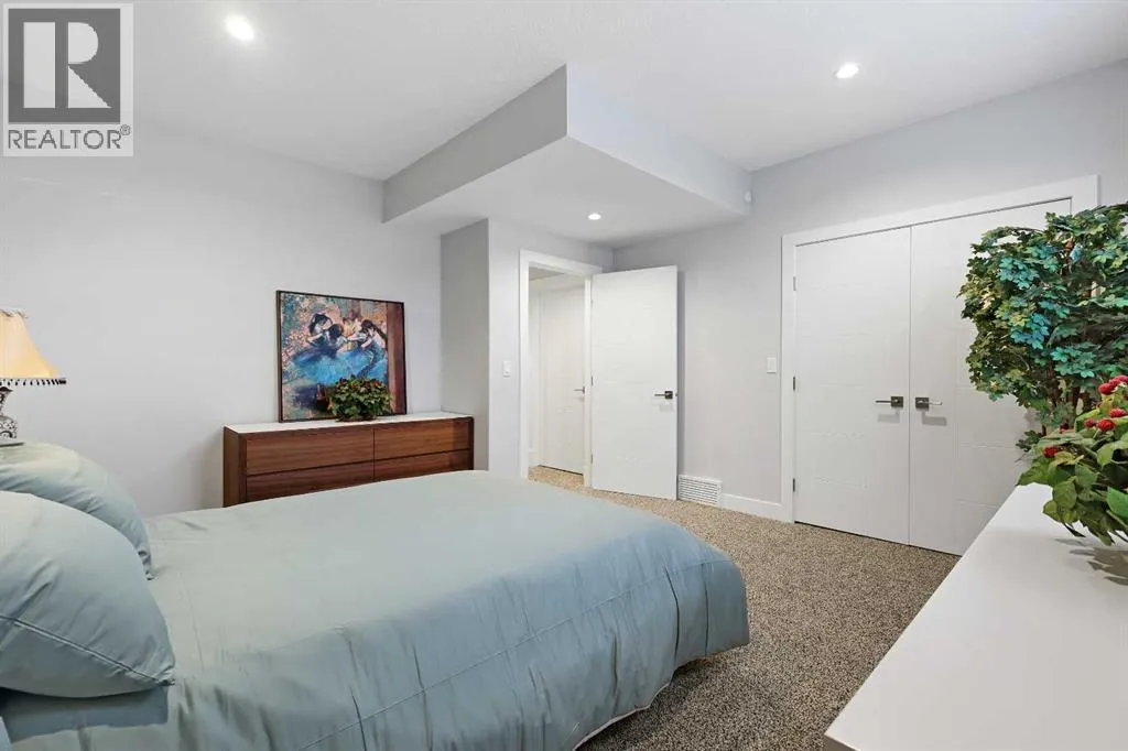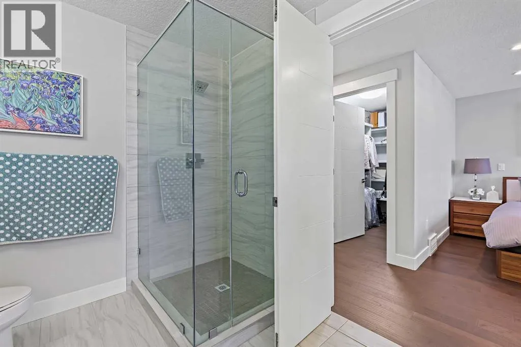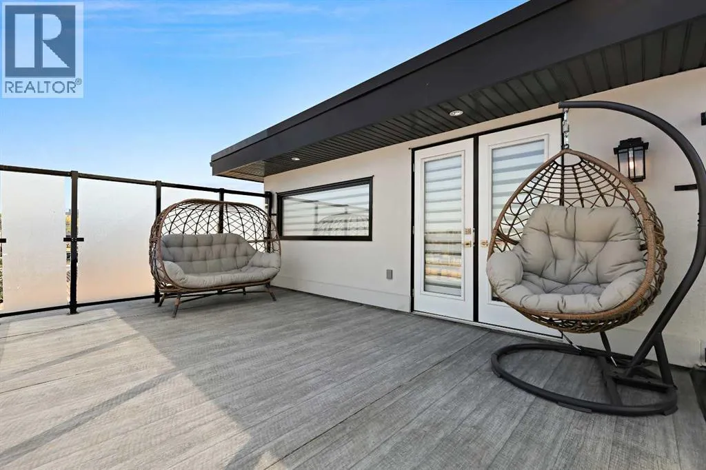 A rare opportunity in Montgomery â semi-detached home stands out with four fully finished levels, nearly 4000 sqft of developed living space, a private balcony, and a long list of premium upgrades. Steps from the Bow River pathway, Shouldice Park, Market Mall, and minutes to both Foothills and Children's Hospital, this location is as connected as it is private. Inside, the home is finished with luxury Canadian maple hardwood on all upper levels, layered lighting (including updated LED fixtures), and fresh paint throughout. The main floor showcases a sleek chef's kitchen with JennAir stainless steel appliances, including a gas cooktop, built-in oven, chimney hood fan, and integrated microwave. A full walk-in pantry, with double doors, and extended island with waterfall quartz complete the space. The spacious living area offers floor-to-ceiling windows and a gas fireplace framed by custom tile. The second level hosts dual primary suites, each with walk-in closets and five-piece ensuites featuring full tile, deep tubs, and separate glass showers. A bonus room with custom built-in shelving and a full laundry room with storage complete this level. On the top floor, a third bedroom, with its own 5 pc ensuite, walk in closet, and dedicated office that's open to a private rooftop balcony with unobstructed views. The fully developed basement includes a fourth bedroom, full bath, in-floor heating, large rec room with wet bar and beverage fridge, and extra storage. Additional upgrades include: newer high-capacity heat pump system, Kinetico water softener, dechlorinator, purified drinking tap, security cameras (x4), dual doorbell cams, Hunter Douglas window coverings and a freshly painted interior. Detached garage and landscaped yard, with a large deck and beautifully tended garden complete the package. (id:27476)