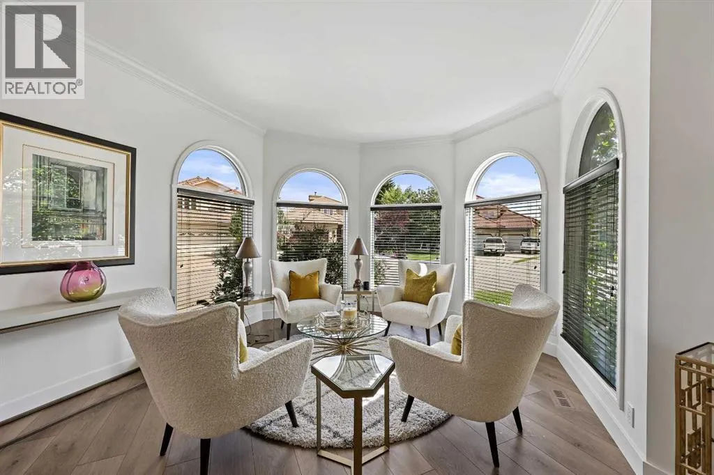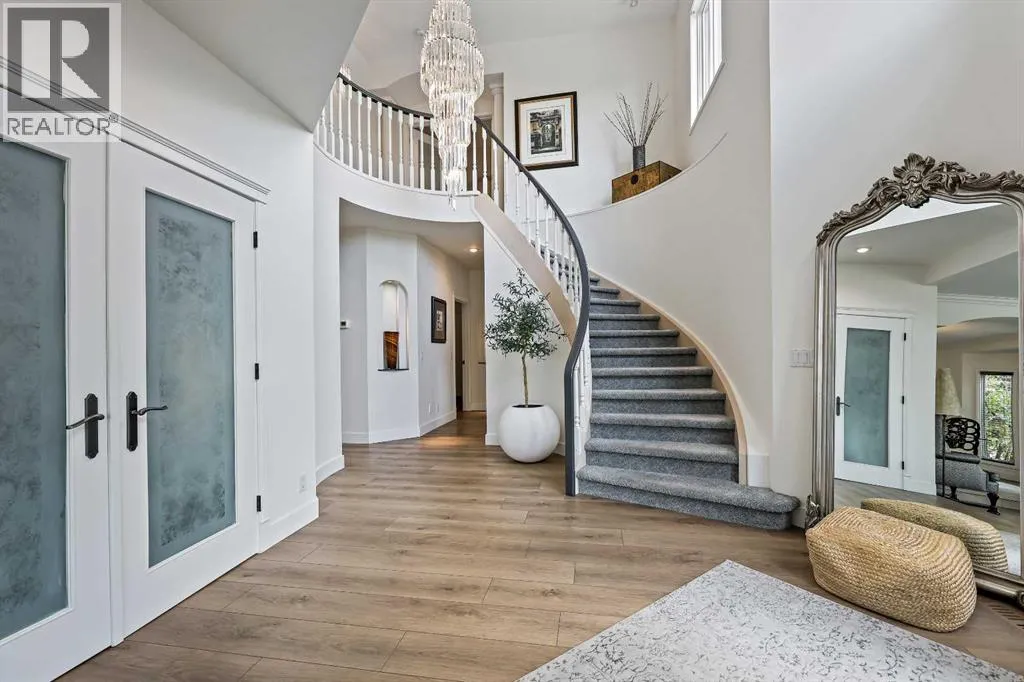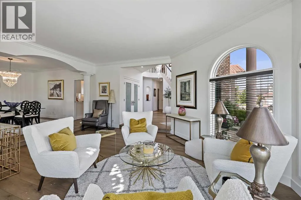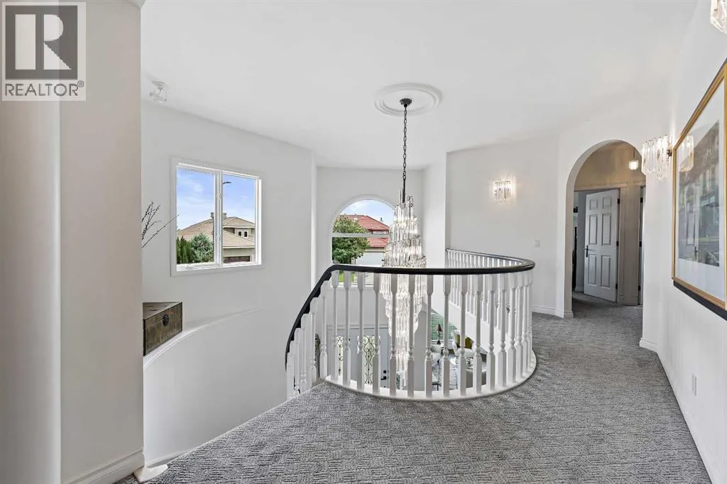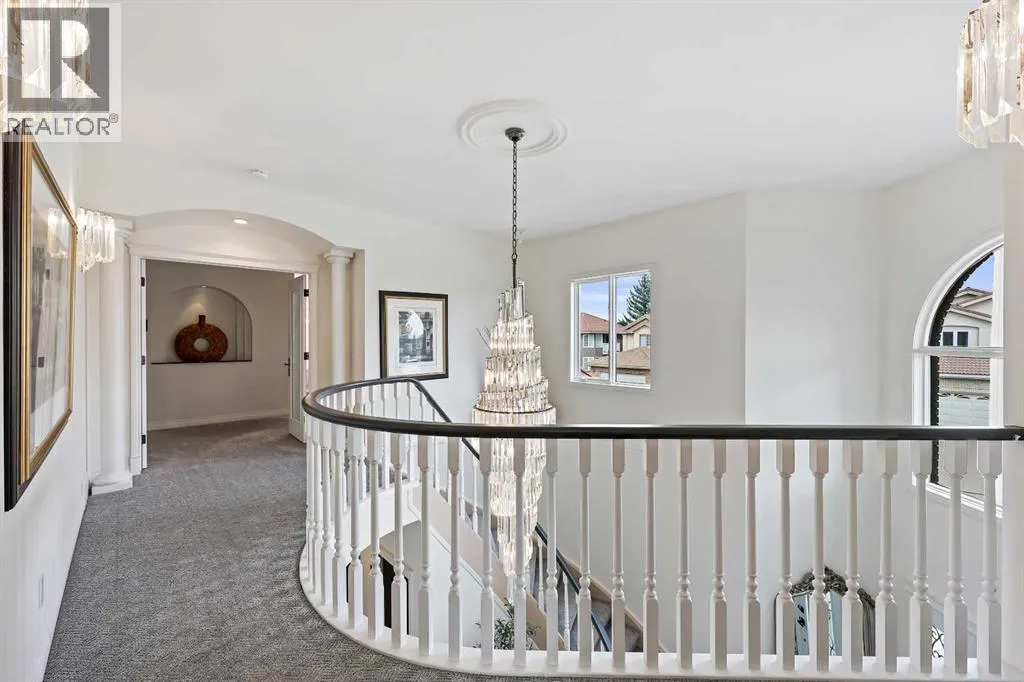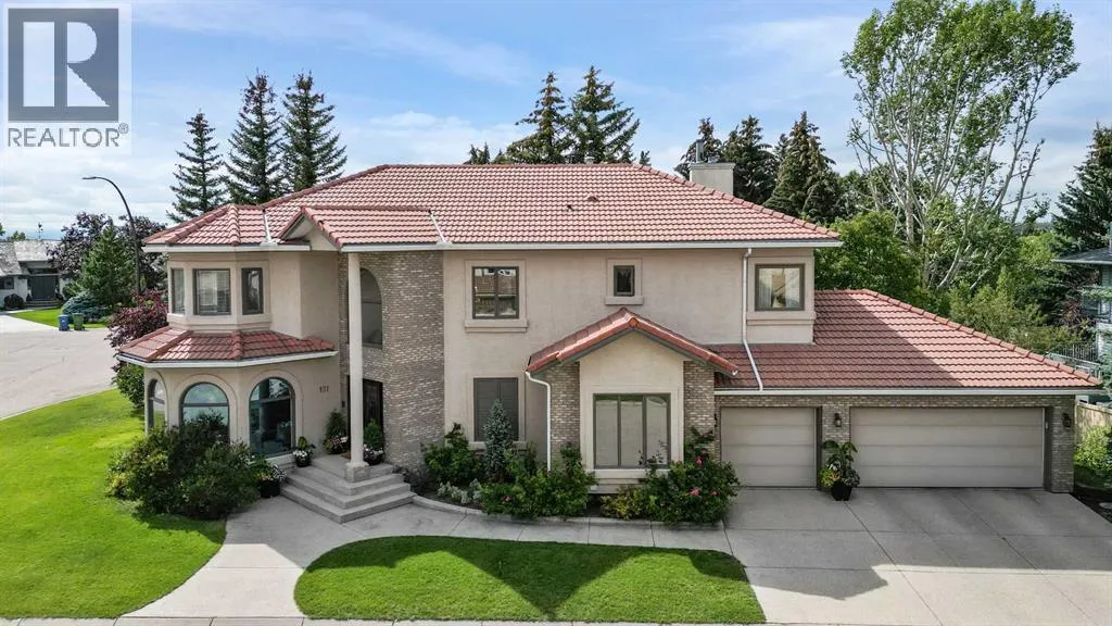 Nestled in the prestigious Uplands at Hawkwood, this custom-built luxury estate has been meticulously renovated, delivering a refined standard of living in one of Calgaryâs most sought-after communities. Located on a serene cul-de-sac corner lot, this home boasts impressive curb appeal with manicured landscaping, a stately oversized triple-car garage, and elegant exterior detailing that sets the stage for what lies within.Step inside the soaring 20-ft foyer, illuminated by a dazzling crystal chandelier, and experience timeless elegance throughout. Gleaming hardwood floors flow seamlessly from the sunlit bay-window living room into a formal dining space framed by crown mouldingâideal for entertaining. A private front-facing executive den provides the perfect work-from-home setting.At the heart of the home is a truly remarkable chefâs kitchen featuring dual quartz-topped islands, a full Miele appliance package including built-in ovens and gas cooktop, an espresso station, a wine fridge, walk-in pantry, and a dramatic floor-to-ceiling glass wine display. The adjacent open-concept family lounge offers seamless access to the west-facing wrap-around new composite deck, ideal for sunset dining and year-round enjoyment.Upstairs, the primary suite is a relaxing retreat complete with a fireplace lounge, a spa-inspired 5-piece ensuite, and a fully customized walk-in dressing room. Three additional bedroomsâone with a private ensuiteâensure space and comfort for family and guests alike.The walkout lower level offers generous living space, featuring a recreation lounge, billiards and theatre area, 5th bedroom, full bath, and a secluded hot tub area tucked under the covered deck. Recent upgrades include two 60-gallon hot water tanks (2024), dual high-efficiency furnaces (2024), an irrigation system, and premium security blinds.Exclusive to Uplands residents is access to the private Uplands Recreation Centre, offering a pool, fitness facilities, and courts for tennis, pickleb all, basketball, and squash. With quick access to John Laurie Blvd and Crowfoot Centre, this is a rare opportunity to own a move-in ready estate home in an exceptional location. (id:27476)