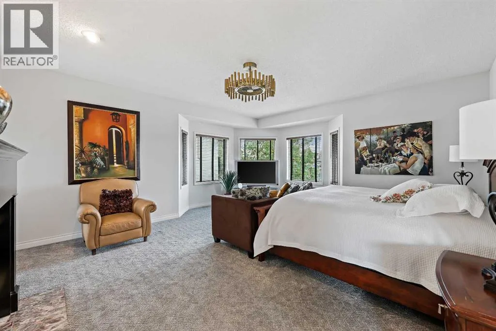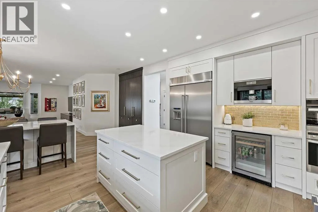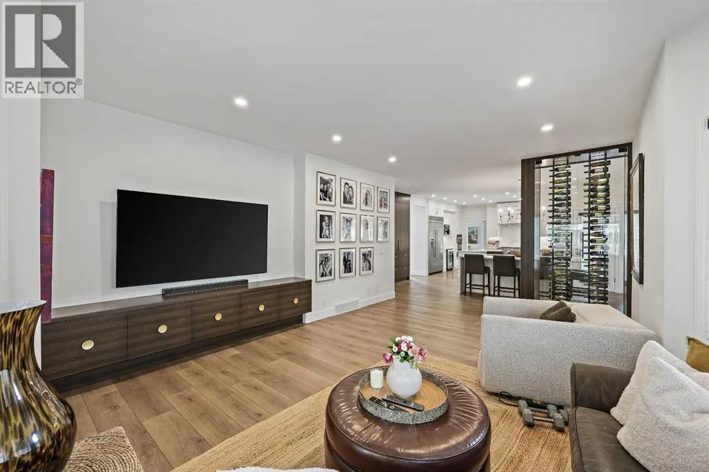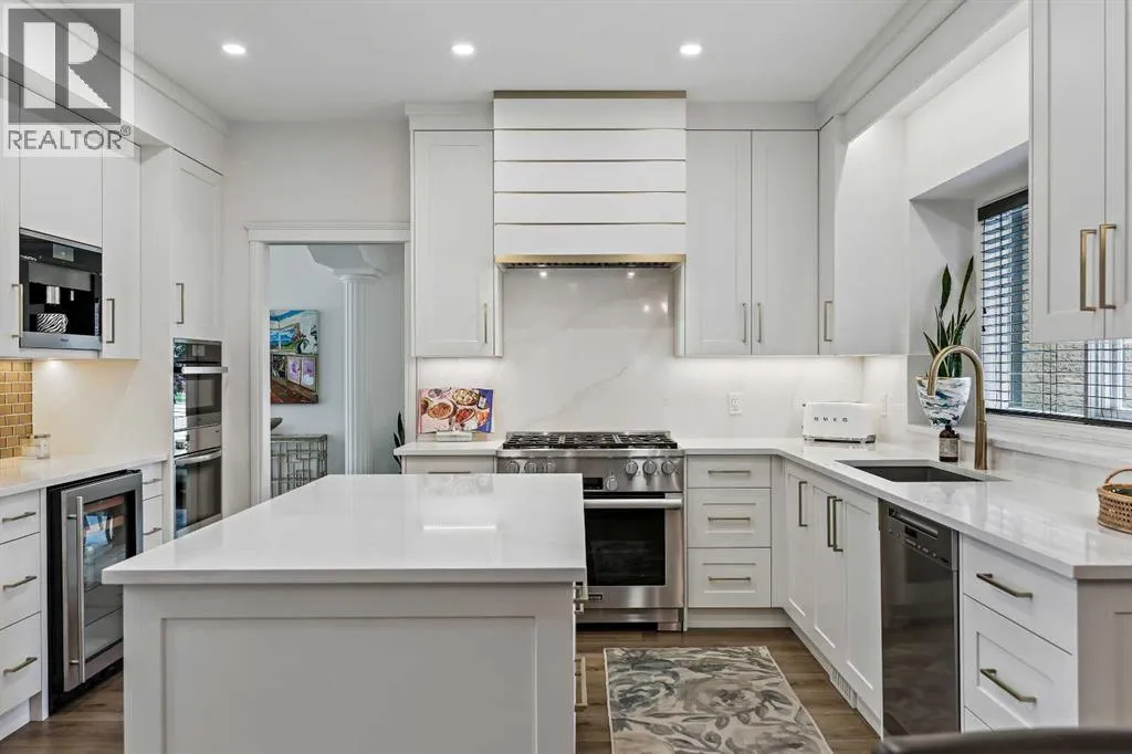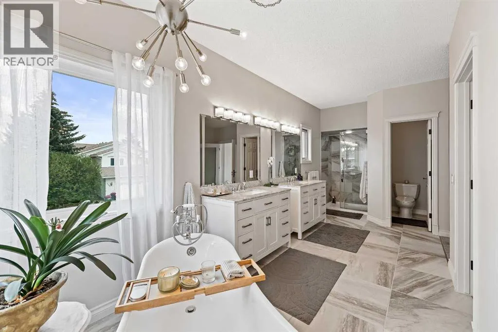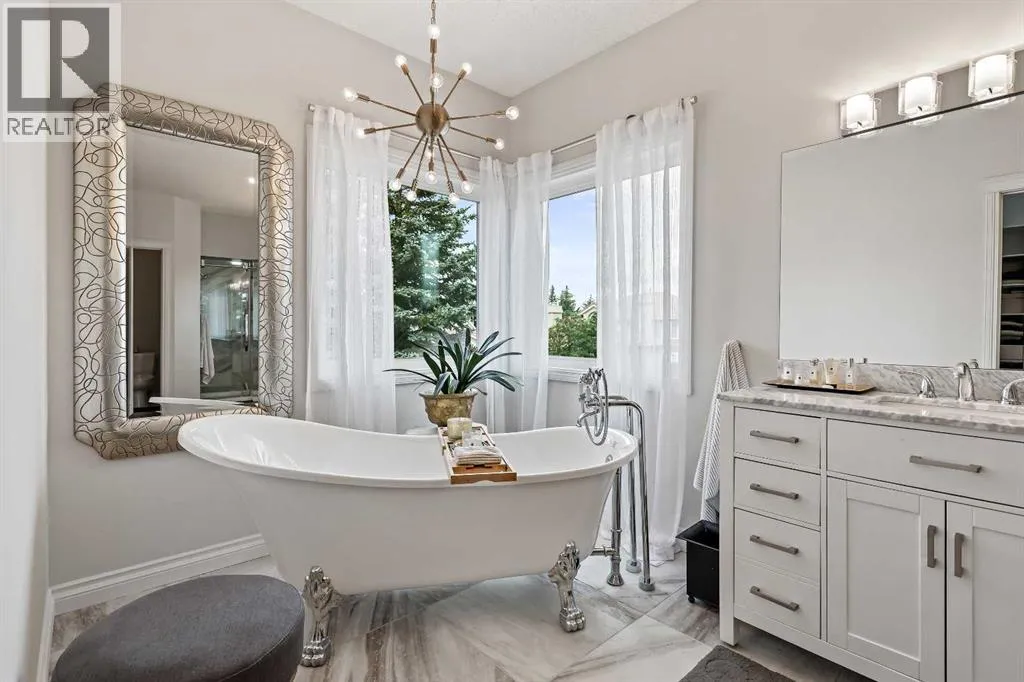 Nestled in the prestigious Uplands at Hawkwood, this custom-built luxury estate has been meticulously renovated, delivering a refined standard of living in one of Calgaryâs most sought-after communities. Located on a serene cul-de-sac corner lot, this home boasts impressive curb appeal with manicured landscaping, a stately oversized triple-car garage, and elegant exterior detailing that sets the stage for what lies within.Step inside the soaring 20-ft foyer, illuminated by a dazzling crystal chandelier, and experience timeless elegance throughout. Gleaming hardwood floors flow seamlessly from the sunlit bay-window living room into a formal dining space framed by crown mouldingâideal for entertaining. A private front-facing executive den provides the perfect work-from-home setting.At the heart of the home is a truly remarkable chefâs kitchen featuring dual quartz-topped islands, a full Miele appliance package including built-in ovens and gas cooktop, an espresso station, a wine fridge, walk-in pantry, and a dramatic floor-to-ceiling glass wine display. The adjacent open-concept family lounge offers seamless access to the west-facing wrap-around new composite deck, ideal for sunset dining and year-round enjoyment.Upstairs, the primary suite is a relaxing retreat complete with a fireplace lounge, a spa-inspired 5-piece ensuite, and a fully customized walk-in dressing room. Three additional bedroomsâone with a private ensuiteâensure space and comfort for family and guests alike.The walkout lower level offers generous living space, featuring a recreation lounge, billiards and theatre area, 5th bedroom, full bath, and a secluded hot tub area tucked under the covered deck. Recent upgrades include two 60-gallon hot water tanks (2024), dual high-efficiency furnaces (2024), an irrigation system, and premium security blinds.Exclusive to Uplands residents is access to the private Uplands Recreation Centre, offering a pool, fitness facilities, and courts for tennis, pickleb all, basketball, and squash. With quick access to John Laurie Blvd and Crowfoot Centre, this is a rare opportunity to own a move-in ready estate home in an exceptional location. (id:27476)
