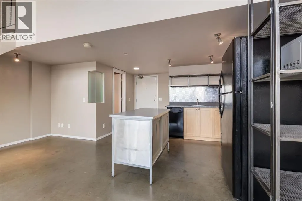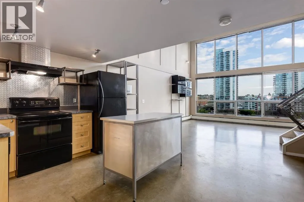 Why live in a typical condo when you can own a top-floor corner loft with 19'3" ceilings and 838 sq ft of wide open, light-filled space?.Welcome to Orange Lofts in the heart of East Village, Calgaryâs most walkable and architecturally distinct inner-city neighborhood. This one-bedroom, one-bath unit is a top-floor corner with no neighbors above and just one shared wall, giving you rare privacy in a buzzing urban setting..The north-facing windows fill the space with soft, ambient natural light all dayâperfect for working from home or relaxingâwithout the heat of direct sun. You'll enjoy panoramic views of East Village, the Bow River, and Calgaryâs skyline..Inside, you'll find polished concrete floors, exposed concrete walls, steel railings, and a lofted bedroom that overlooks the open living space. The layout is flexible, the design is timeless, and the vibe is unmistakably urban..?? Location Highlights (All within Walking Distance):.* RiverWalk Pathways + Bow River access* Studio Bell, Calgary Central Library, Confluence, and Simmons Building* Saddledome + the future event centre and entertainment district* C-Train station for fast downtown access* Local grocery stores, cafes, breweries, and restaurants* Calgary Zoo and St. Patrickâs Island nearby* Blocks from Inglewood and downtown core shopping.Extras include titled underground parking, separate storage, in-suite laundry, and access to a rooftop patio, bike storage, and resident lounge. Condo fees include heat, water, and electricity..This is not your average condo.?.Itâs open. Itâs private. Itâs steps from everything.?.And itâs one of a kind. (id:27476)