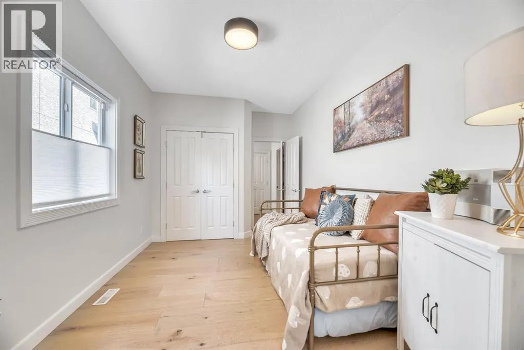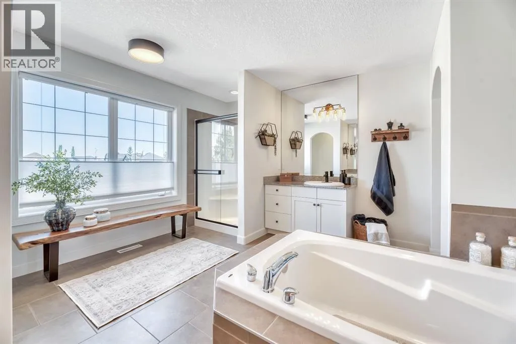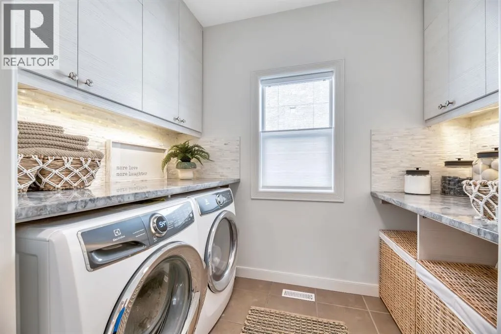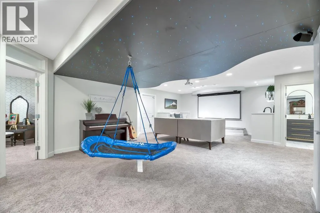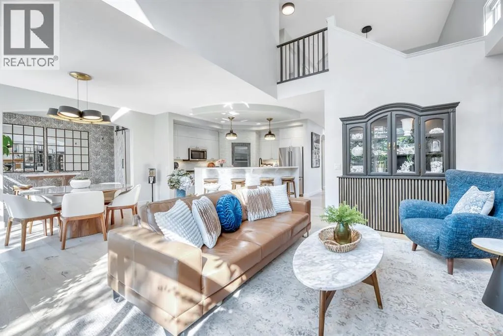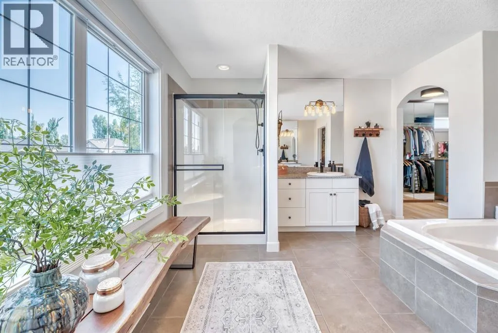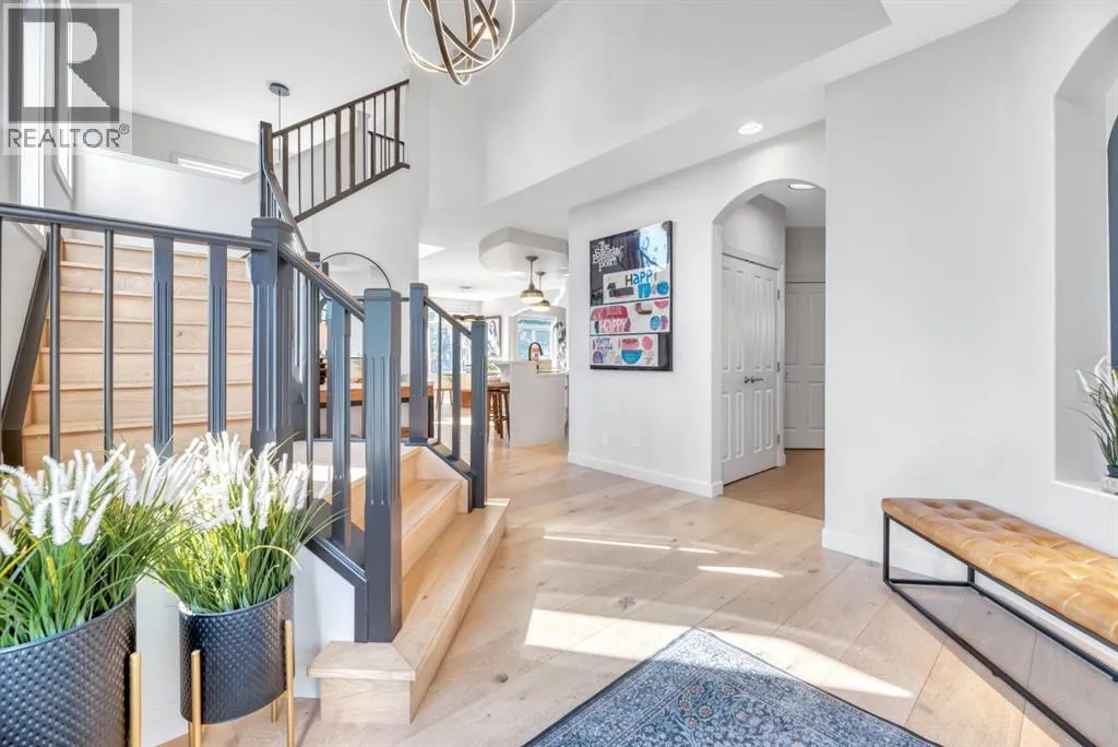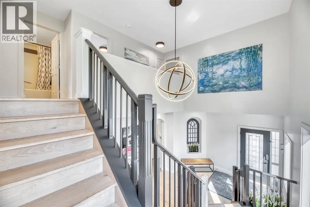 NEW PRICE! If you have been wondering about this home, book a visit and you will be WOWED! Welcome to this stunning custom designed home in the prestigious Estates of Cranston, siding onto green space and play park, surrounded by mature trees and walking distance to the picturesque ridge. From the moment you arrive, the impressive stone exterior and meticulously landscaped yard set the tone for whatâs inside.Step through the front door into a bright, airy foyer with soaring ceilings and a dramatic staircase that immediately draws you in. The open-concept main floor is bathed in natural light from oversized windows, showcasing beautiful wide-plank white oak hardwood floors and thoughtful designer touches throughout.The spacious great room features a modern chandelier, large picture windows with serene backyard views, and a warm yet contemporary design perfect for both relaxing and entertaining. The dining area flows seamlessly into the stylish kitchen and cozy breakfast/study/reading nook, step out to the backyard for easy indoor-outdoor living. Additionally, the main floor offers a full bedroom and a full bathâideal for generational living, guests or a home business. This home also offers the option to be accessible on the main floor - can offer a wheelchair lift from the garage to the main. The beautiful kitchen offers a curved island for people to gather around, gorgeous finishes, newer Kitchenaid appliances (with extended warranty) and a walk-through pantry from the triple heated garage (with double drive door and INDOOR HOT TUB [negotiable] to relax), seamlessly connecting to the dining and living areas. The lighting selections offered in the home is a true DELIGHT!Upstairs, youâll find two spacious bedrooms, a full bath, and a massive primary oasis highlighted by a brick feature wall - industrial yet warm and an enclave vaulted dormer. The luxurious ensuite offers a spa-like experience with dual vanities, soaker tub, oversized shower, and a 21â long walk- in closet with another vaulted dormer. There is definitely not a lack of storage in this home! The finished basement is a true showpiece with a stunning nightfall starry ceiling light feature, large recreation theatre room with projector and power screen, wet bar, home gym (easily converted back to a bedroom), den, additional bedroom, and full bath. So much space for all the activities! Peace of mind is paramount with a newer furnace (1 of 2) and hot water tank as is having summer comfort with Central Air (2 units). Outside, the backyard is a private oasis with lush landscaping, mature trees, and access to nearby walking paths and parks. On the side of the house there is a beautiful courtyard type space to enjoy the sun rise and watch your kids play in the park next to your home. With its prime location, functional design, and high-end renovations, this home delivers the perfect balance of elegance, style and comfort in one of Calgaryâs most sought-after communities. (id:27476)