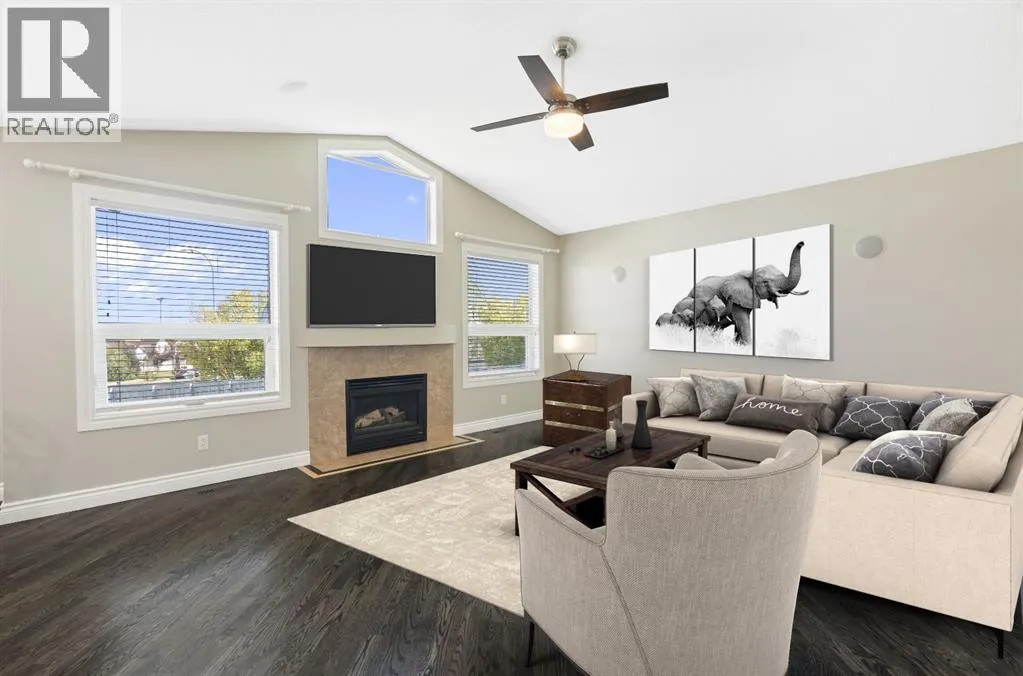 Incredible custom-built home on a pie-shaped lot in desirable Panorama Hills! The main floor features stunning site-finished, ebony-stained red oak hardwood floors and soaring vaulted ceilings with built-in speakers, creating a warm and inviting living space centred around a gas fireplace and triple-pane windows. The kitchen impresses with Corian countertops, an under mount sink, and recently upgraded stainless steel appliances, flowing seamlessly into the dining and living areas that overlook the spacious nook and massive backyard. The main floor also features an updated 4-piece bath, a large bedroom, a flexible second bedroom or office, and an additional flex space/living room off the kitchen. Upstairs, the primary suite is a true retreat with a walk-in closet with custom shelving and a renovated ensuite boasting a corner jetted tub, separate shower, and Corian counters. The walkout basement is an entertainerâs dream, featuring 12-foot ceilings ideal for a pool table or large recreational area, a dry bar, a full 3-piece bathroom, and direct access to a paving stone patio. Step outside to a massive backyard with mature landscaping, underground sprinklers, perennials, two sheds, and a composite deck with glass railing and natural gas BBQ hookup. A thoughtfully designed concrete staircase on the side of the home leads to the basement entrance through sliding patio doors. With a brand new roof and eves troughs (2025), triple-pane windows, AC, fresh paint, updated lighting, a professionally cleaned home and carpets, and a garage with sturdy plywood walls, this home is truly move-in ready. Donât miss your chance to live in this thoughtfully upgraded, elegant, and spacious home in Panorama Hillsâperfect for entertaining, relaxing, and enjoying every comfort. (id:27476)