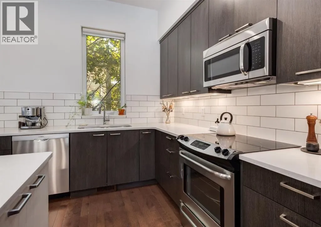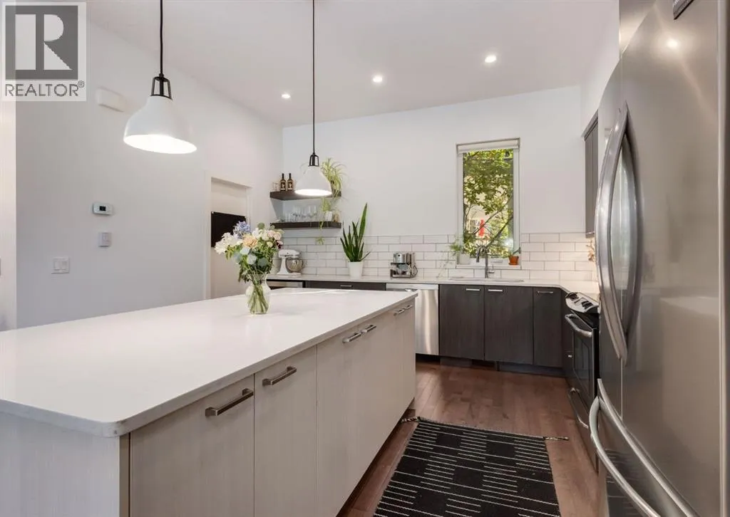 Stunning Corner Townhouse in the Heart of Mission with Versatile Main Floor Office Suite! Offering over 2,150 SF of developed living space across three levels, this corner townhouse combines thoughtful design, modern upgrades, and an unbeatable inner-city location. Large windows flood the home with natural light, creating a bright and welcoming atmosphere. The main level features a separate entry and is currently set up as an office suite with patio doors leading to an enclosed outdoor spaceâideal for working from home, meeting clients, or enjoying a private retreat. Future owners will love the flexibility: this level can easily be converted back into part of the main residence, or serve as a guest suite, home gym, or private office away from the family quarters. Upstairs, the open-concept main floor is perfect for entertaining, with a stylish living room, dining area, and a beautifully designed kitchen at the back. The kitchen showcases a large island with seating, stainless steel appliances, timeless subway tile backsplash, designated pantry, under-cabinet lighting, and plenty of counter space. A discreetly tucked-away powder room completes this level. The top floor hosts two large bedrooms, each with its own ensuite. The spacious primary suite offers newly installed custom closet built-ins, a luxurious ensuite with dual vanities, water closet, and a custom shower. The junior suite also enjoys a walk-in closet, while laundry is conveniently located on this level. Notable upgrades include TRIPLE-PANE windows, high ceilings on all levels, Hunter Douglas blinds, and an energy-efficient AC/heat pump installed in 2024. All of this is set in the highly sought-after community of Missionâjust steps to restaurants, cafes, shops, gyms, river pathways, and the downtown core. Floor plans and a 3D tour are readily available, providing a glimpse into this stylish townhome! (id:27476)