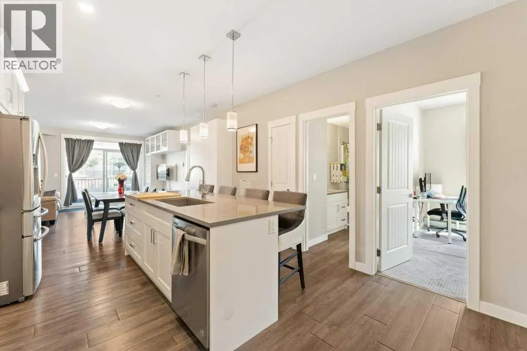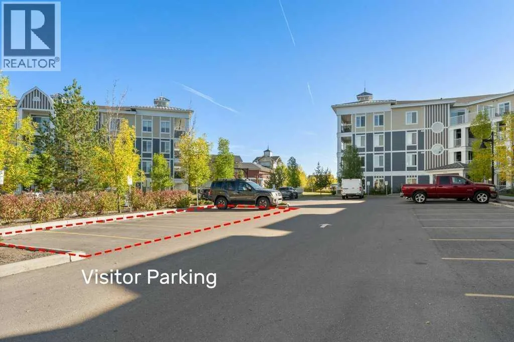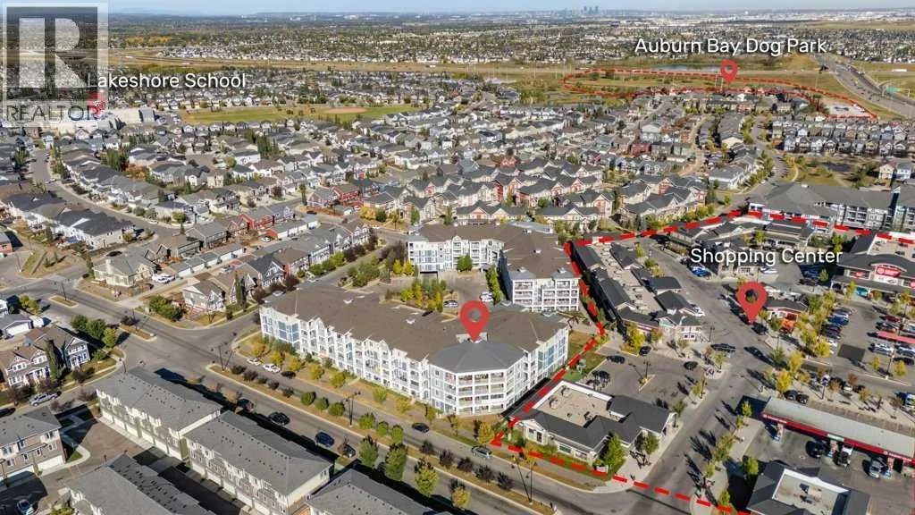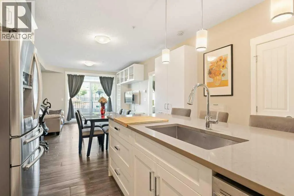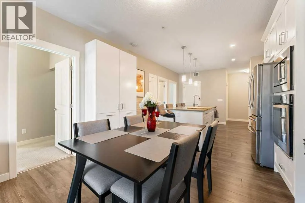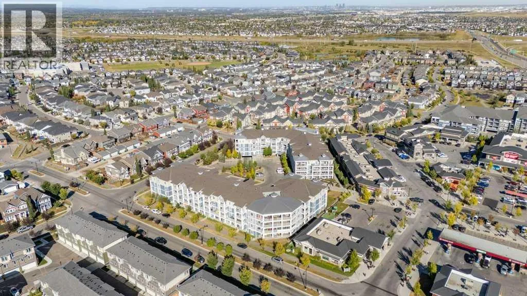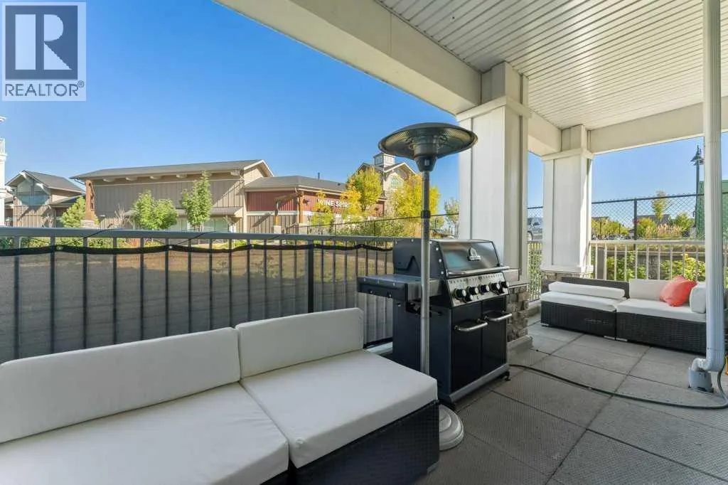 Welcome to this executive 2-bedroom, 2-bath condo in the desirable lake community of Auburn Bay! This superior Muskoka main floor corner unit is the largest floorplan in the buildingâs design, and with 9-foot high ceilings, it offers a spacious, light-filled layout that truly stands out. This Condo is perfect for those who are looking to downsize without compromising space and storage. From the moment you step inside, the large foyer sets the tone with plenty of room to welcome family and guests. The luxury vinyl plank flooring flows seamlessly into the beautifully upgraded kitchen, featuring an oversized quartz island with farmhouse-style undermount sinkâperfect for extra seating and casual dining. The kitchen is a chefâs dream with: upgraded stainless steel appliance package (including built-in wall oven & microwave), Ceramic cooktop range with hood fan, refrigerator with water line, 42" upper cabinets, pot drawers & under-cabinet lighting, and Bonus extra cabinetry on the opposite wall. The bright, modern color palette makes this space both functional and stylish. Thereâs also plenty of room for a full dining table, so you donât have to compromise on entertaining. The spacious living room is enhanced with custom shelving and cabinetry for storage and a perfect TV nook. From here, step out onto your expansive covered patio with a gas BBQ lineâideal for year-round outdoor enjoyment. The primary suite is a true retreat, benefiting from corner-unit windows that flood the room with natural light. The spa-inspired ensuite features: Dual undermount vanities with quartz counters, Walk-in glass shower with full-height designer tile and walk-in closet for ample storage. The second bedroom is bright and versatile, with a cheater door to the second full bathroom, which boasts matching quartz counters and upgraded finishes. Also included is your own in suite laundry with full sized stacked washer and dryer, (1) Titled underground heated parking stall, an assigned stora ge locker conveniently located right in front of your parking spot, plenty of visitor parking. Best of all, this building is PET FRIENDLY and just steps to shops, groceries, dining, and more. Plus, as part of the Auburn Bay community, youâll enjoy exclusive year-round lake accessâswimming, skating, paddleboarding, or simply relaxing at the beach. This rare floorplan doesnât come to market oftenâdonât miss your opportunity to call it home! (id:27476)