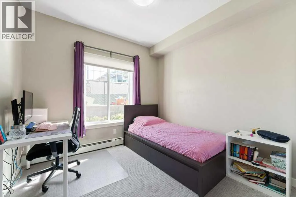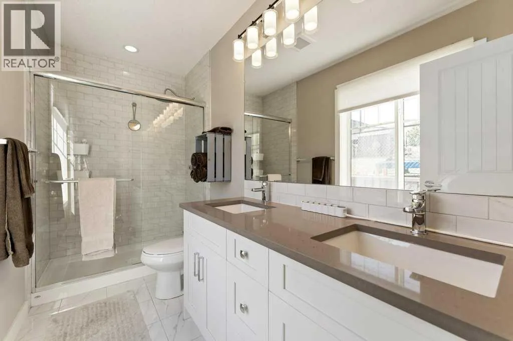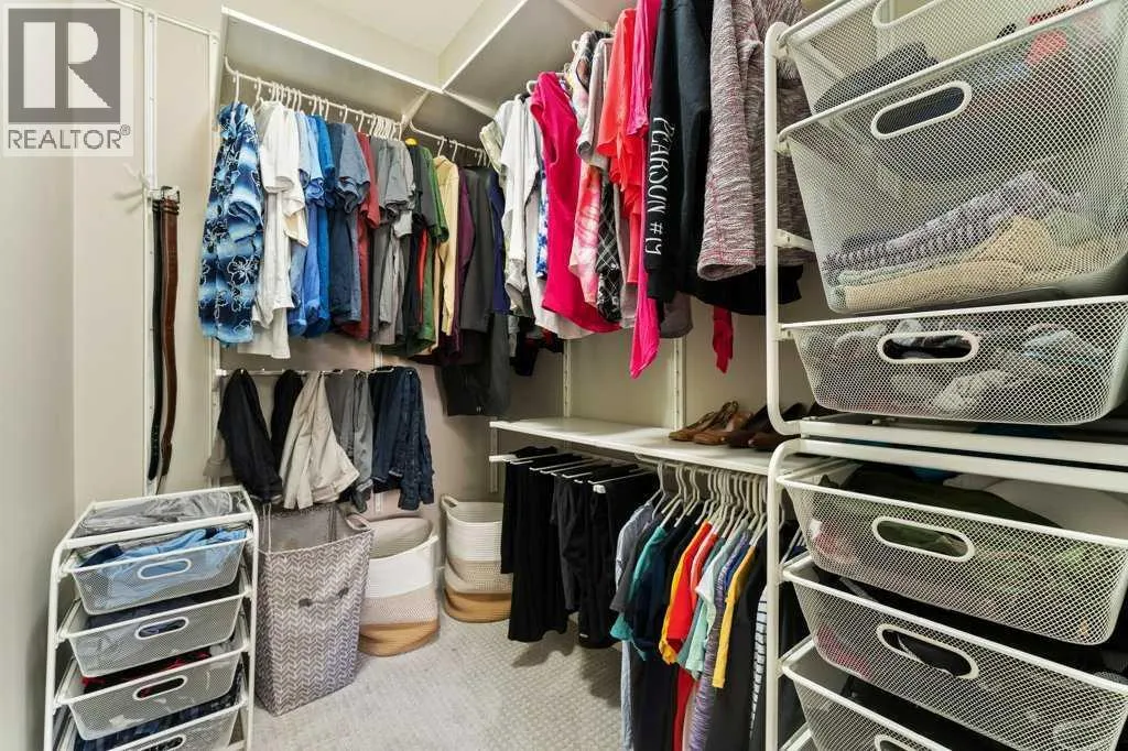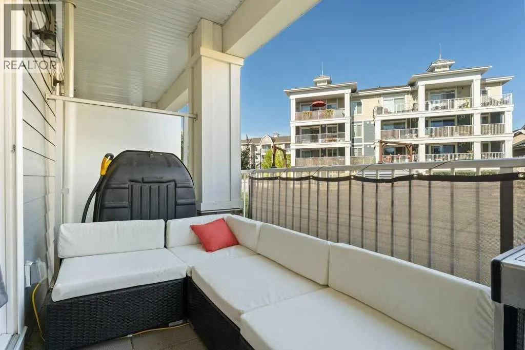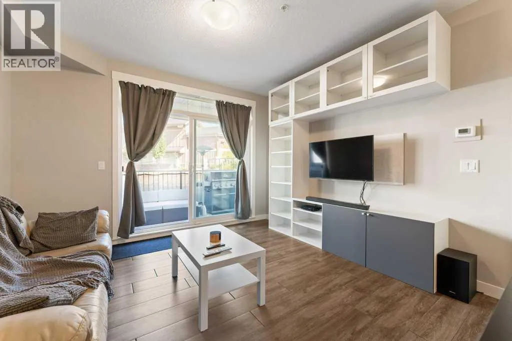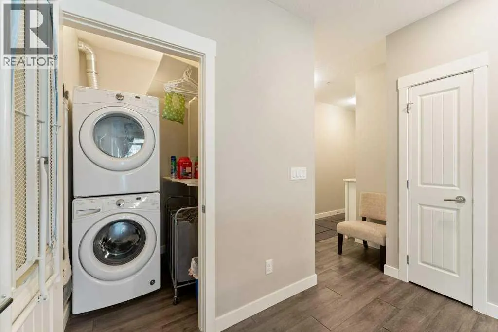 Welcome to this executive 2-bedroom, 2-bath condo in the desirable lake community of Auburn Bay! This superior Muskoka main floor corner unit is the largest floorplan in the buildingâs design, and with 9-foot high ceilings, it offers a spacious, light-filled layout that truly stands out. This Condo is perfect for those who are looking to downsize without compromising space and storage. From the moment you step inside, the large foyer sets the tone with plenty of room to welcome family and guests. The luxury vinyl plank flooring flows seamlessly into the beautifully upgraded kitchen, featuring an oversized quartz island with farmhouse-style undermount sinkâperfect for extra seating and casual dining. The kitchen is a chefâs dream with: upgraded stainless steel appliance package (including built-in wall oven & microwave), Ceramic cooktop range with hood fan, refrigerator with water line, 42" upper cabinets, pot drawers & under-cabinet lighting, and Bonus extra cabinetry on the opposite wall. The bright, modern color palette makes this space both functional and stylish. Thereâs also plenty of room for a full dining table, so you donât have to compromise on entertaining. The spacious living room is enhanced with custom shelving and cabinetry for storage and a perfect TV nook. From here, step out onto your expansive covered patio with a gas BBQ lineâideal for year-round outdoor enjoyment. The primary suite is a true retreat, benefiting from corner-unit windows that flood the room with natural light. The spa-inspired ensuite features: Dual undermount vanities with quartz counters, Walk-in glass shower with full-height designer tile and walk-in closet for ample storage. The second bedroom is bright and versatile, with a cheater door to the second full bathroom, which boasts matching quartz counters and upgraded finishes. Also included is your own in suite laundry with full sized stacked washer and dryer, (1) Titled underground heated parking stall, an assigned stora ge locker conveniently located right in front of your parking spot, plenty of visitor parking. Best of all, this building is PET FRIENDLY and just steps to shops, groceries, dining, and more. Plus, as part of the Auburn Bay community, youâll enjoy exclusive year-round lake accessâswimming, skating, paddleboarding, or simply relaxing at the beach. This rare floorplan doesnât come to market oftenâdonât miss your opportunity to call it home! (id:27476)