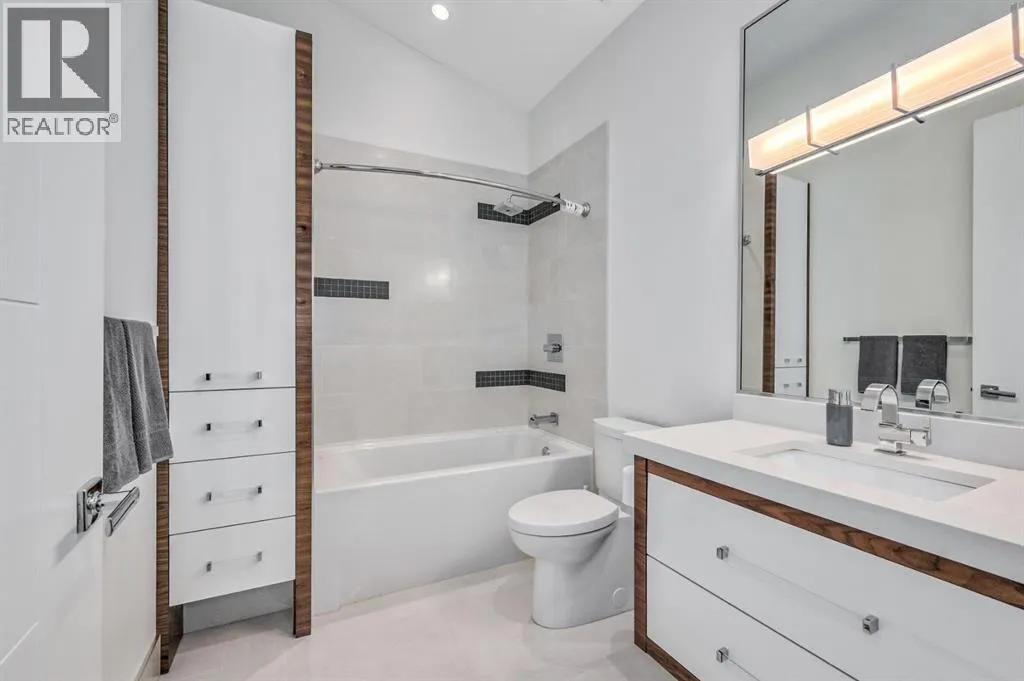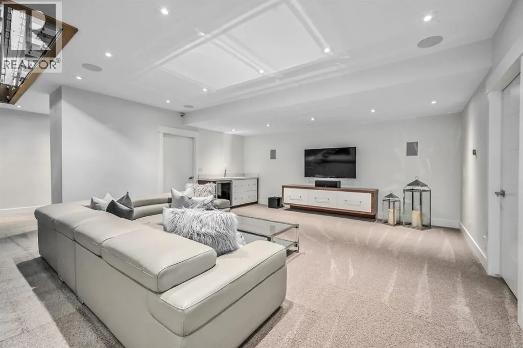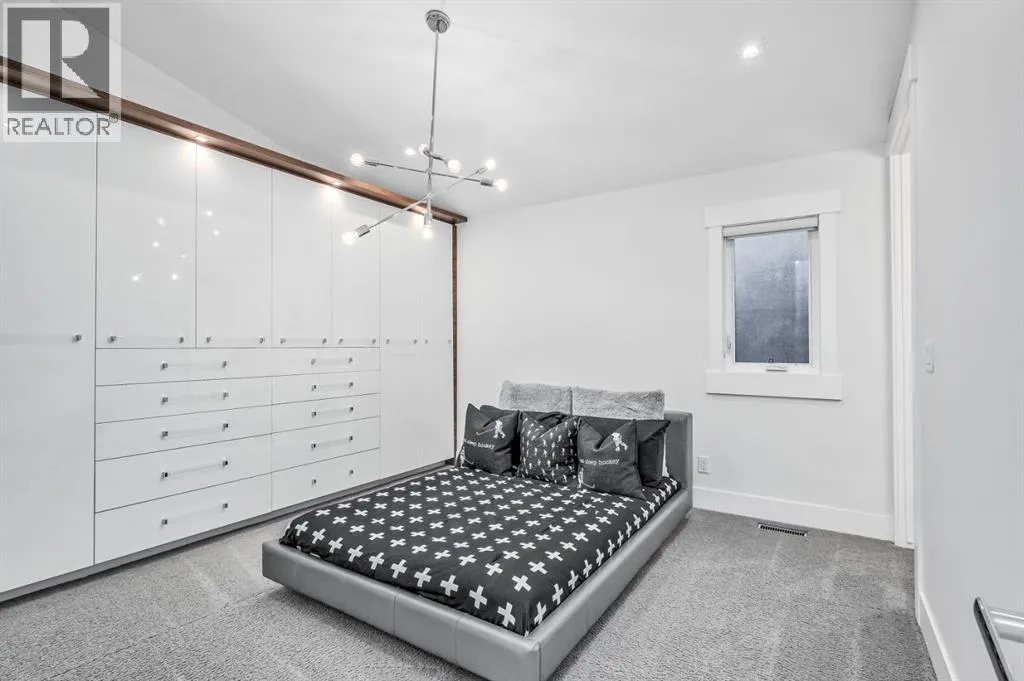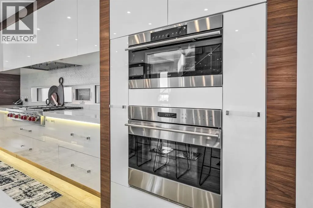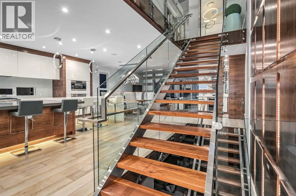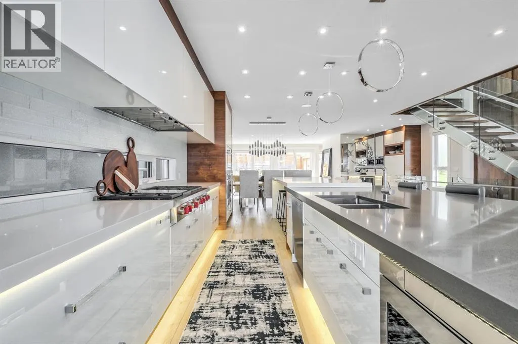 Located in Winston Heights. Welcome to a thoughtfully designed residence that seamlessly blends luxury, comfort, and timeless elegance. This stunning home features an open-concept layout, soaring 10-foot ceilings, and ambient LED lighting throughout â creating a warm and inviting atmosphere for both everyday living and upscale entertaining.At the heart of the home lies a chefâs dream kitchen, outfitted with premium Wolf appliances and a custom extended waterfall island with returns â ideal for hosting large gatherings or family get-togethers. Adjacent to the kitchen, a stylish wet bar includes a built-in Wolf coffee maker and sits beside a cozy second family room. Enjoy your morning coffee with the fresh breeze flowing in from the expansive rear sliding doors.Design details elevate every corner of this home, including a custom solid wood staircase paired with a matching feature wall, premium light fixtures, an Ortal 150 fireplace, LED accent lighting, and extensive custom woodwork â a cohesive design theme carried throughout all levels.Upstairs, the primary suite is a true retreat, featuring vaulted ceilings, an open-concept layout, a spacious walk-in closet, and a spa-inspired 5-piece ensuite. Each of the three additional upstairs bedrooms includes its own ensuite and unique charm â perfect for growing families or hosting guests without the hassle of shared bathrooms.The lower level offers even more space, including a generously sized living room with a second wet bar, a guest bedroom complete with built-in desk, and a full 3-piece bathroom â ideal for visitors, teens, or a private home office setup.Practical touches include a heated, insulated garage with custom storage cabinetry, and a beautifully landscaped backyard featuring Manitoba rock retaining walls, cedar fencing, Swedish Aspens, and an automatic drip irrigation system.Located in a highly desirable area, this home is walking distance to the Winston Golf Course, scenic walking/biking trails, off-leas h parks, and Georges P. Vanier School (Grades 6â9). Enjoy quick access to major roadways, downtown Calgary, SAIT, Foothills Hospital, and the airport â convenience without compromise.Donât miss the opportunity to own this rare and remarkable home. Call your favourite realtor and book your private showing today! (id:27476)