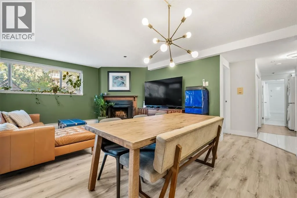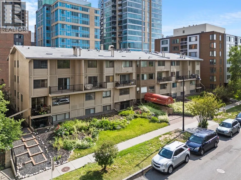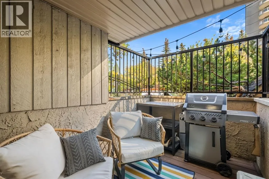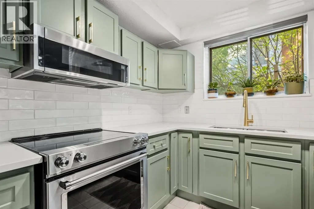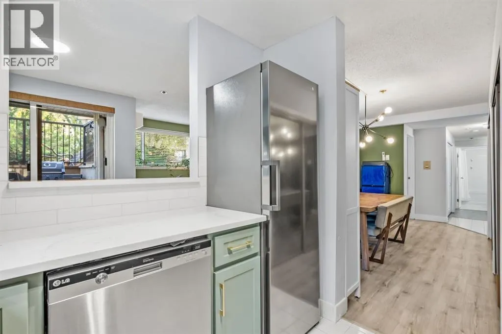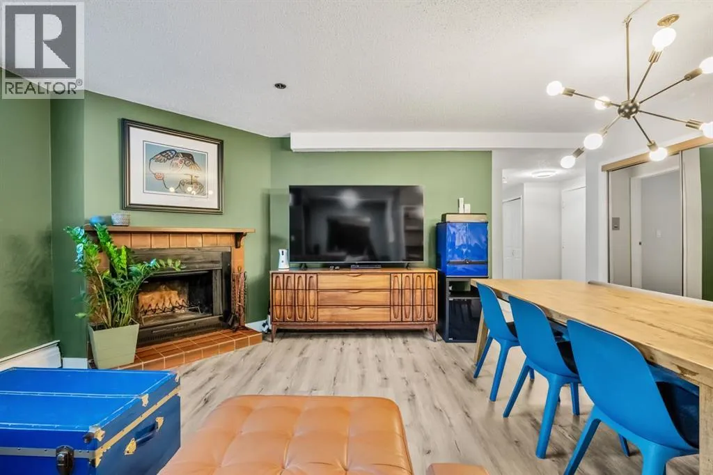 **PRICE REDUCED** Located on the main floor in the "Livingstone House" building and steps from the front door. This renovated below grade 2 bed & 1 bath unit offers the perfect mix of privacy, style, and convenience. The unit is situated on a quiet one way street with a dedicated bike path right out front and steps away from Eau Claire, the Bow River pathways, Princeâs Island Park, Calgaryâs iconic Peace Bridge, Eau Claire Promenade, Jaipur Bridge, the downtown core, and LRT stations. This bright and stylish unit has been thoughtfully updated over the past few years, bringing it back to life with modern finishes and a fresh inviting feel. As soon as you step inside, youâll notice the updated modern vinyl plank flooring that flows seamlessly through the unit and the pride of ownership thatâs evident in every detail. The smartly designed floor plan separates the living, dining, and kitchen area from the bedrooms, laundry, and 4-piece bath creating a functional layout with plenty of closet space for storage. The heart of this home is the stunning chefâs kitchen that was recently renovated in 2025 with no details overlooked. Brand new quartz countertops, sleek white tile backsplash, new cabinet doors & drawers, stainless steel under mount sink, stylish faucet, and a new stove and microwave hood fan. Every finishing was carefully selected to create a space thatâs both functional and luxurious. The kitchen opens up to a spacious dining area that can easily accommodate casual meals or festive holiday gatherings. Adjacent, the cozy living room features a window and a wood burning fireplace that sets the perfect mood for relaxing evenings. Off to the side a versatile nook that can serve as an office, another dining area, or a workout space. The sliding patio door leads to a private patio space making it an ideal spot for relaxing or entertaining with space for a BBQ. The primary bedroom is tucked away for privacy, with a spacious secondary bedroom that can double as an offic e or guest room, plus in suite laundry and more closet space for storage. To top it off, enjoy the convenience of a secure underground parking stall and the comfort of a AC unit â making this a turnkey home you can move into and enjoy year round! Experience the ultimate downtown lifestyle with riverside serenity along with a fully renovated unit where modern comfort meets unbeatable location! (id:27476)