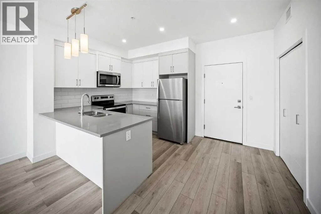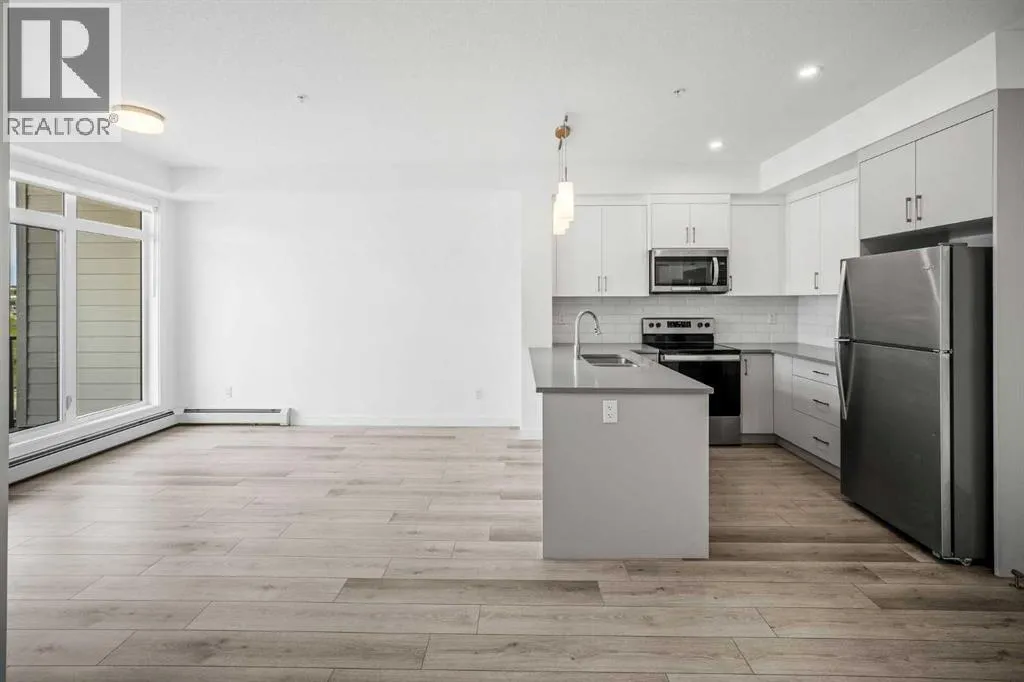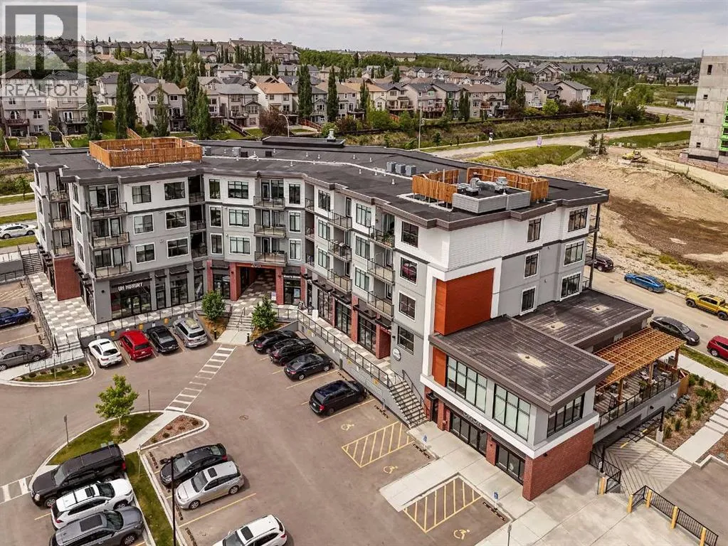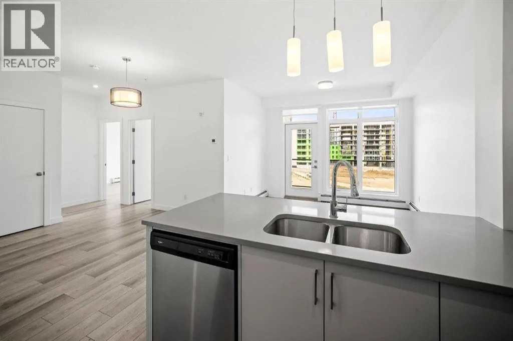 Welcome to this new upscale build in Springbank Hill! Immediate Possession! This very bright and open-concept 2 bedroom, 2 bath unit on the TOP FLOOR offers affordable luxury and convenient living near the Aspen Landing Shopping Centre, the new Aspen Village (being built) plus miles of walking paths and environmental reserves. Open floor plan features a peninsula kitchen with eating bar, high-quality cabinets, soft-close doors, under-mounted double sink, & Whirlpool stainless steel appliances. Full, private ensuite with double sinks off the main bedroom and a huge walk-in closet. Second bedroom with large window and easy access to second full bath and stacked washer/dryer with storage. Thoughtfully designed with expansive double pane windows, 9ft ceiling, warm coloured luxury vinyl plank flooring throughout, a spacious living /dining room, and bright windows and glass door to the balcony with BBQ gas line. The Orion Condos are bordered by a serene natural reserve with abundant walking trails and bike paths that connect throughout this vibrant and sought-after community. It comes with a titled underground parking stall with over-sized storage locker. Amenity room available. Amenities within walking distance include Safeway, Blush Lane, Royal Bank, TD, Starbucks, Cob's bread, Original Joeâs restaurant, Lady Bug Cafe and many more! Close to the 69 Street C-Train, Westside Rec Centre plus easy access downtown and to the mountains! Pets allowed. Fees include heat, water etc. (id:27476)