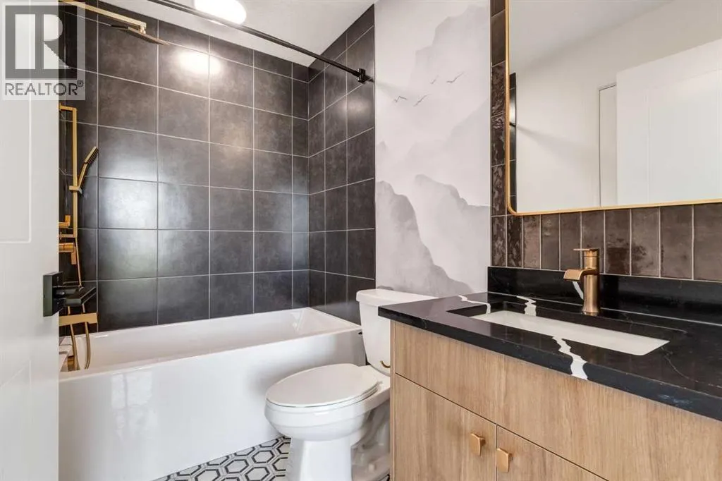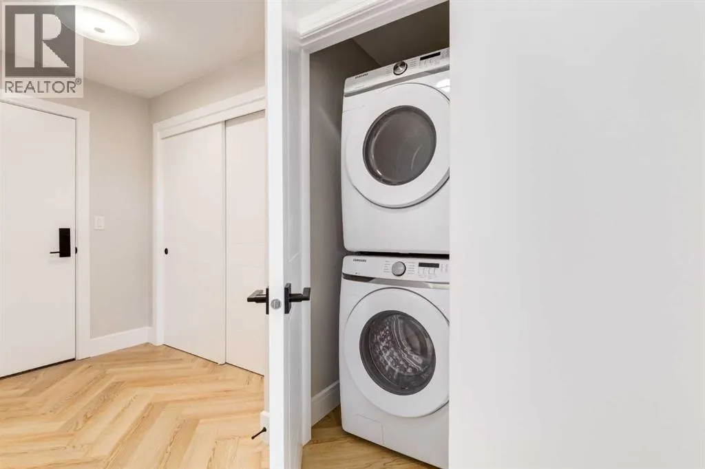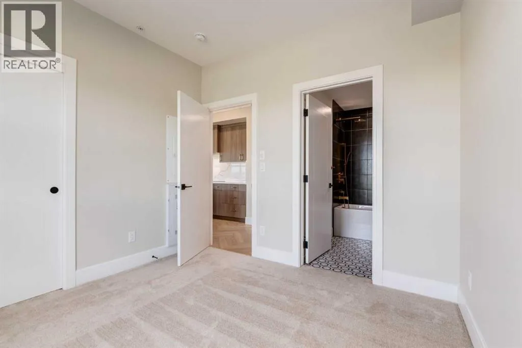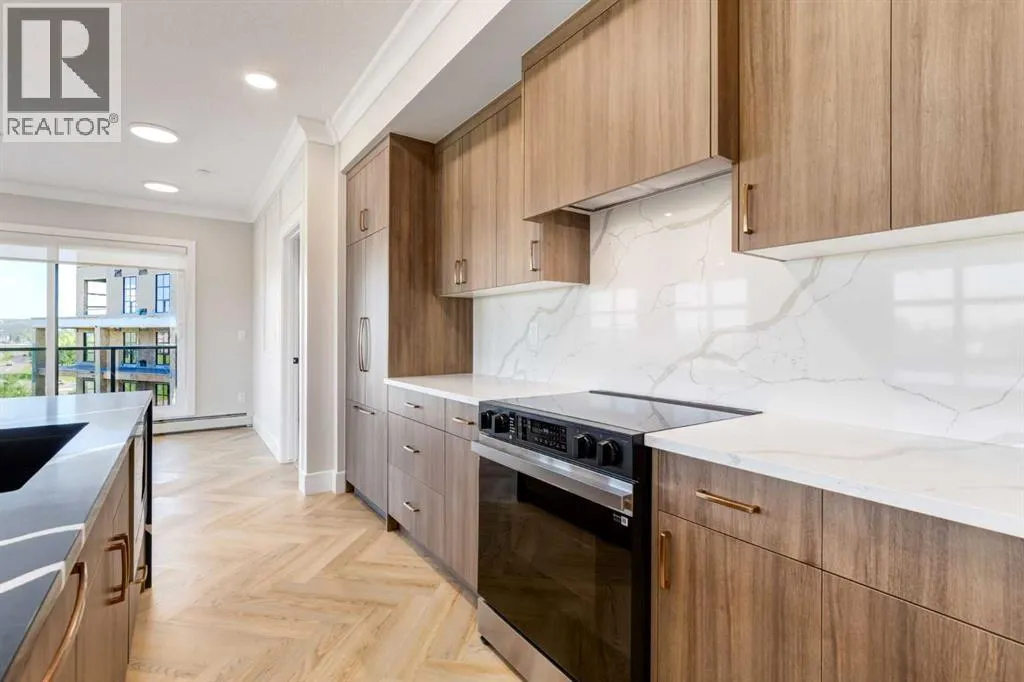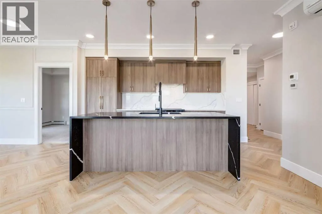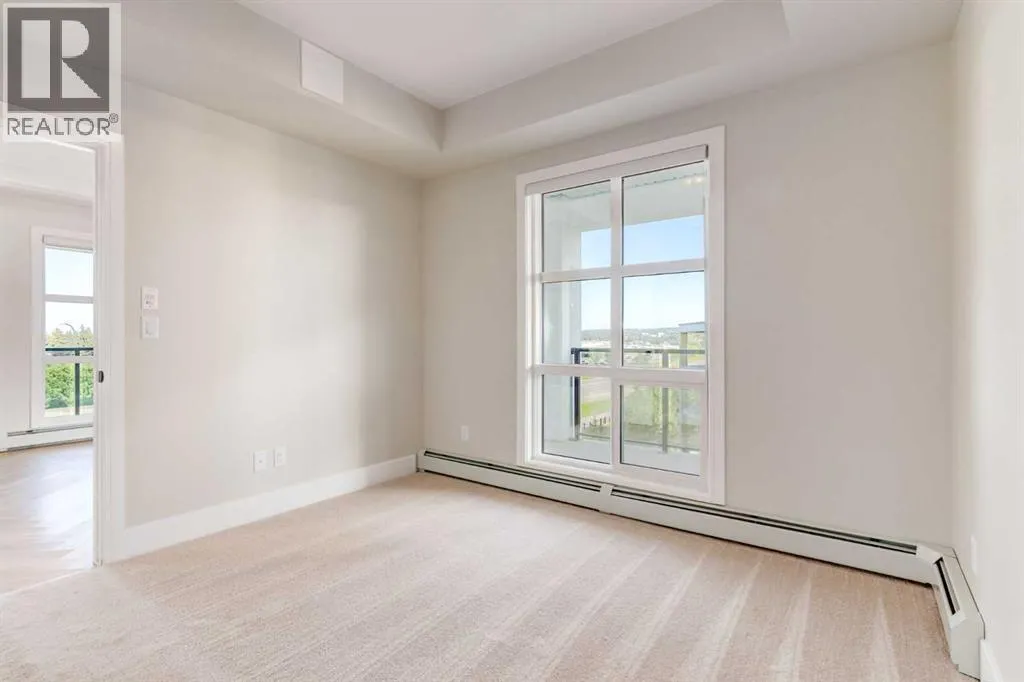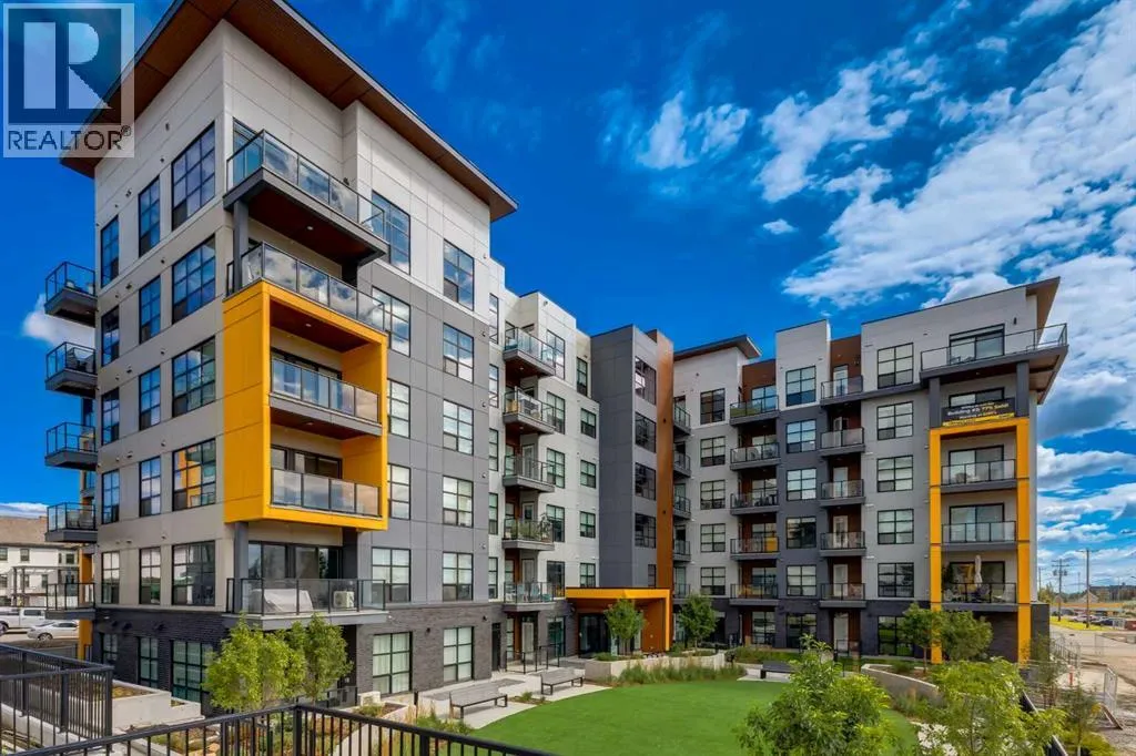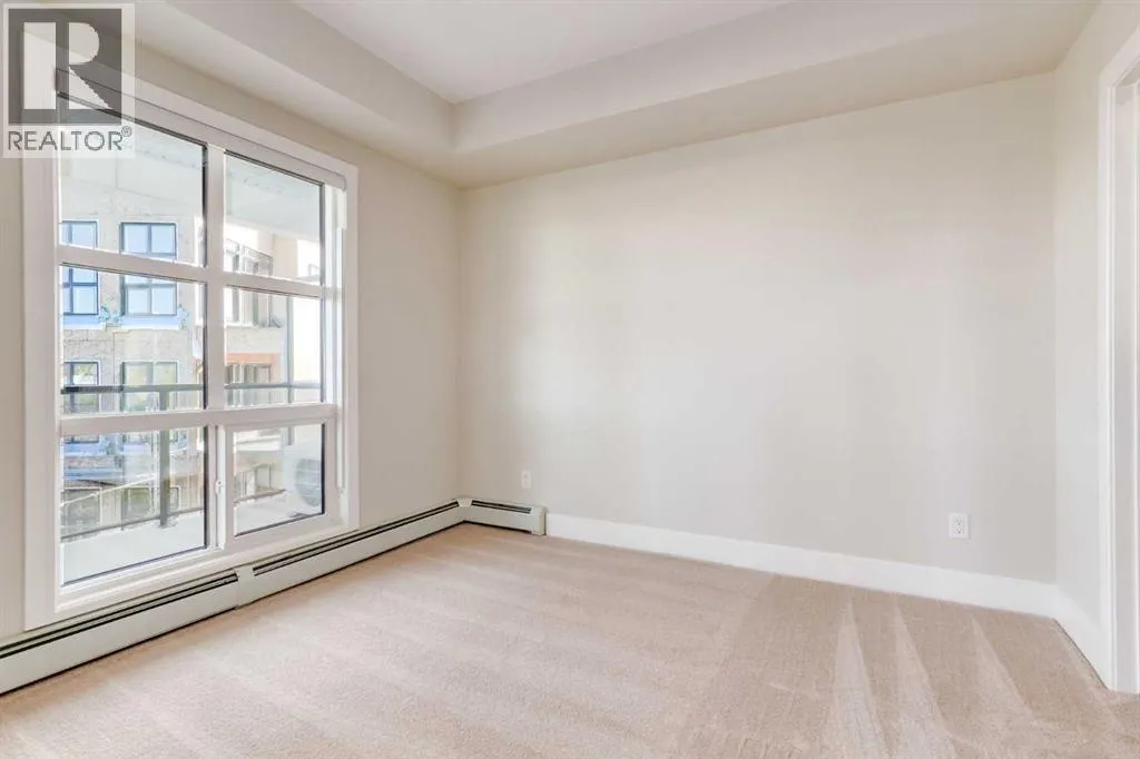 Discover the "Argento" floorplan by award-winning Rohit Homesâa beautifully designed 2-bedroom, 2-bathroom corner unit that offers the perfect balance of style and functionality. Located on the second floor in the sought-after Quesnay at Currie Barracks, this bright and airy home is flooded with natural sunlight, making it an ideal sanctuary for downsizers or anyone seeking a serene, low-maintenance lifestyle. Featuring the sophisticated Neo-Classical color palette, blending timeless elegance with modern finishes.. Designed by the award-winning Louis Duncan-He, the unit includes premium finishes such as 9' ceilings, quartz countertops with a waterfall edge, a quartz backsplash, full-height cabinetry, a stainless appliance package, bespoke light fixtures, and window coverings. The open-concept layout seamlessly integrates the kitchen, dining, and living areas, perfect for both relaxing and entertaining. The spacious primary bedroom includes a private ensuite, while the second bedroom and additional full bath offer comfort and flexibility for guests or a home office. Step outside to enjoy a large SE facing balcony, extending your living space into the outdoors. This pet-friendly and AIRBNB-friendly building offers titled heated underground parking and plenty of visitor spaces. Ideally located minutes from downtown, Mount Royal University, and the vibrant amenities of 17th Ave and Marda Loop, the Argento floorplan is a rare gem. Limited units are availableâsecure your slice of modern living today! **Photos are taken from existing building of the same models. Not of the exact unit ** (id:27476)