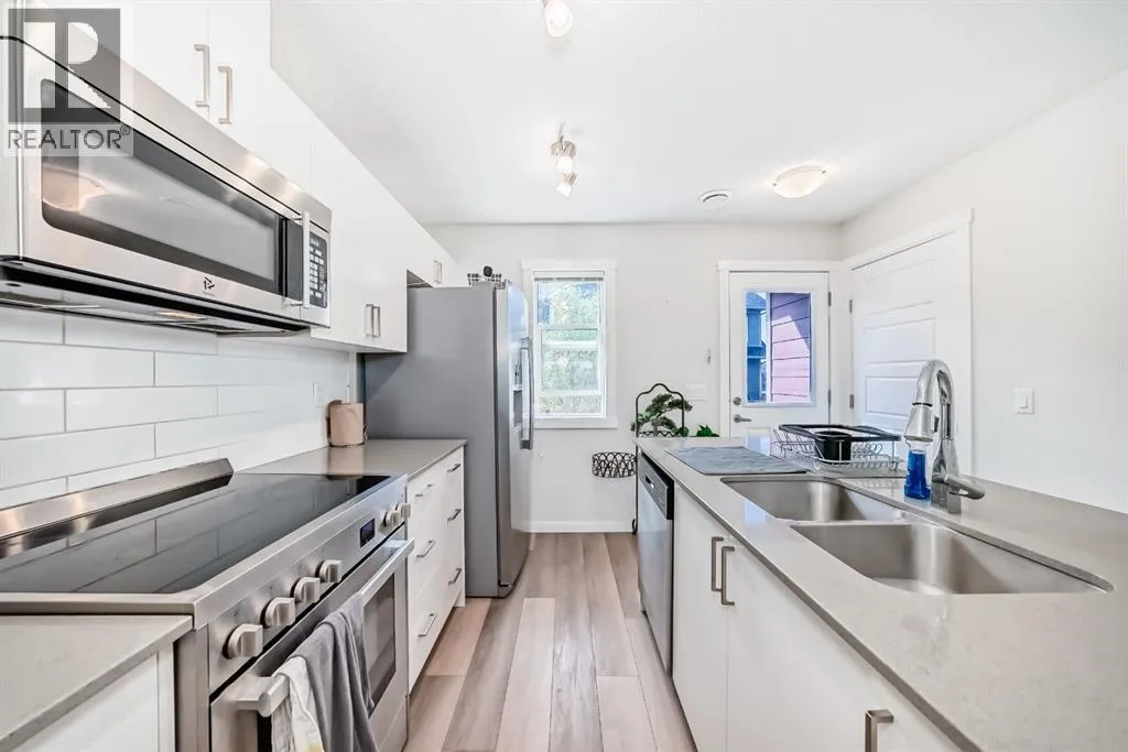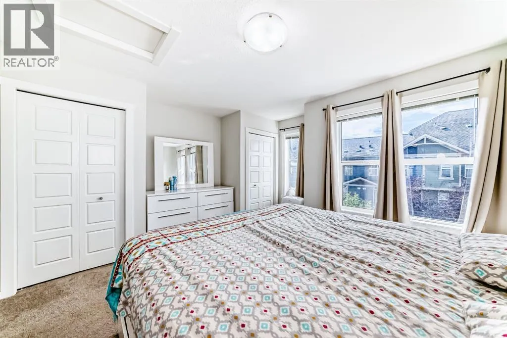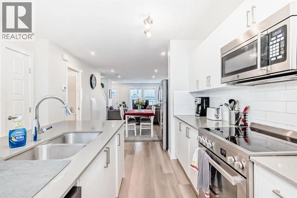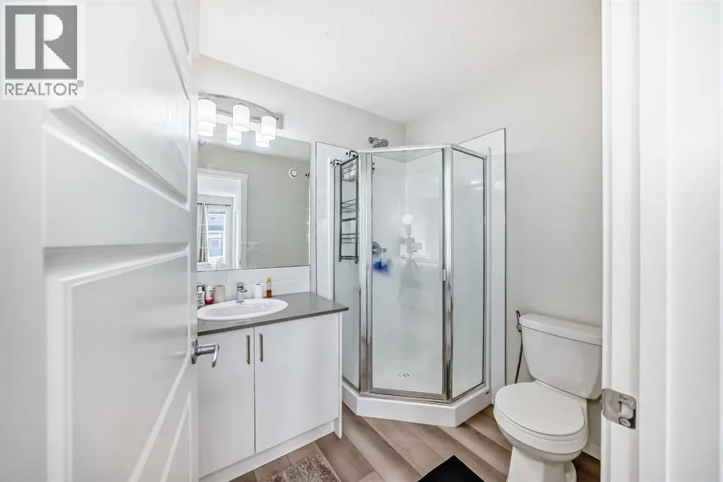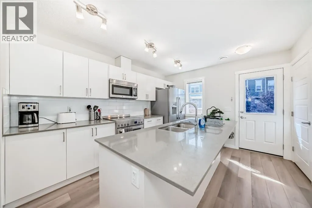 Welcome to this beautifully designed townhome in the desirable community of Cranston SE Calgary â offering modern finishes, thoughtful design, and incredible outdoor living spaces.The main floor features an inviting open-concept layout with a bright living room, spacious dining area, and a well-appointed kitchen with ample cabinetry and counter space. A convenient half bathroom completes the main level.Upstairs, youâll find a large primary suite with its own private ensuite bathroom. The second bedroom is generously sized and served by a separate full bathroom, making it perfect for family, guests, or a home office.On the third level, discover a large flex space that can be used as a family room, entertainment area, or home office. From here, step out onto the impressive rooftop balcony â the ideal spot to relax, entertain, and enjoy Calgaryâs summer evenings.Additional highlights include in-unit laundry, a private backyard for BBQs or gardening, and a dedicated parking stall conveniently located near the unit.All of this in the sought-after community of Cranston, with easy access to schools, parks, shopping, pathways, and major roadways like Deerfoot and Stoney Trail.This home combines style, comfort, and functionality â perfect for first-time buyers, downsizers, or investors. Book your showing today! (id:27476)