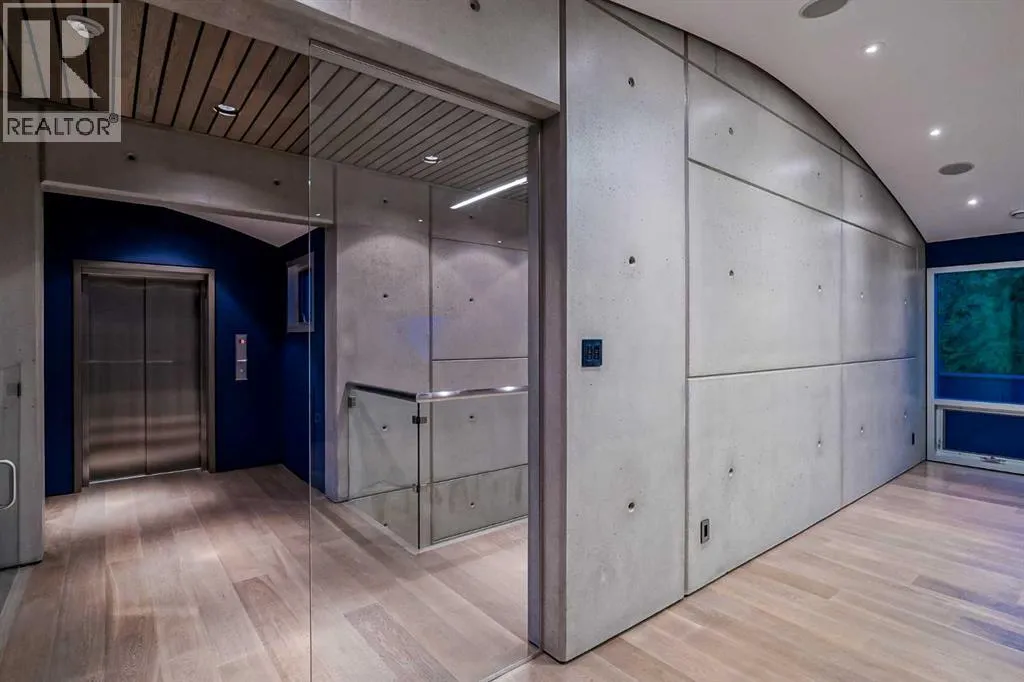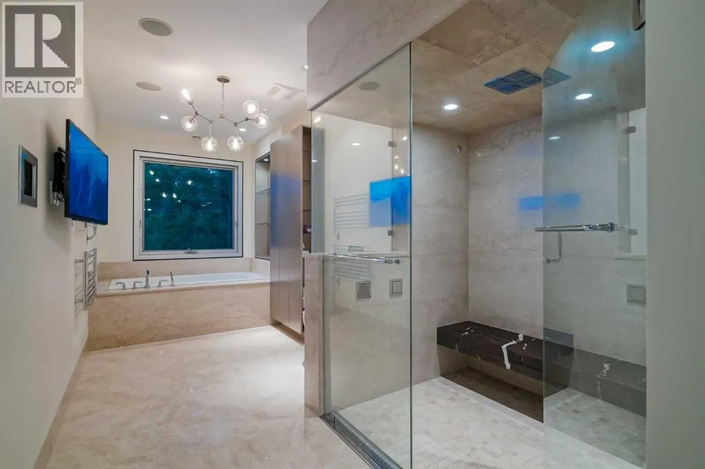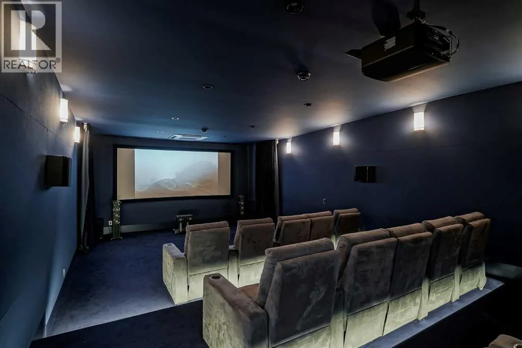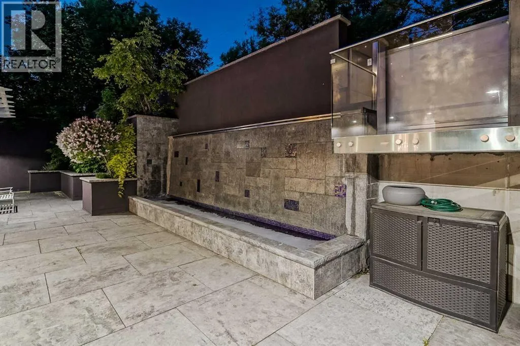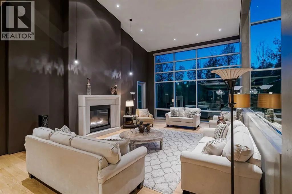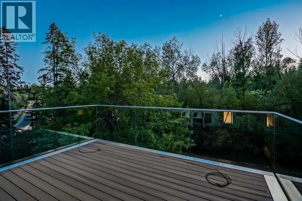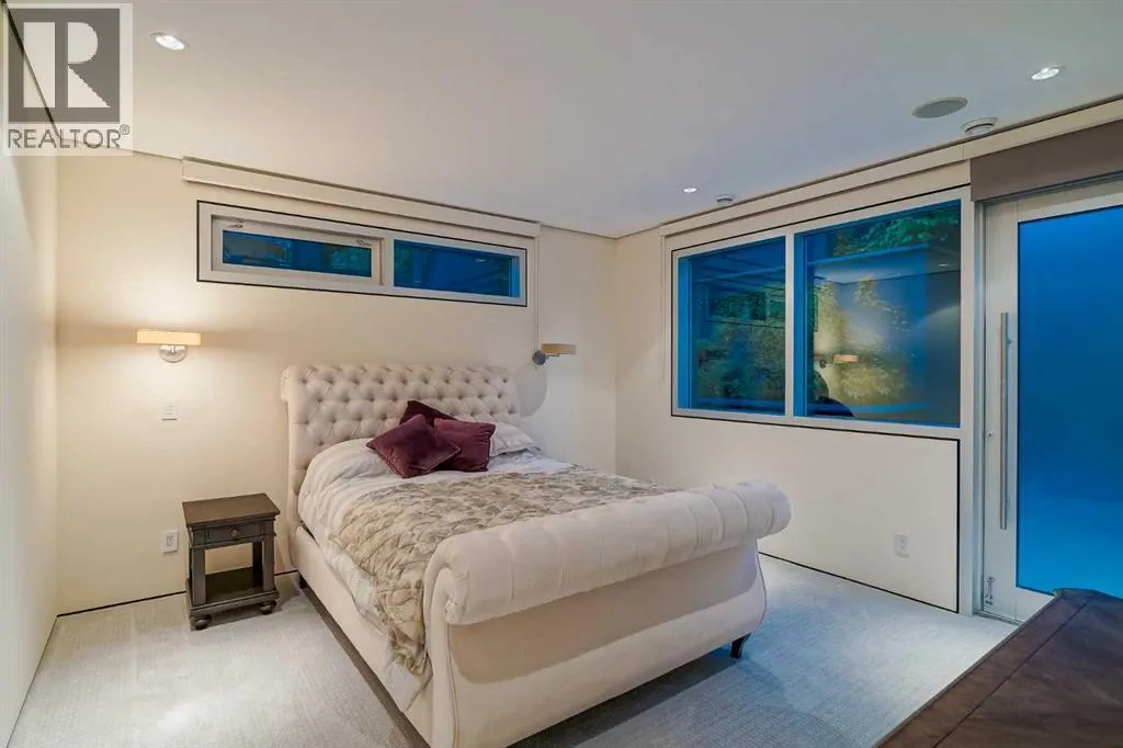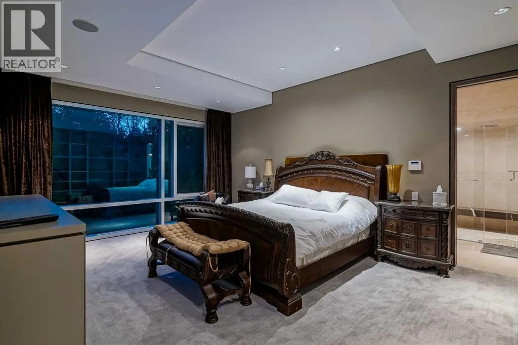 An unparalleled masterpiece in Upper Mount Royal, proudly overlooking the serene beauty of Cartier Park. This is more than a home; it's a statement of exquisite taste and refined living, where over 7,000 sq ft of developed space seamlessly blends style, sophistication, and luxurious amenities. Step into a realm of exclusive privacy and security, beginning with a rare geothermal heating system that extends to the front stairs, and walkway. Inside, discover a grand layout featuring 4 bedrooms plus a versatile flex room, 5 full baths, 2 half baths, and the convenience of an elevator. Architectural brilliance shines through with 10ft+ vaulted and barreled ceilings, complemented by rich oak, marble, and porcelain tile flooring. This is a true Smart Home, offering integrated control over security, heating, lighting, sound systems, TVs, camera surveillance. The welcoming front entrance opens to a dramatic free-standing staircase leading to the main floor's expansive living room, boasting sweeping park views and a double-sided gas fireplace shared with a cozy family room. The family room extends to a sunny west-facing patio, flowing into an ultra-modern kitchen equipped with top-tier Miele and Sub-Zero appliances, granite countertops, lacquered cabinets, an island with a pop-up TV, and two butlerâs pantries. The formal dining room invites grand entertaining, opening onto a patio with an outdoor kitchen and a stunning water feature. The main floor primary suite is a private sanctuary, featuring a spa-like ensuite with a steam shower, dual sinks, a large walk-in closet, and a vanity with a behind-mirror TV. A second main floor bedroom with ensuite, a spacious laundry room, and an elegant powder room with an under-lit onyx countertop complete this level. The upper floor reveals two more generous bedrooms, each with an ensuite, alongside a large, naturally lit bonus room. Descend to the first floor to find an impressive, park-view gym, a Swim-in-Place lap pool with an underwate r treadmill, a steam room, and a changing room. Entertainment awaits in the state-of-the-art theatre, boasting 5G projection, 15 plush recliners, a wet bar with a U-line fridge, and a dedicated A/V security room. This level also includes a large, productive office space. The lower floor is a connoisseur's dream, featuring an air-conditioned, humidified wine room and direct access to a 5-car garage with a power rotating platform, a Tesla electric car charger, ample recreational vehicle parking, and even a convenient dog wash. Additional luxuries include hot water on-demand with two storage tanks, a soft water system, and sun-protective automatic awnings on the back patio and front balcony. The back yard is enhanced by a 3-burner BBQ with gas side burners and elegant waterfall. This is a truly one-of-a-kind home in one of Calgary's most prestigious communities. Its incredible location offers access to designated schools, trendy 17th Ave and ease of access to downtown. (id:27476)