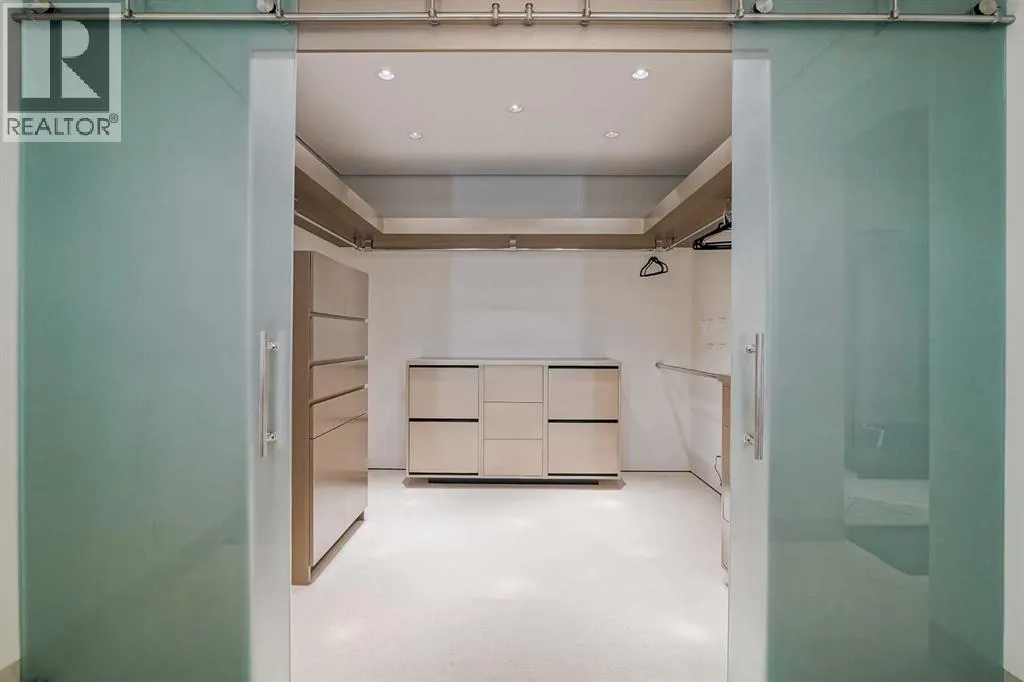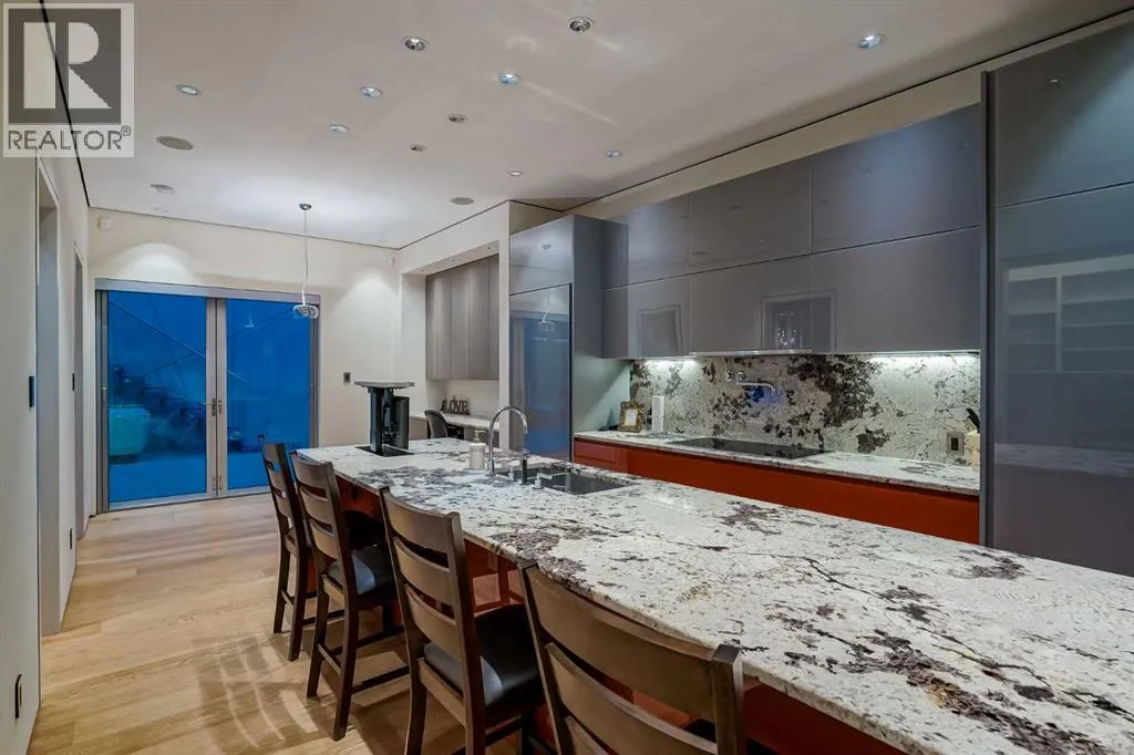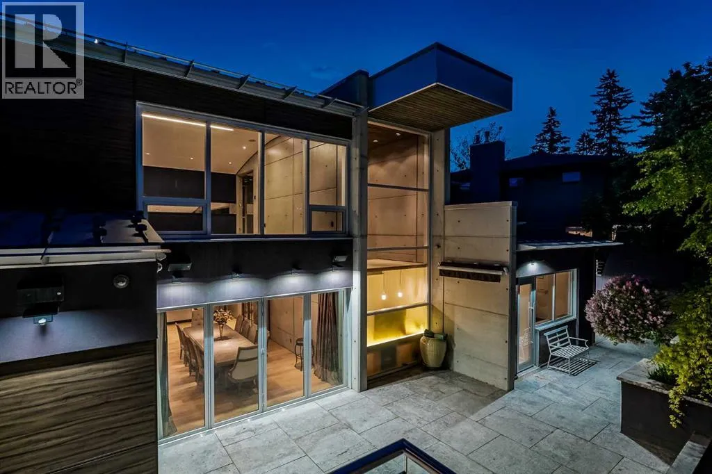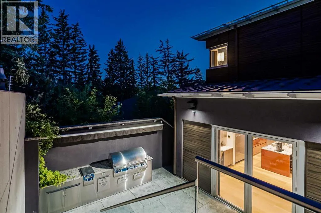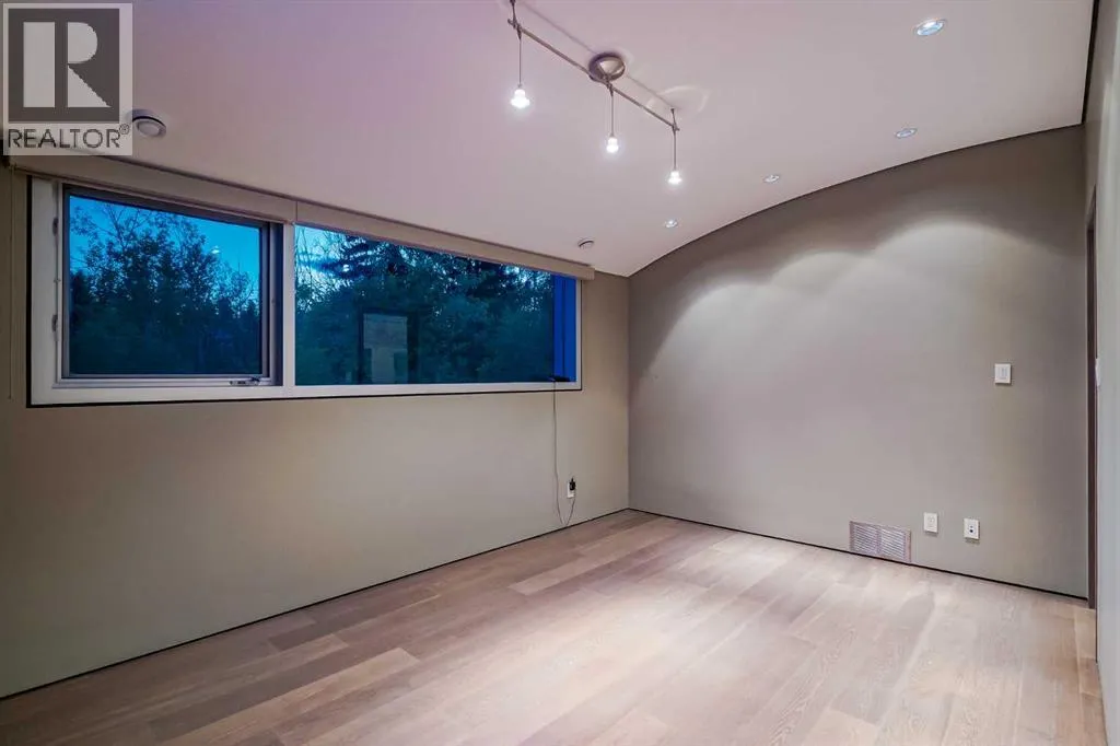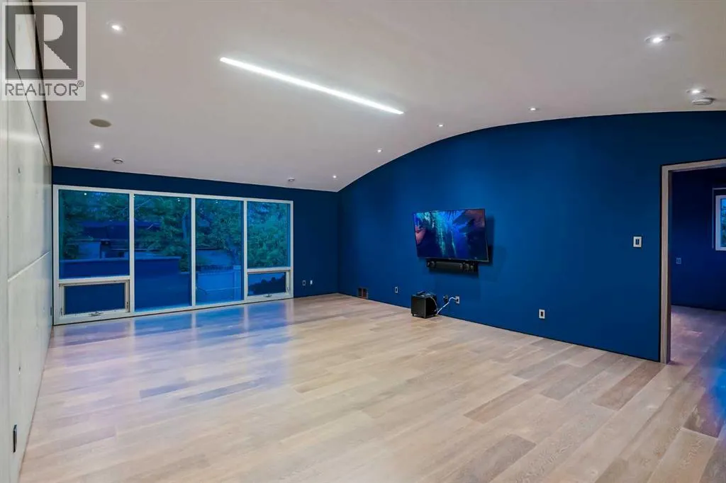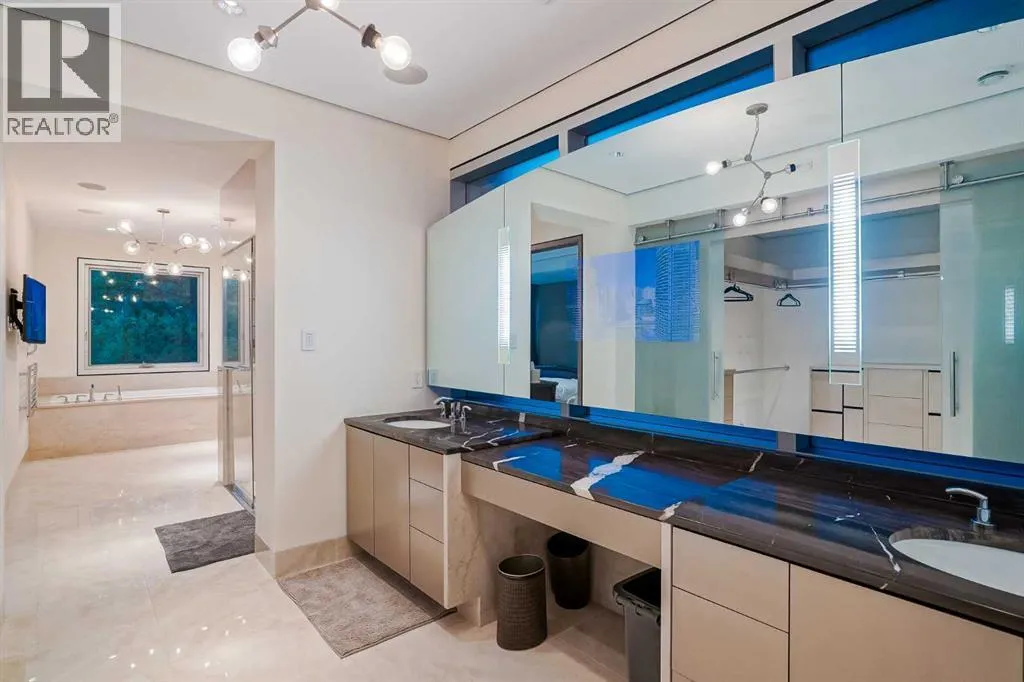 An unparalleled masterpiece in Upper Mount Royal, proudly overlooking the serene beauty of Cartier Park. This is more than a home; it's a statement of exquisite taste and refined living, where over 7,000 sq ft of developed space seamlessly blends style, sophistication, and luxurious amenities. Step into a realm of exclusive privacy and security, beginning with a rare geothermal heating system that extends to the front stairs, and walkway. Inside, discover a grand layout featuring 4 bedrooms plus a versatile flex room, 5 full baths, 2 half baths, and the convenience of an elevator. Architectural brilliance shines through with 10ft+ vaulted and barreled ceilings, complemented by rich oak, marble, and porcelain tile flooring. This is a true Smart Home, offering integrated control over security, heating, lighting, sound systems, TVs, camera surveillance. The welcoming front entrance opens to a dramatic free-standing staircase leading to the main floor's expansive living room, boasting sweeping park views and a double-sided gas fireplace shared with a cozy family room. The family room extends to a sunny west-facing patio, flowing into an ultra-modern kitchen equipped with top-tier Miele and Sub-Zero appliances, granite countertops, lacquered cabinets, an island with a pop-up TV, and two butlerâs pantries. The formal dining room invites grand entertaining, opening onto a patio with an outdoor kitchen and a stunning water feature. The main floor primary suite is a private sanctuary, featuring a spa-like ensuite with a steam shower, dual sinks, a large walk-in closet, and a vanity with a behind-mirror TV. A second main floor bedroom with ensuite, a spacious laundry room, and an elegant powder room with an under-lit onyx countertop complete this level. The upper floor reveals two more generous bedrooms, each with an ensuite, alongside a large, naturally lit bonus room. Descend to the first floor to find an impressive, park-view gym, a Swim-in-Place lap pool with an underwate r treadmill, a steam room, and a changing room. Entertainment awaits in the state-of-the-art theatre, boasting 5G projection, 15 plush recliners, a wet bar with a U-line fridge, and a dedicated A/V security room. This level also includes a large, productive office space. The lower floor is a connoisseur's dream, featuring an air-conditioned, humidified wine room and direct access to a 5-car garage with a power rotating platform, a Tesla electric car charger, ample recreational vehicle parking, and even a convenient dog wash. Additional luxuries include hot water on-demand with two storage tanks, a soft water system, and sun-protective automatic awnings on the back patio and front balcony. The back yard is enhanced by a 3-burner BBQ with gas side burners and elegant waterfall. This is a truly one-of-a-kind home in one of Calgary's most prestigious communities. Its incredible location offers access to designated schools, trendy 17th Ave and ease of access to downtown. (id:27476)