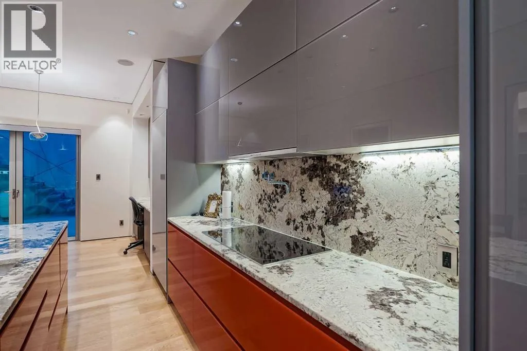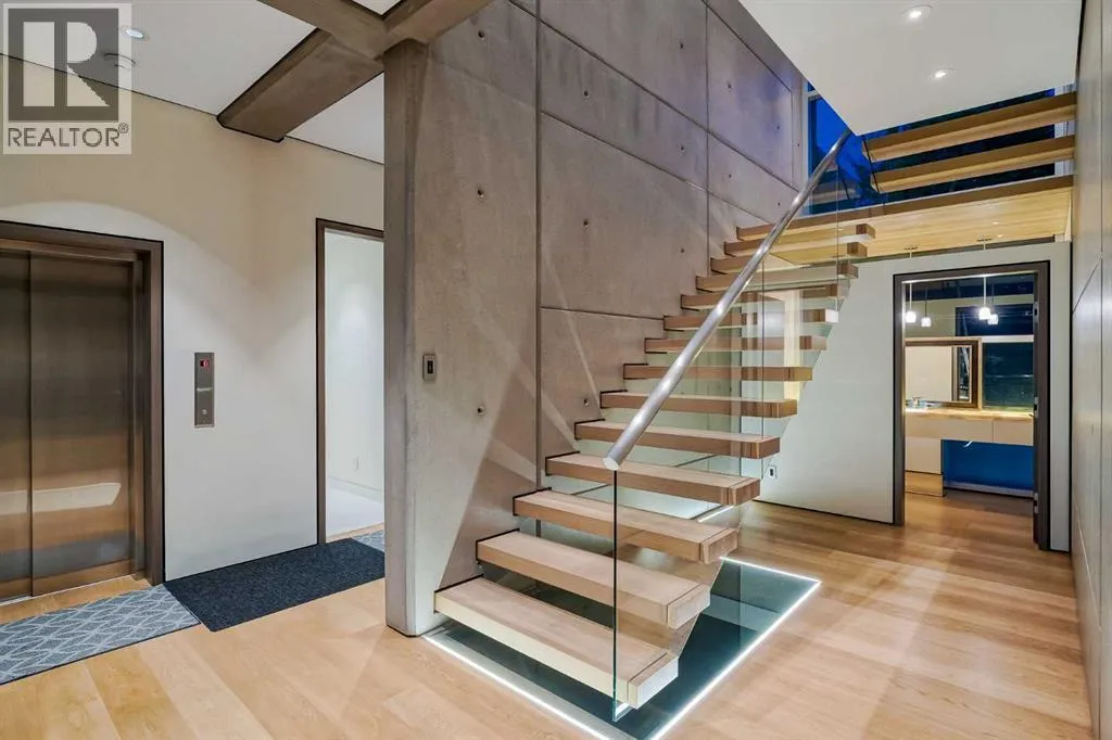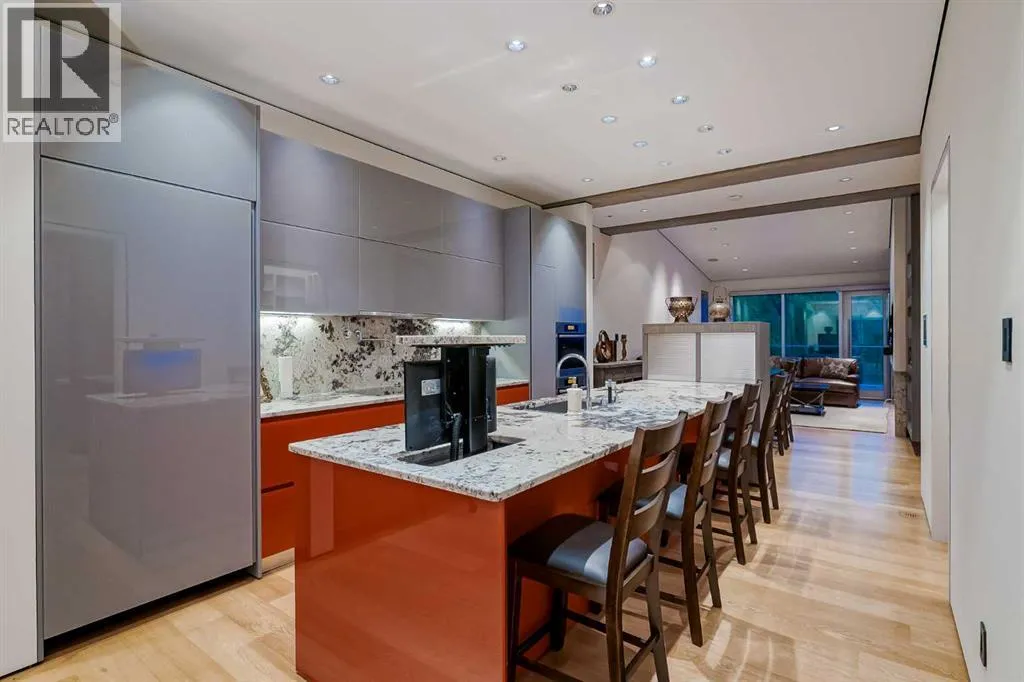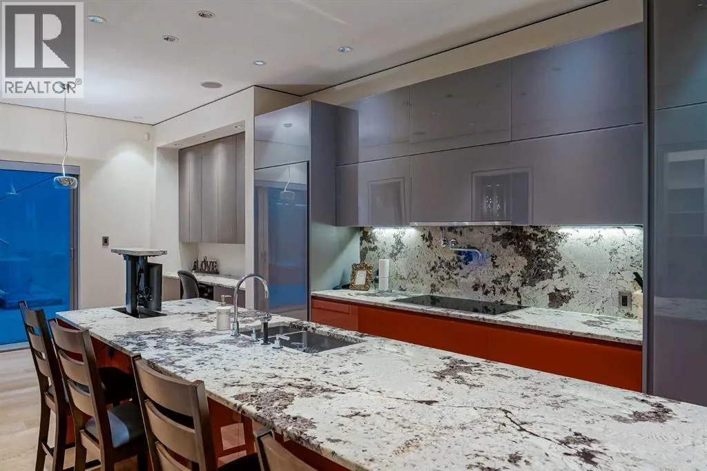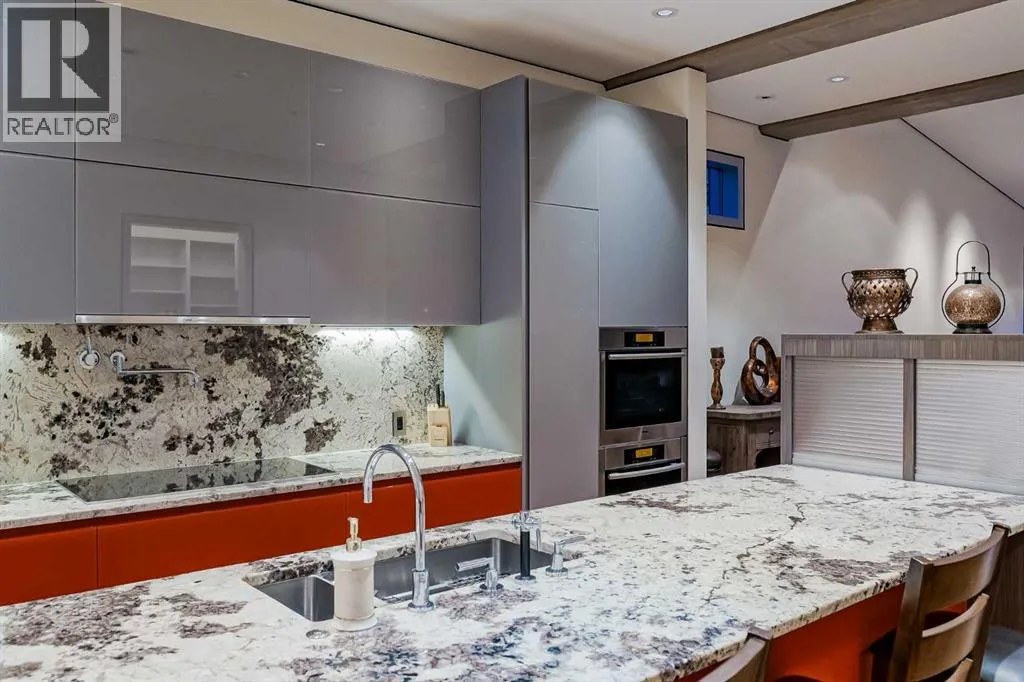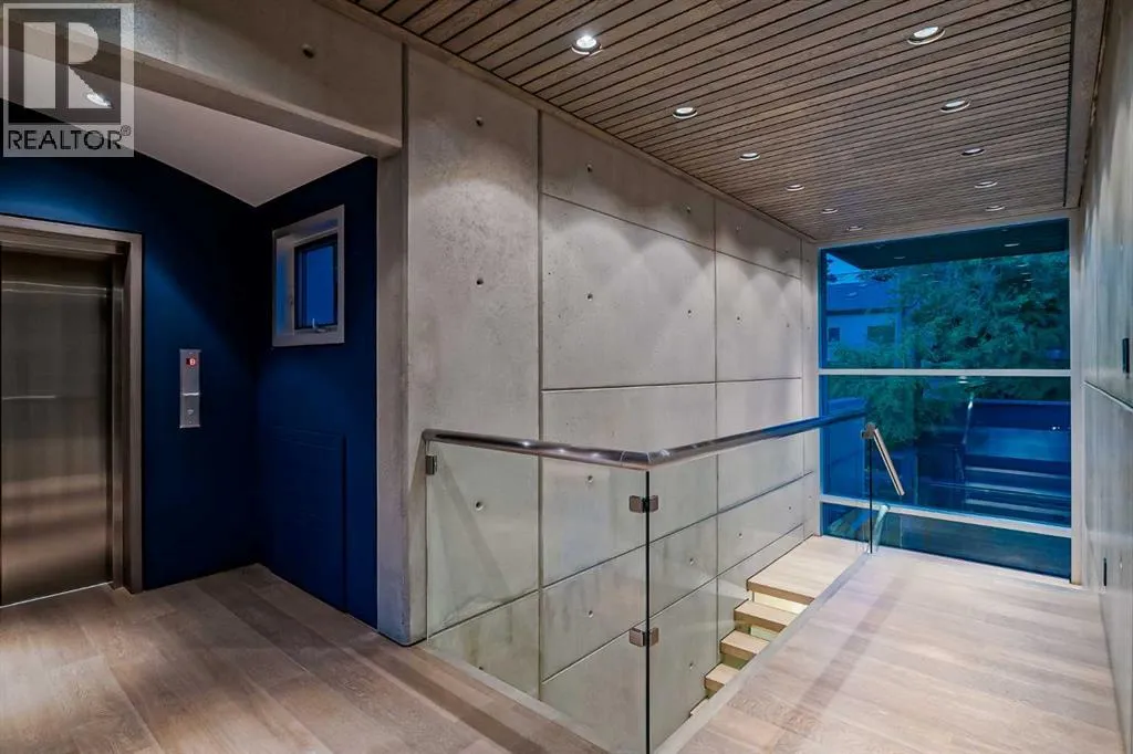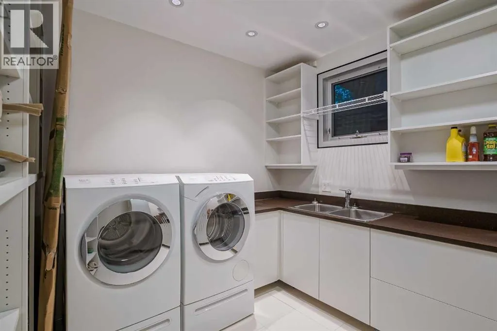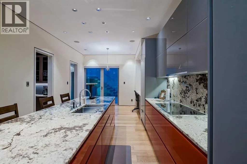 An unparalleled masterpiece in Upper Mount Royal, proudly overlooking the serene beauty of Cartier Park. This is more than a home; it's a statement of exquisite taste and refined living, where over 7,000 sq ft of developed space seamlessly blends style, sophistication, and luxurious amenities. Step into a realm of exclusive privacy and security, beginning with a rare geothermal heating system that extends to the front stairs, and walkway. Inside, discover a grand layout featuring 4 bedrooms plus a versatile flex room, 5 full baths, 2 half baths, and the convenience of an elevator. Architectural brilliance shines through with 10ft+ vaulted and barreled ceilings, complemented by rich oak, marble, and porcelain tile flooring. This is a true Smart Home, offering integrated control over security, heating, lighting, sound systems, TVs, camera surveillance. The welcoming front entrance opens to a dramatic free-standing staircase leading to the main floor's expansive living room, boasting sweeping park views and a double-sided gas fireplace shared with a cozy family room. The family room extends to a sunny west-facing patio, flowing into an ultra-modern kitchen equipped with top-tier Miele and Sub-Zero appliances, granite countertops, lacquered cabinets, an island with a pop-up TV, and two butlerâs pantries. The formal dining room invites grand entertaining, opening onto a patio with an outdoor kitchen and a stunning water feature. The main floor primary suite is a private sanctuary, featuring a spa-like ensuite with a steam shower, dual sinks, a large walk-in closet, and a vanity with a behind-mirror TV. A second main floor bedroom with ensuite, a spacious laundry room, and an elegant powder room with an under-lit onyx countertop complete this level. The upper floor reveals two more generous bedrooms, each with an ensuite, alongside a large, naturally lit bonus room. Descend to the first floor to find an impressive, park-view gym, a Swim-in-Place lap pool with an underwate r treadmill, a steam room, and a changing room. Entertainment awaits in the state-of-the-art theatre, boasting 5G projection, 15 plush recliners, a wet bar with a U-line fridge, and a dedicated A/V security room. This level also includes a large, productive office space. The lower floor is a connoisseur's dream, featuring an air-conditioned, humidified wine room and direct access to a 5-car garage with a power rotating platform, a Tesla electric car charger, ample recreational vehicle parking, and even a convenient dog wash. Additional luxuries include hot water on-demand with two storage tanks, a soft water system, and sun-protective automatic awnings on the back patio and front balcony. The back yard is enhanced by a 3-burner BBQ with gas side burners and elegant waterfall. This is a truly one-of-a-kind home in one of Calgary's most prestigious communities. Its incredible location offers access to designated schools, trendy 17th Ave and ease of access to downtown. (id:27476)